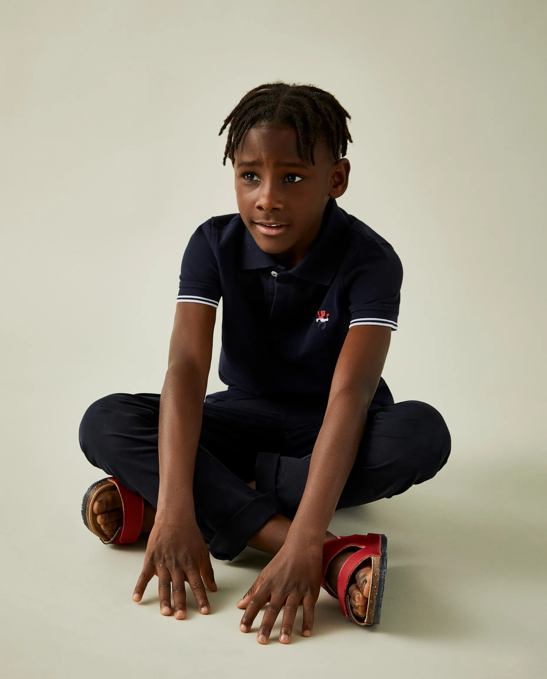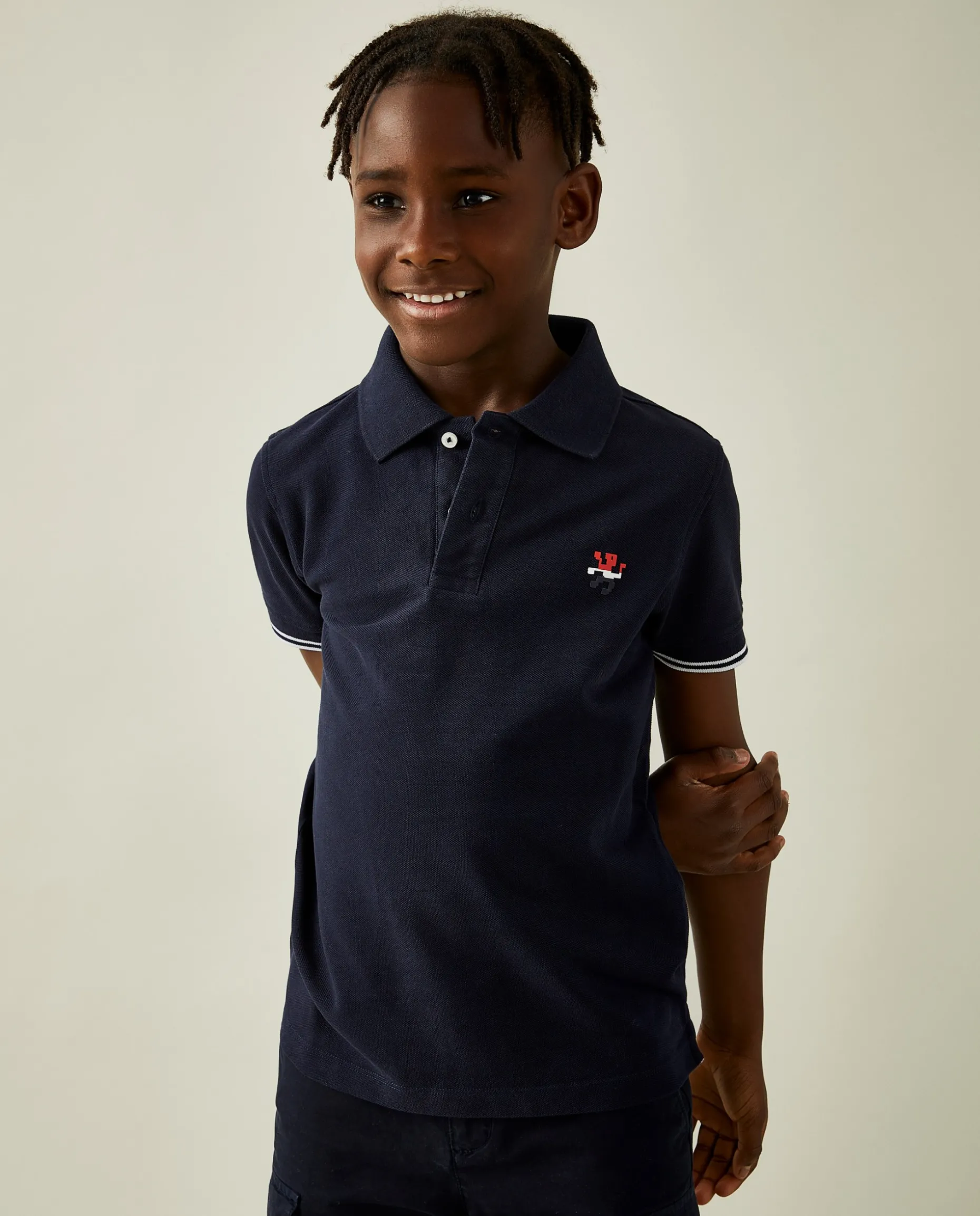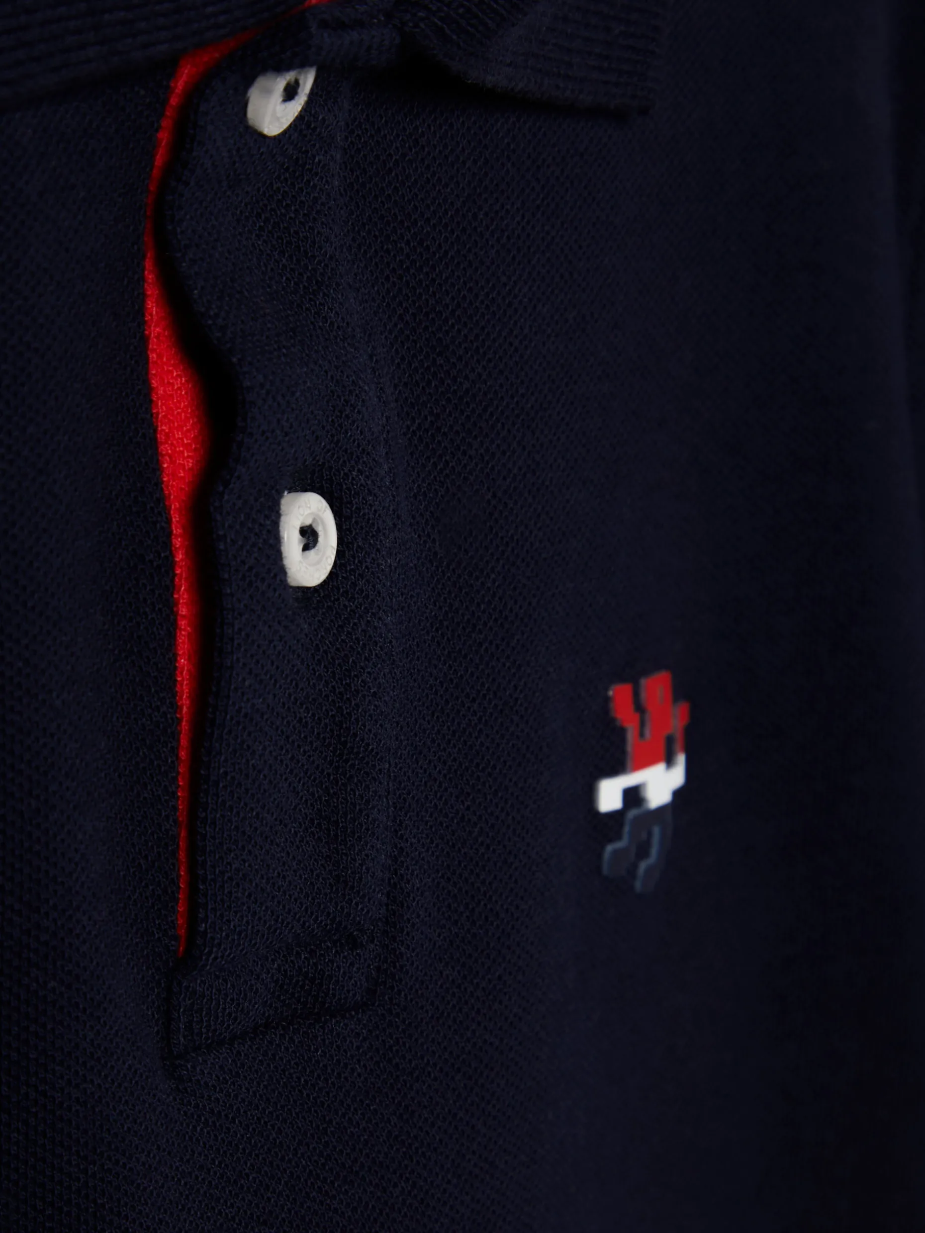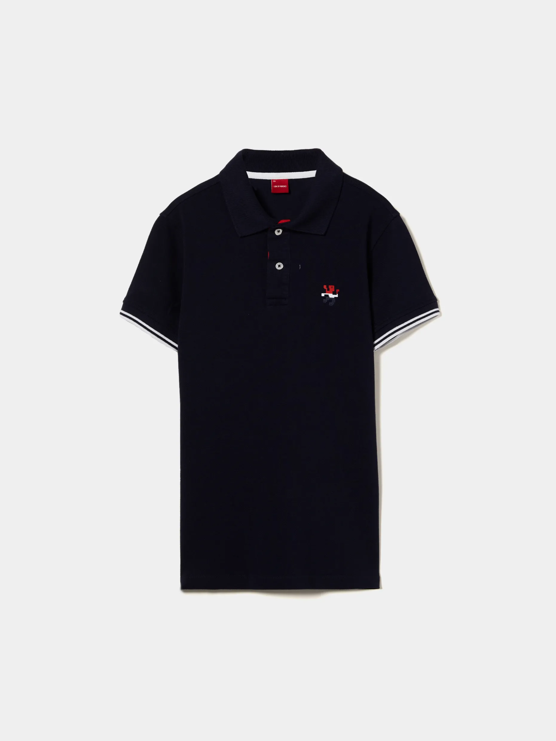 Polo de manga curta liso, com pormenor diferenciador de riscas em contraste nas mangas. Aperta no decote com dois botões, com carcela em contraste de cor, e finaliza com leão da marca tricolor no peito. É confecionado em algodão para maior suavidade, conforto e durabilidade.