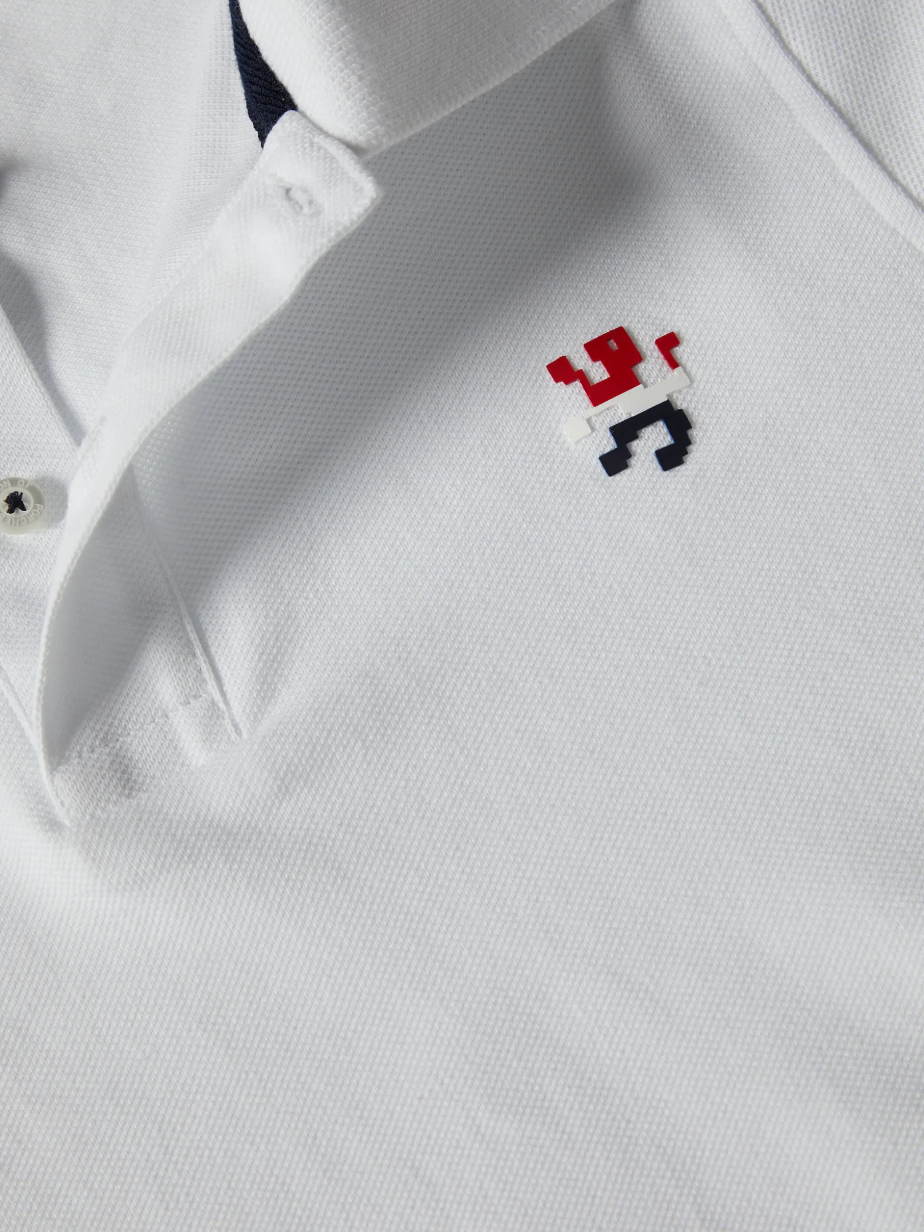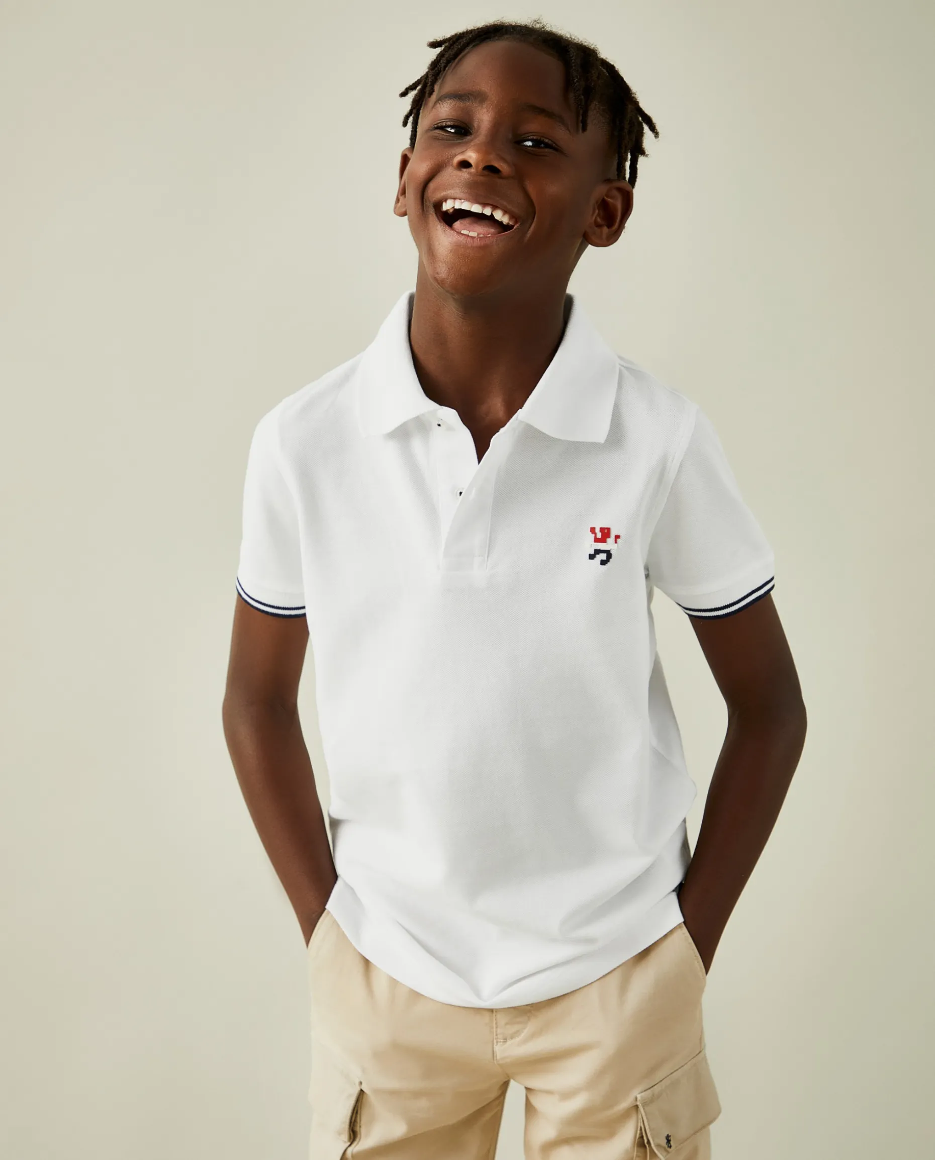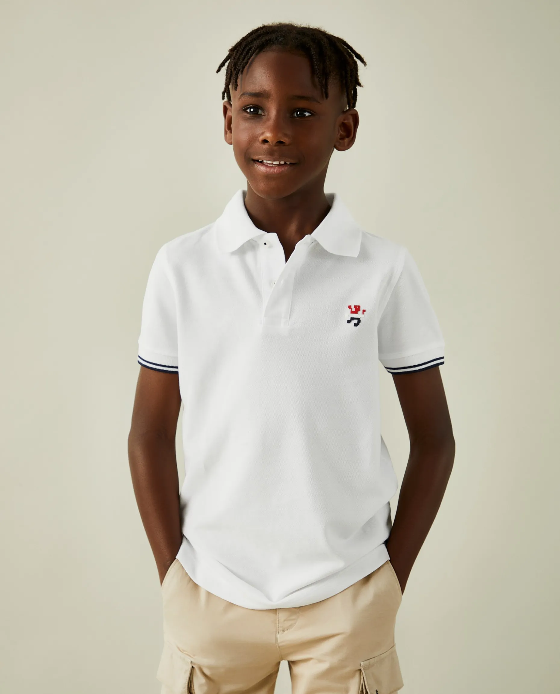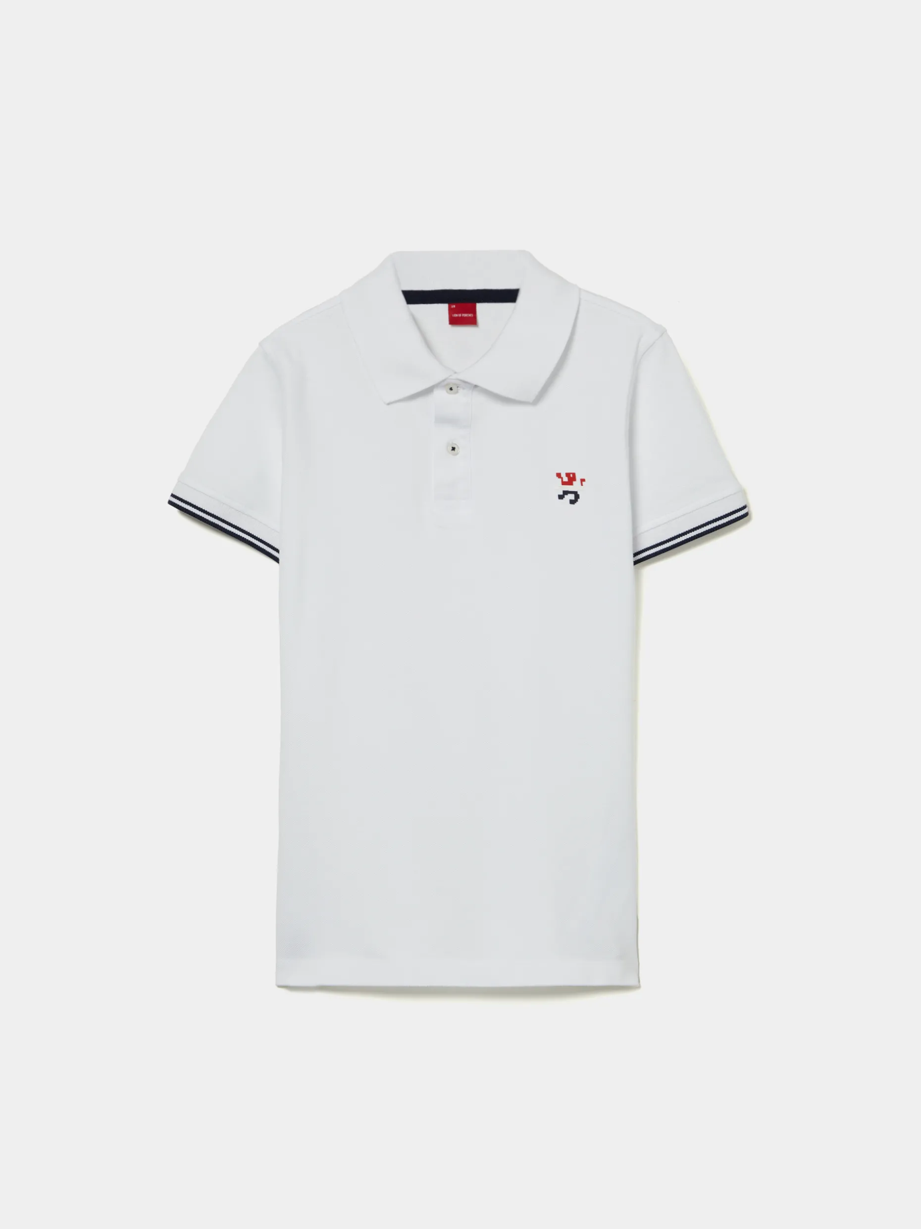 Polo de manga curta liso, com pormenor diferenciador de riscas em contraste nas mangas. Aperta no decote com dois botões, com carcela em contraste de cor, e finaliza com leão da marca tricolor no peito. É confecionado em algodão para maior suavidade, conforto e durabilidade.