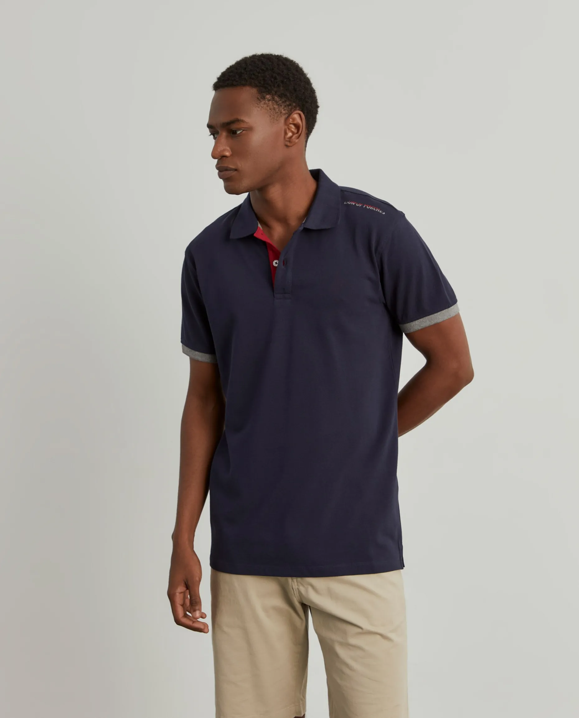Polo piqué, de manga curta, confecionado em algodão para maior conforto. Aperta com os tradicionais botões no decote. Pormenor diferenciador de risca em contraste nas mangas. Emblema da marca ao nível do ombro esquerdo. Disponível em várias cores.