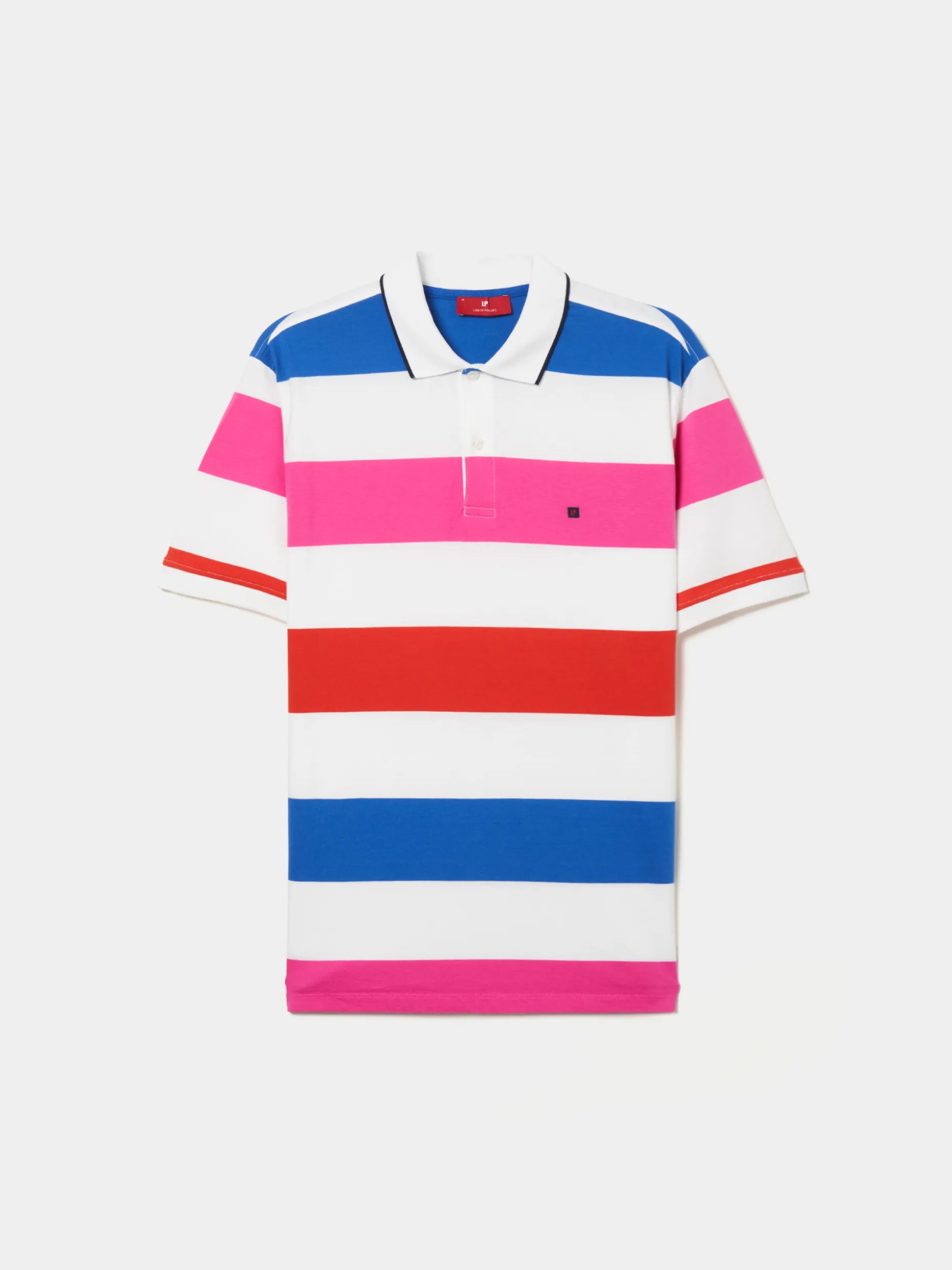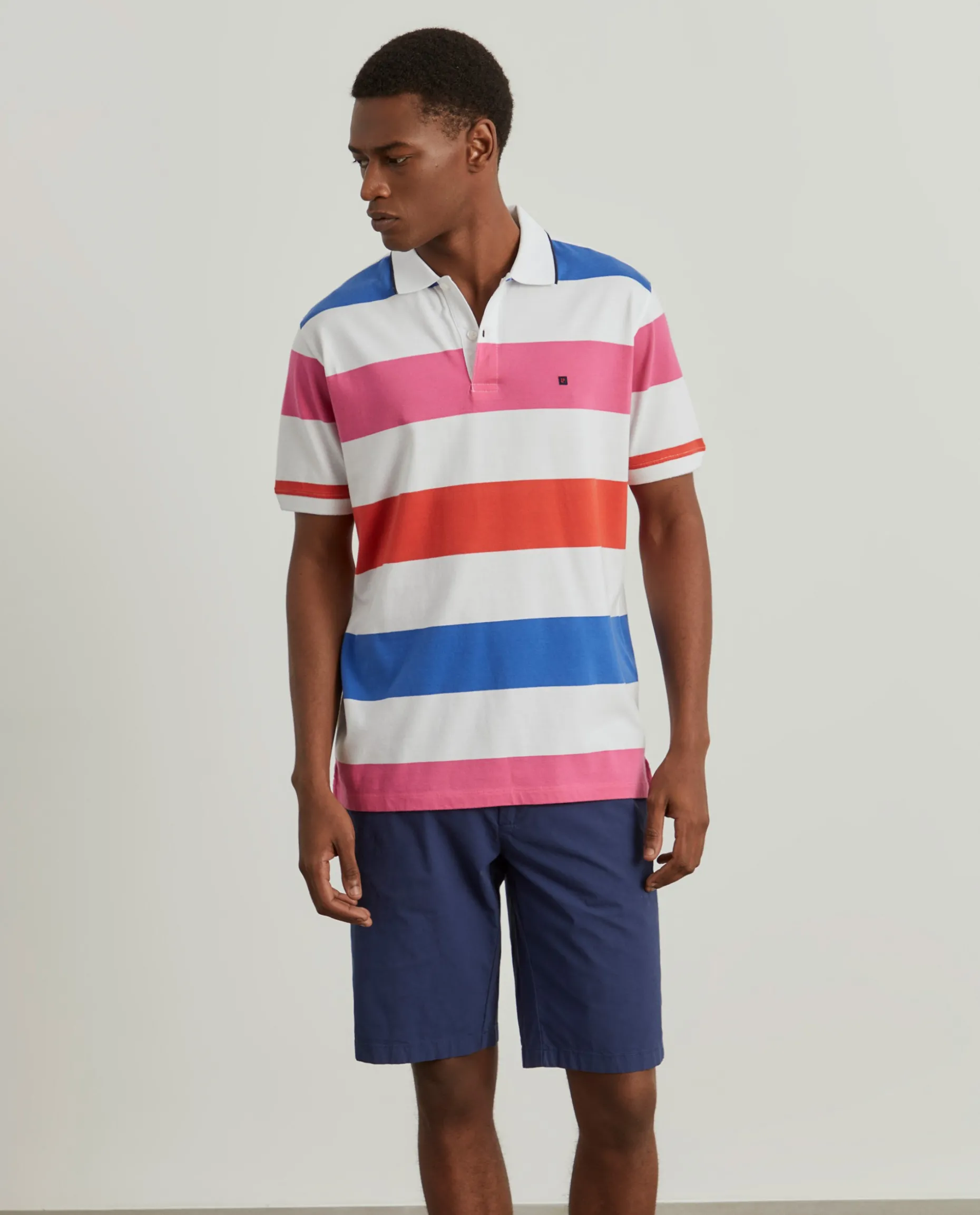 Polo de riscas em jersey de algodão mercerizado. Gola branca com risca marinha na extremidade. Rachas laterais e tapa costuras com fita de sarja em cor contrastante. Personalizado com pequeno bordado quadrado no peito.