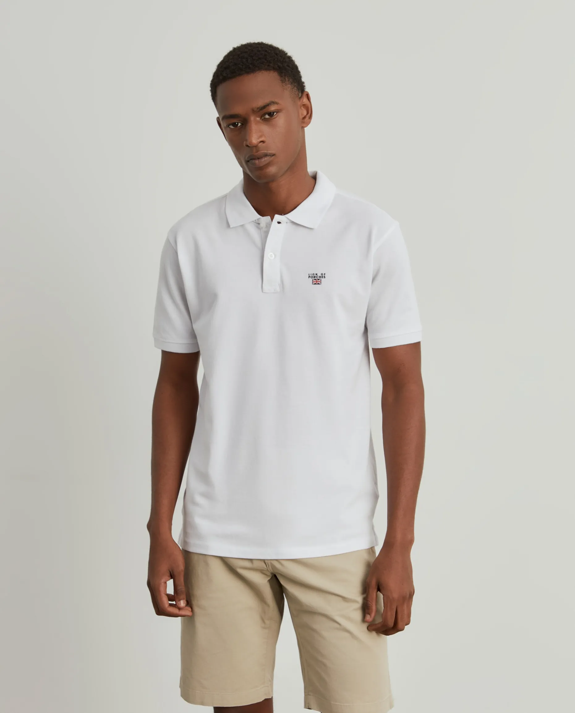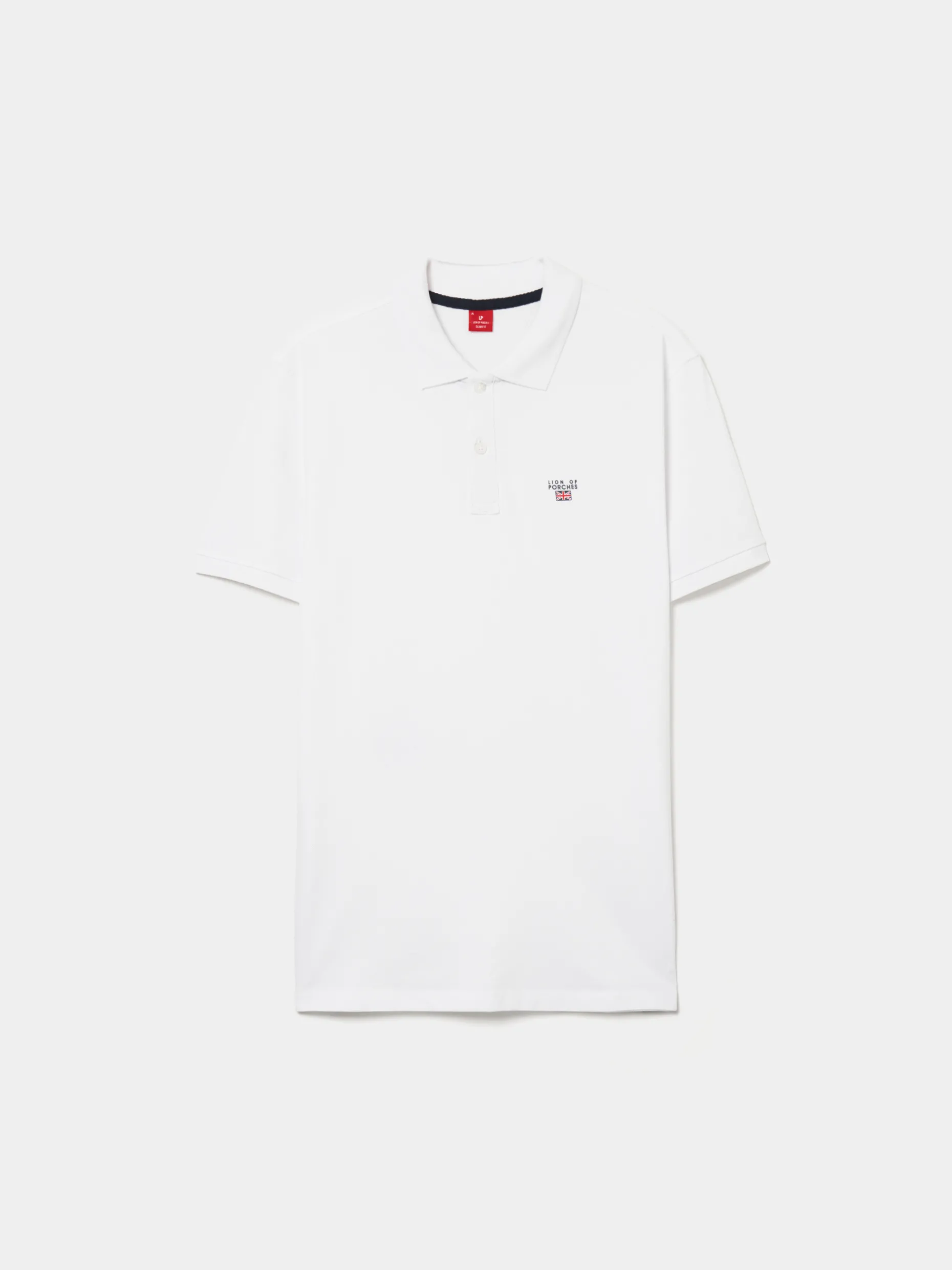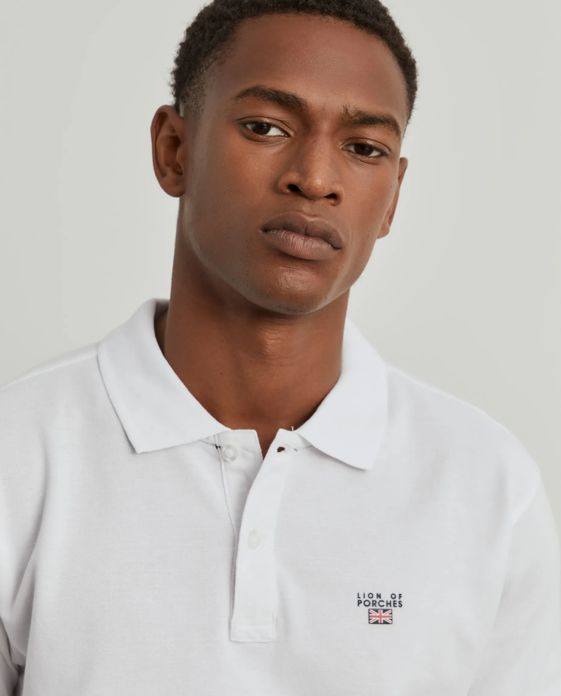 Polo slim fit de manga curta confecionado em 100% algodão. Aperta com dois botões no peito. Manga e gola canelada em contraste. Branding Lion of Porches no peito.