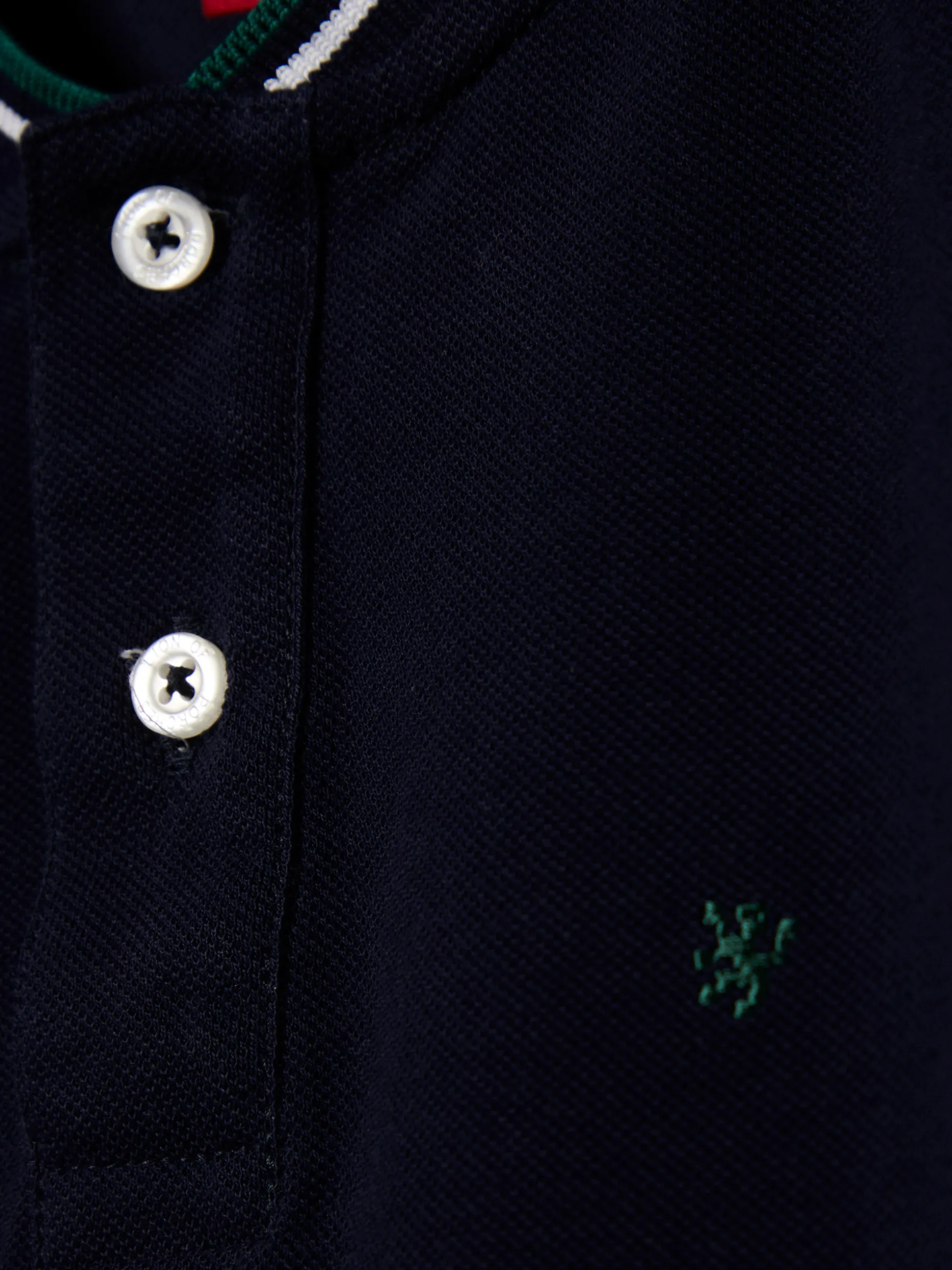 Para miúdos cheios de estilo propomos este polo slim fit de manga curta. Tem dois botões na gola e pormenor diferenciador de riscas em contraste, tanto na gola, como nas mangas. Finaliza com leão da marca bordado em contraste no peito.