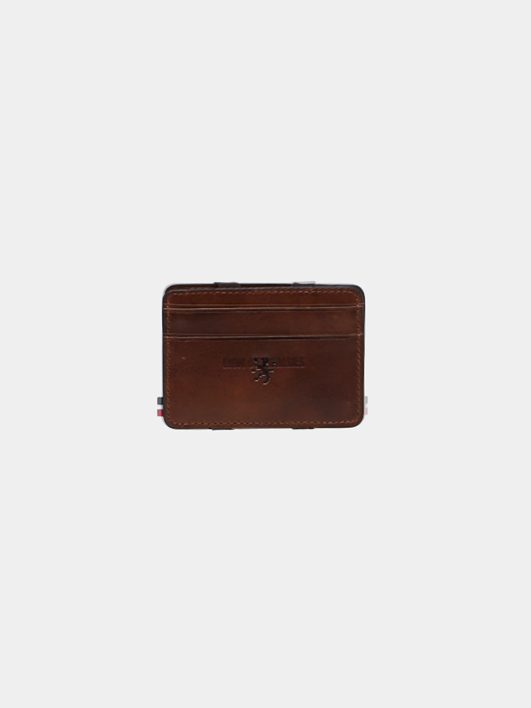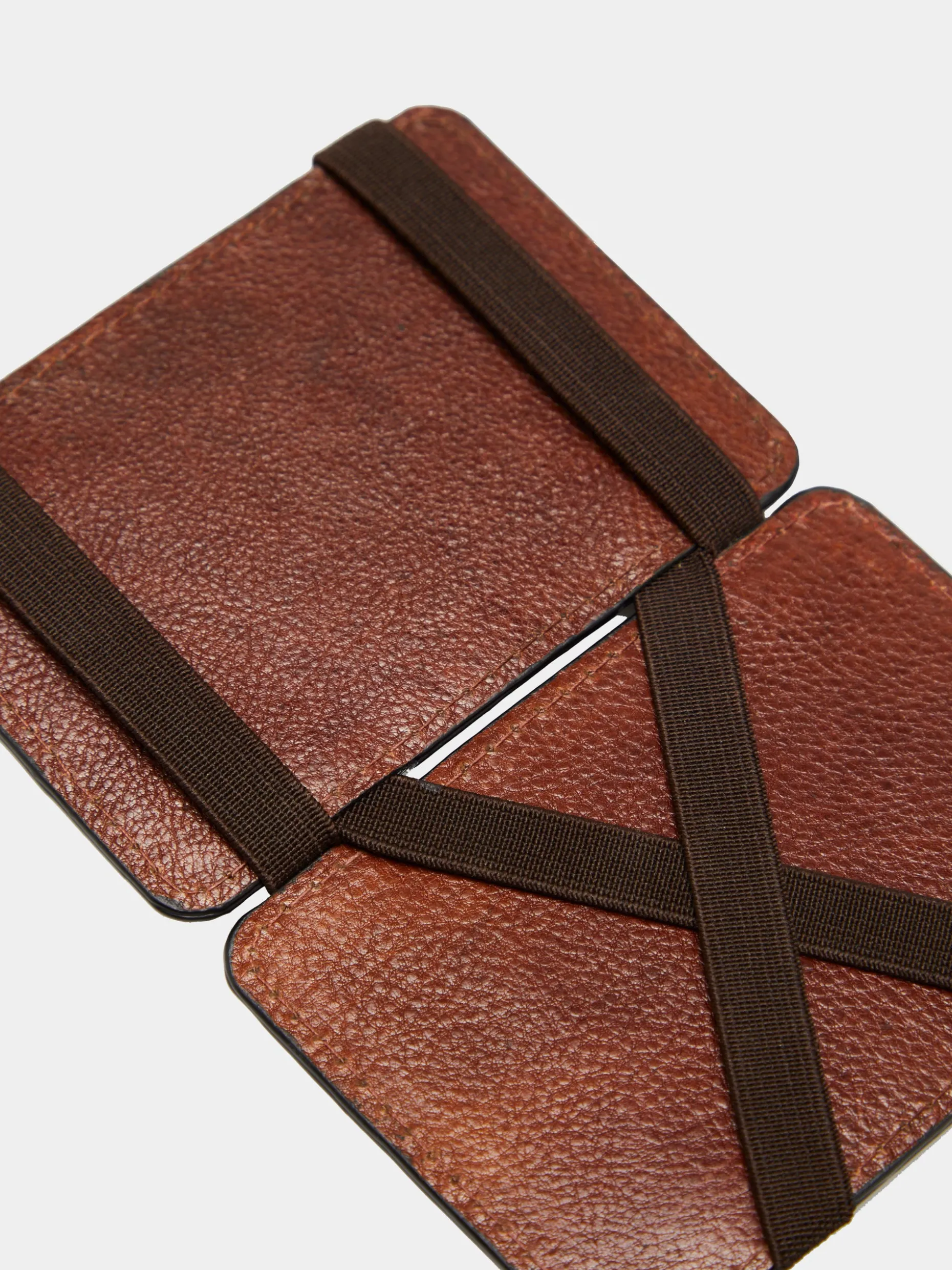Carteira 100% pele com detalhe de elástico e quatro ranhuras para cartões. Logotipos gravados e fita corporativa.