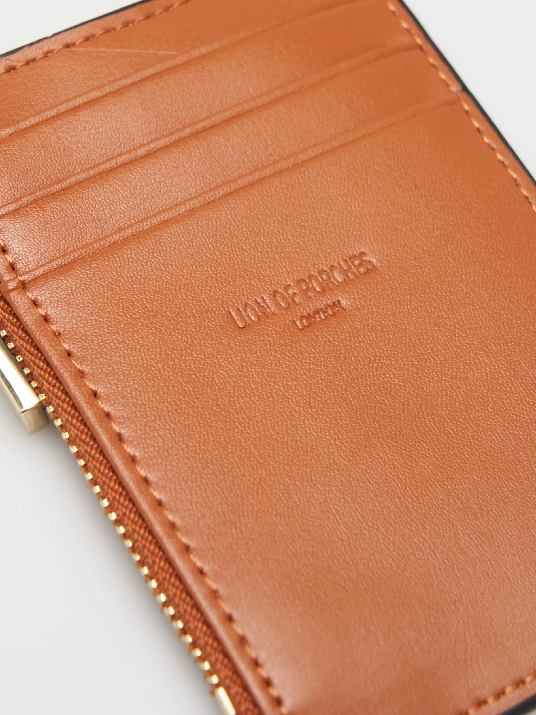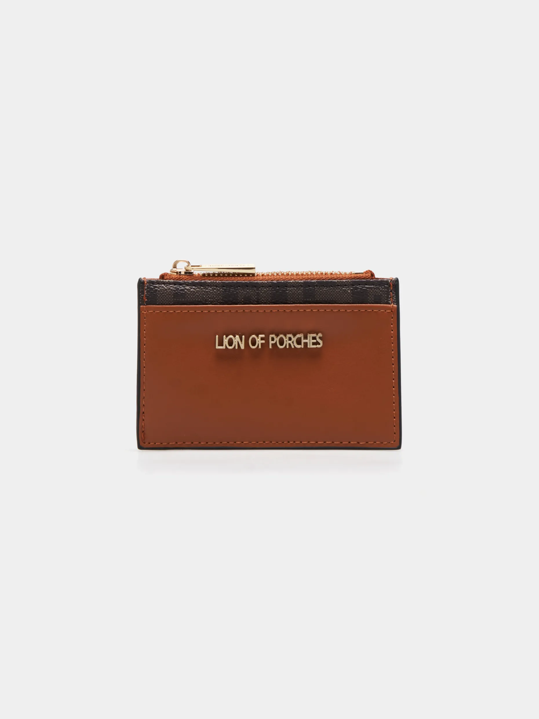 Porta-cartões de cor lisa combinado com monograma estampado e aplicação metálica Lion of Porches na frente. Compartimento superior com zíper e três ranhuras para cartões.