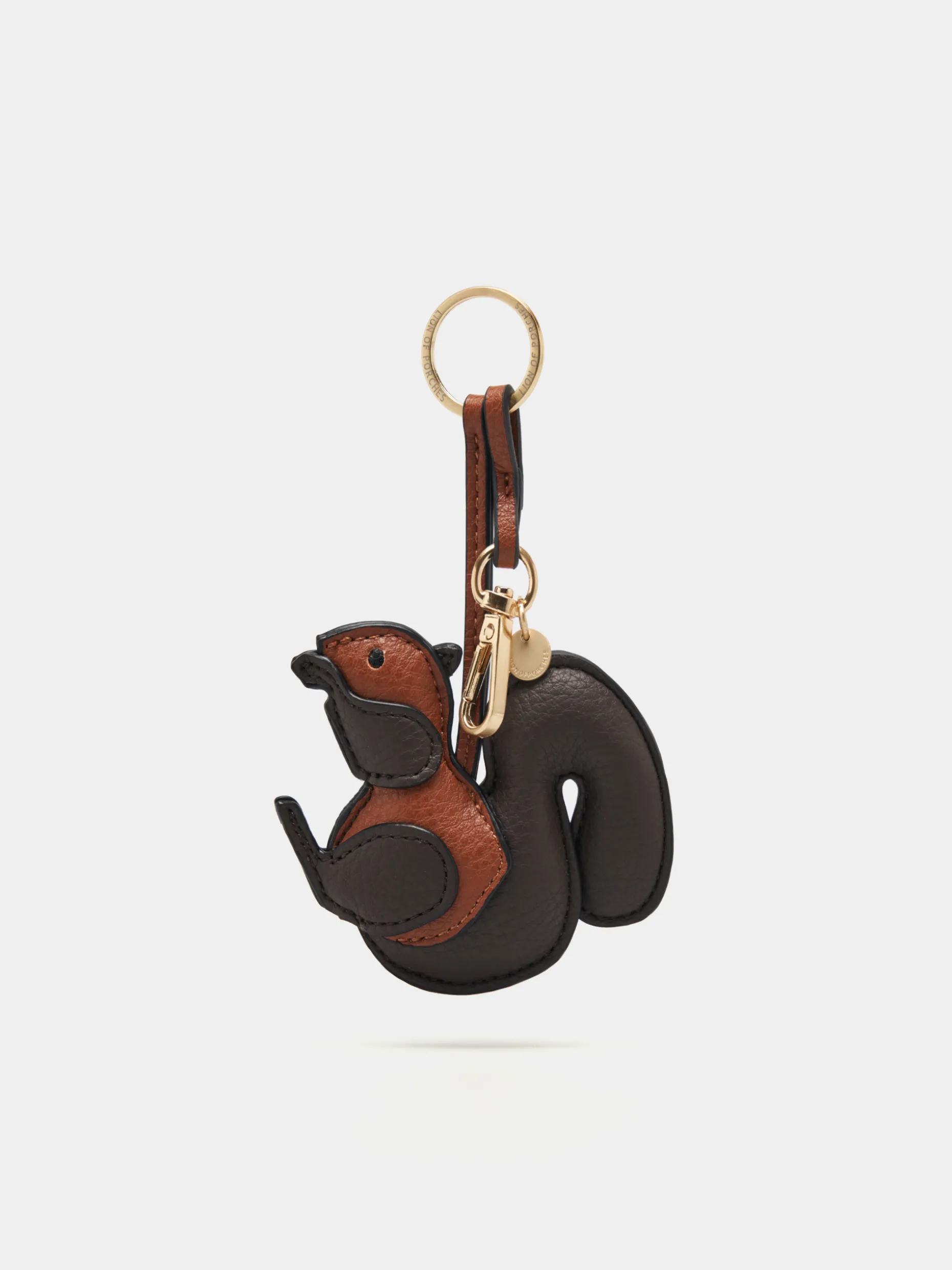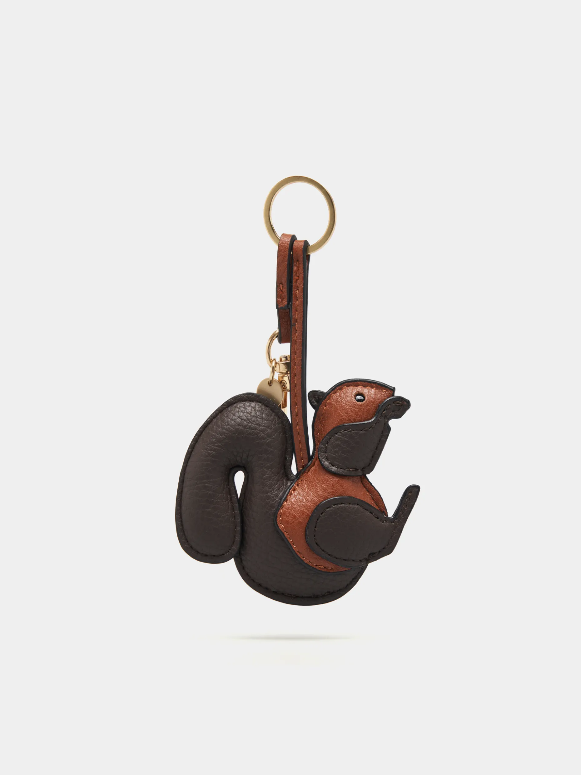 Porta-chaves efeito pele com formato de esquilo. Argola e mosquetão em dourado.