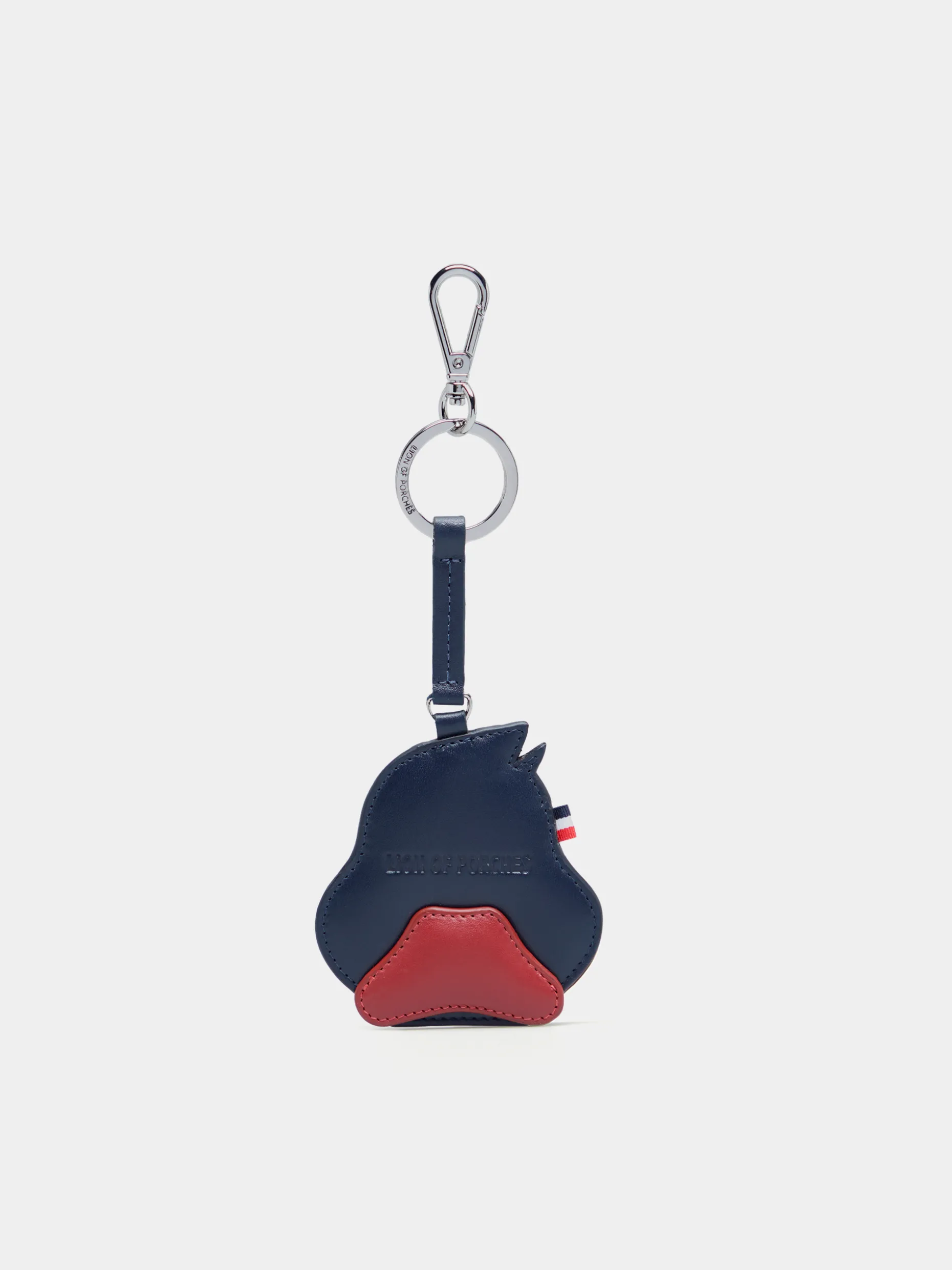 Porta-chaves 100% pele com forma de pato e com detalhes corporativos. Logotipo gravado a cunho na frente e anilha personalizada.