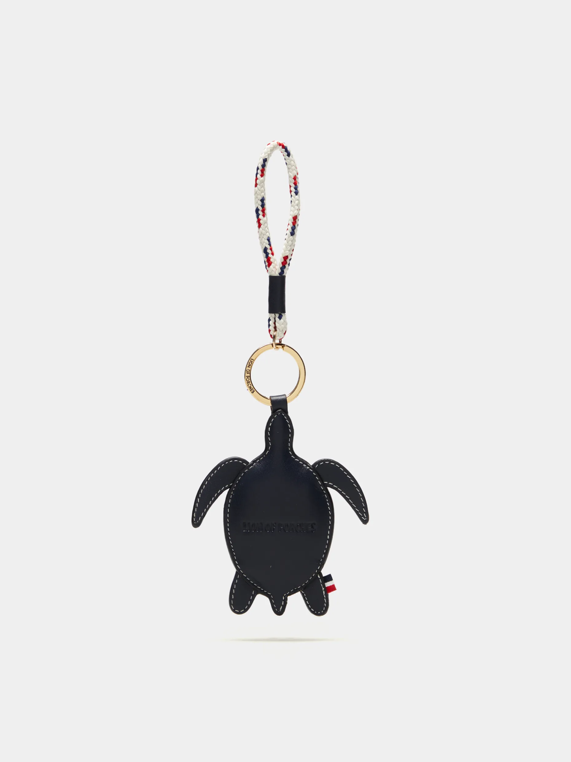 Porta-chaves 100% pele com forma de tartaruga e pespontos em contraste. Anilha personalizada e logotipo gravado a cunho na frente. Pormenor de cordão tricolor pendurado na anilha.