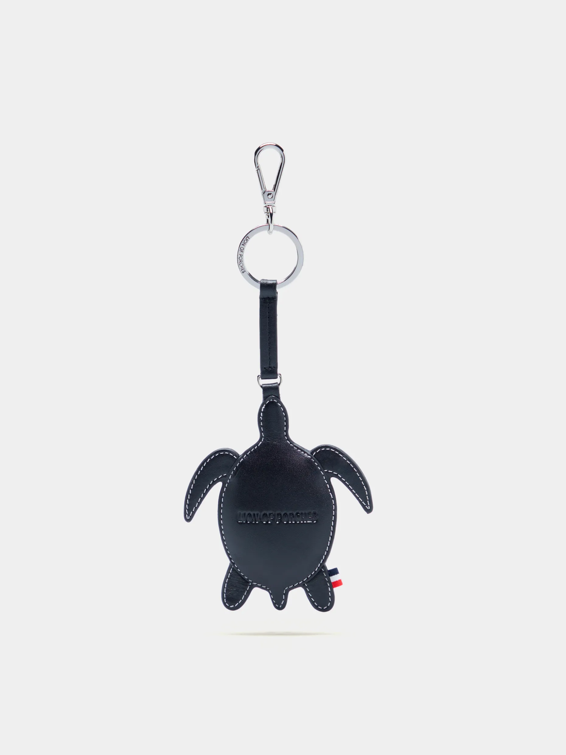 Porta-chaves 100% pele preta com forma de tartaruga e pespontos em contraste. Anilha personalizada e logotipo gravado a cunho na frente.