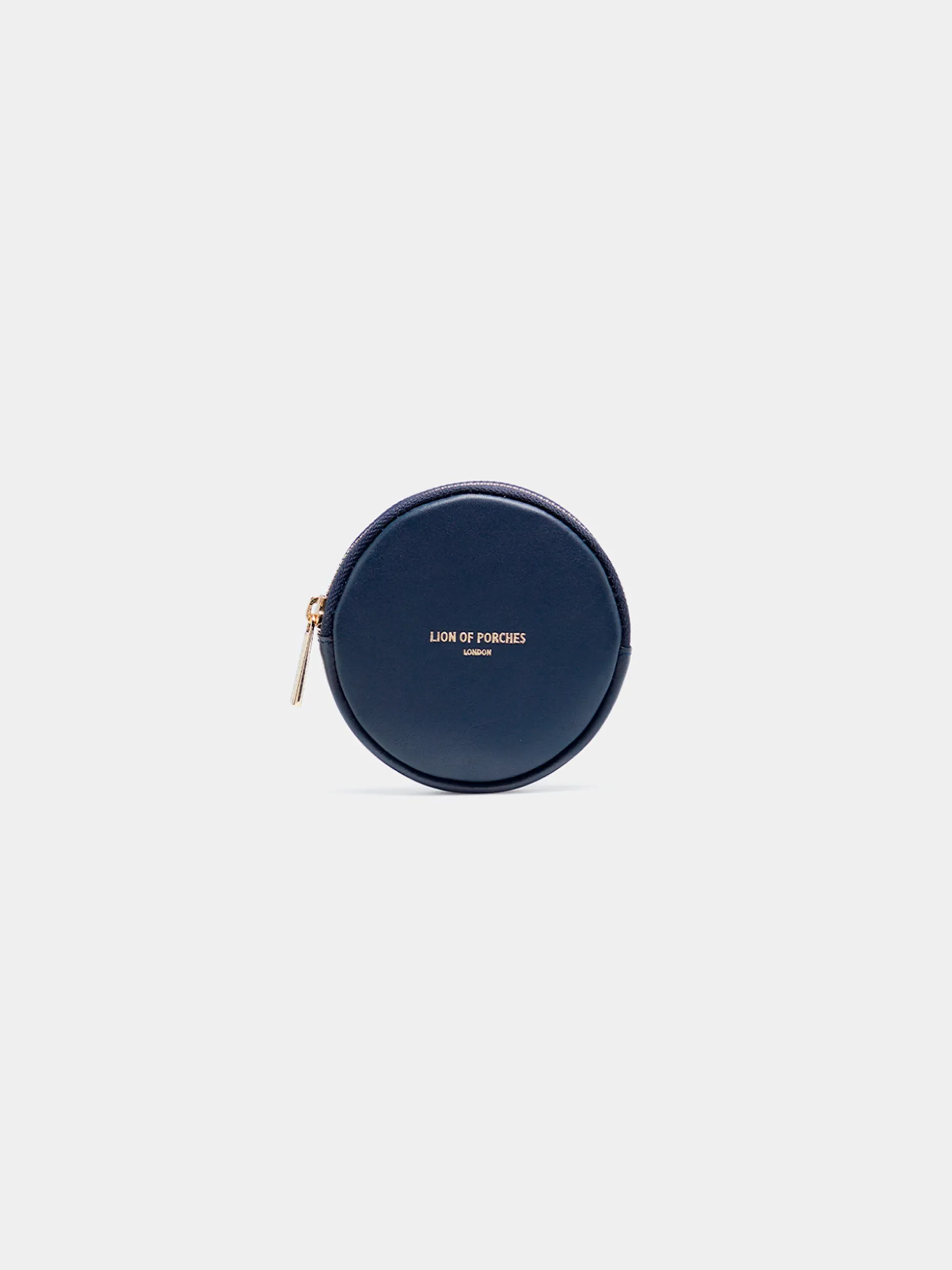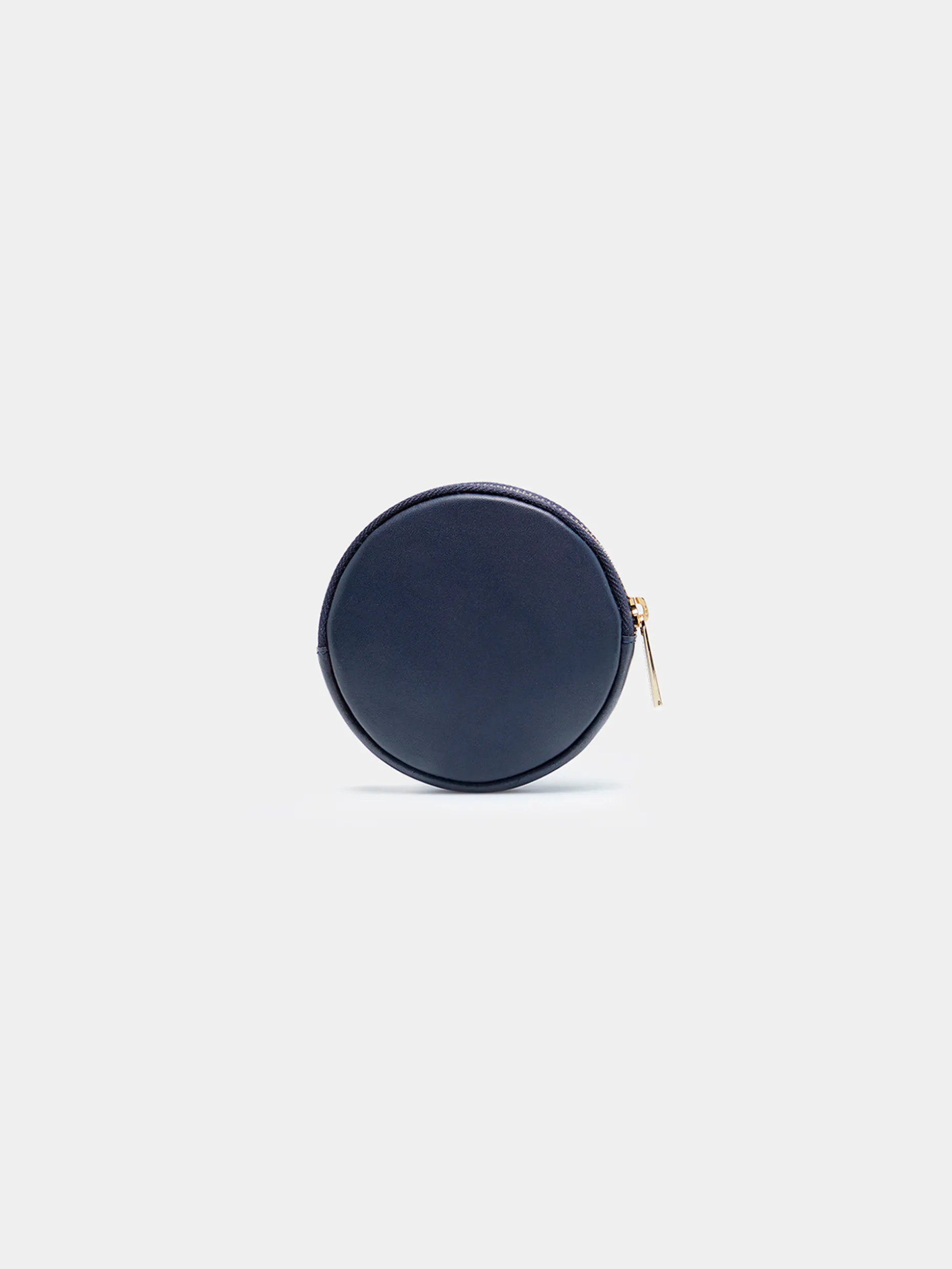 Porta-moedas circular 100% pele. Logotipo centrado e estampado a dourado na frente e fecho com zíper personalizado.
