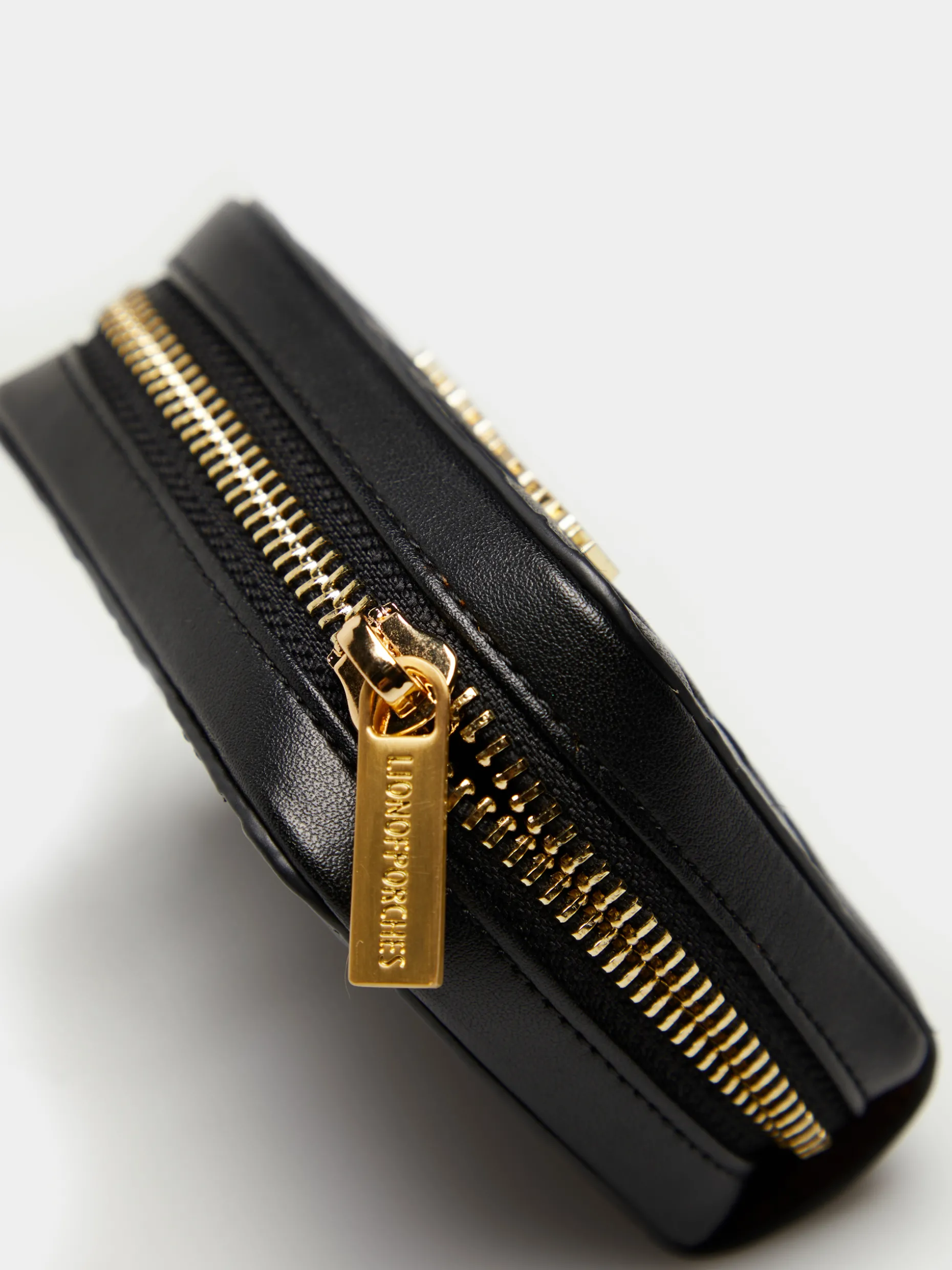 Porta-moedas preto com monograma gravado em relevo e logotipo dourado metálico aplicado na frente. Abertura em leque com fecho de correr. Zíper personalizado. Feito com matérias primas vegan.