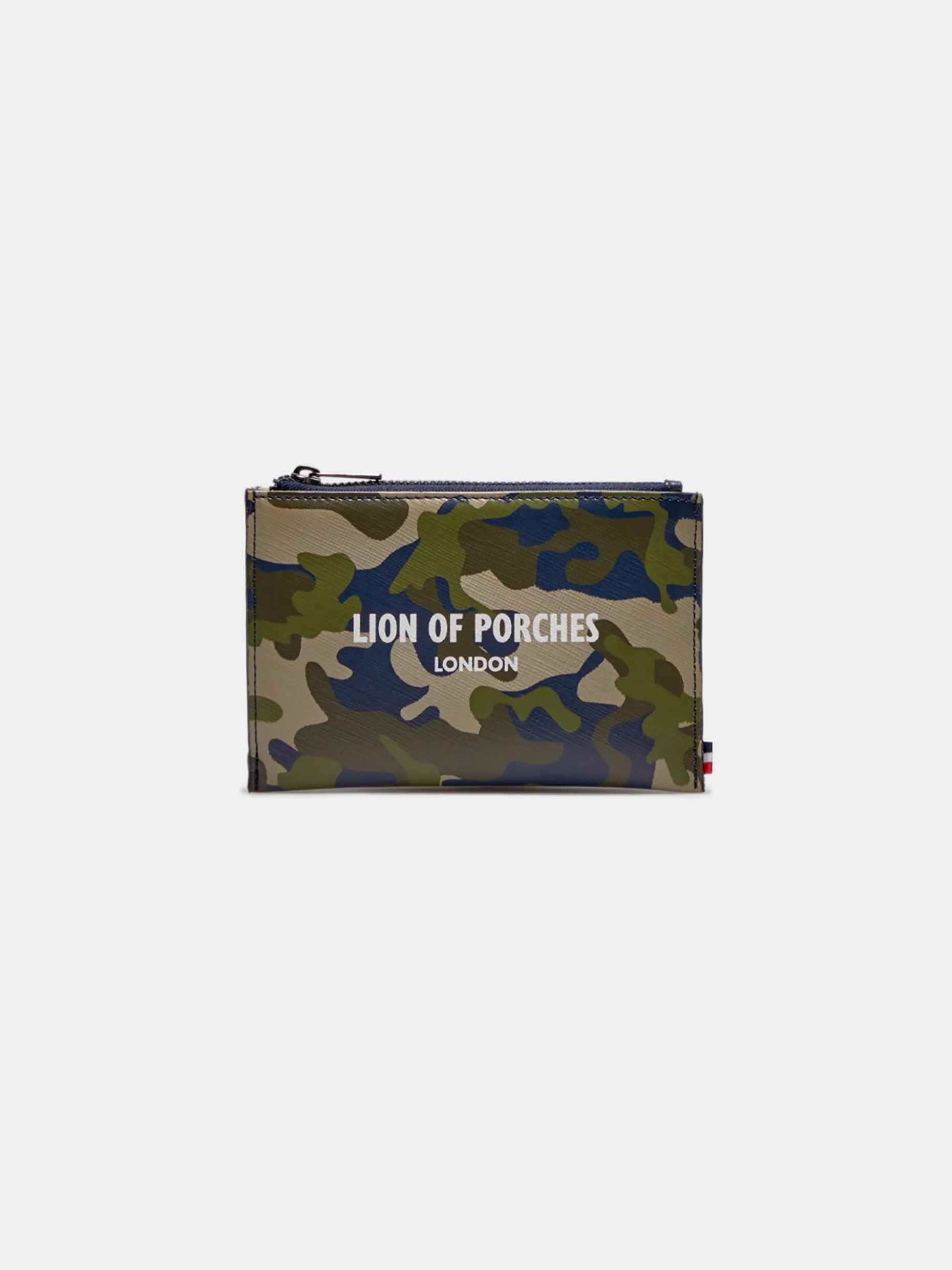Porta-moedas com padrão. Em pele. Fita tricolor personalizada na lateral. Fecho superior. Estampado Lion of Porches contrastante.