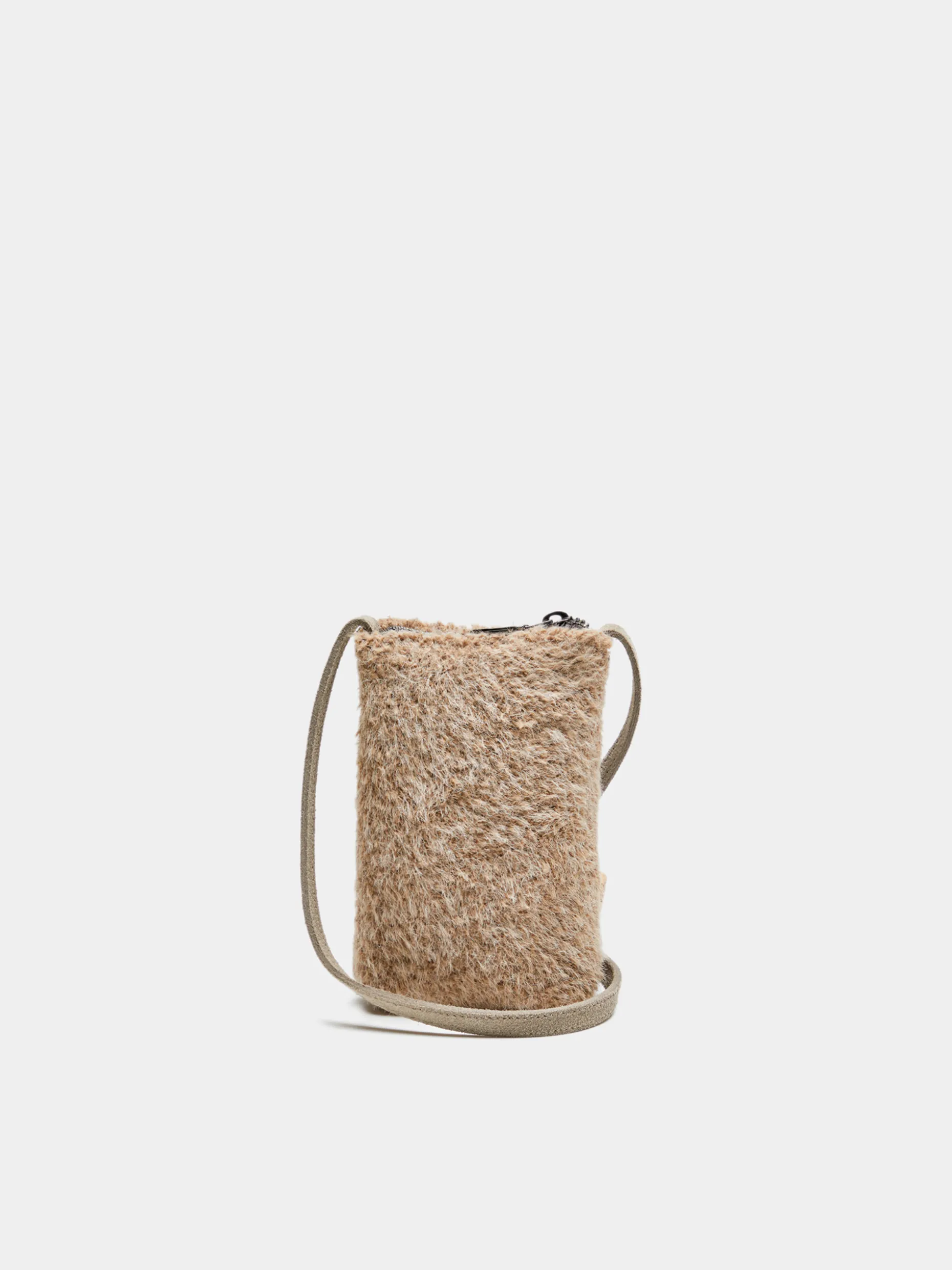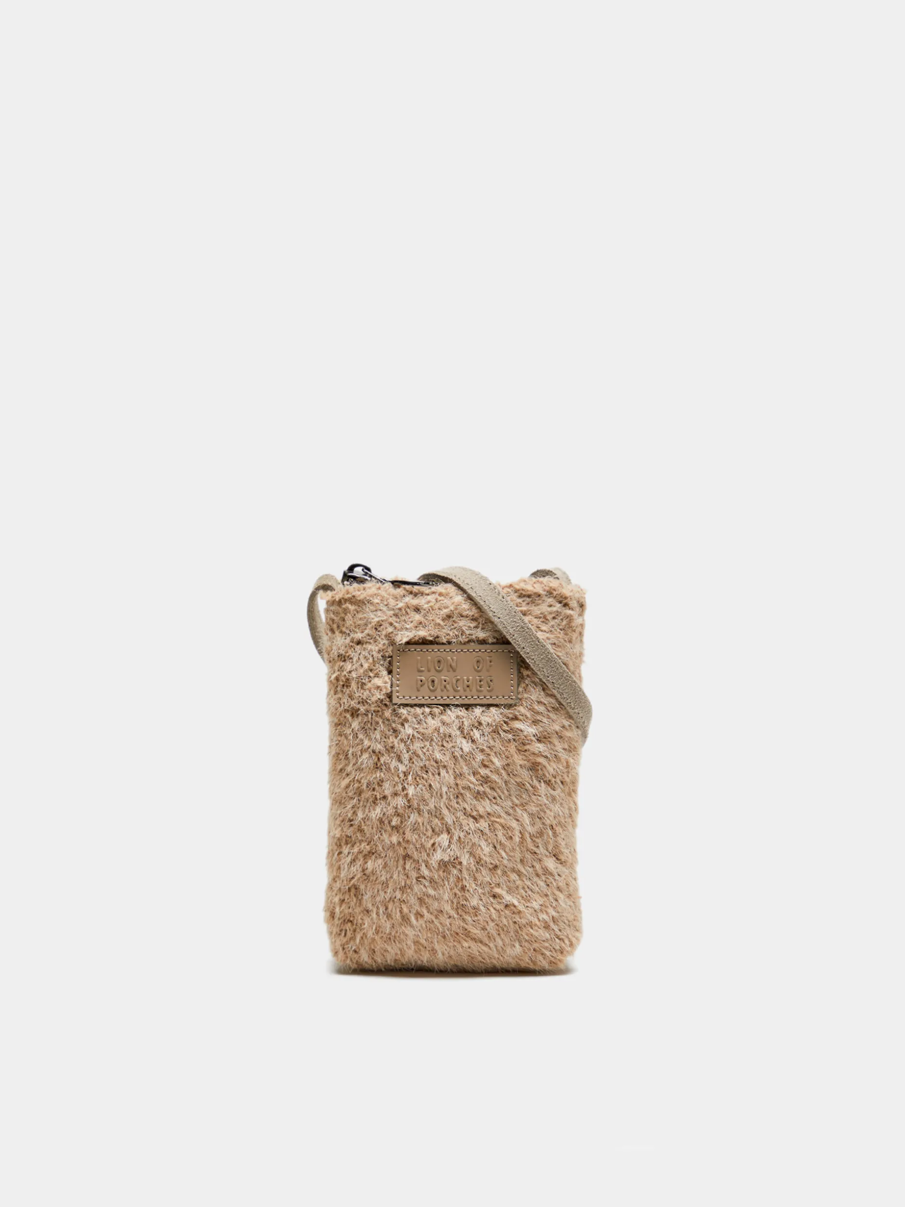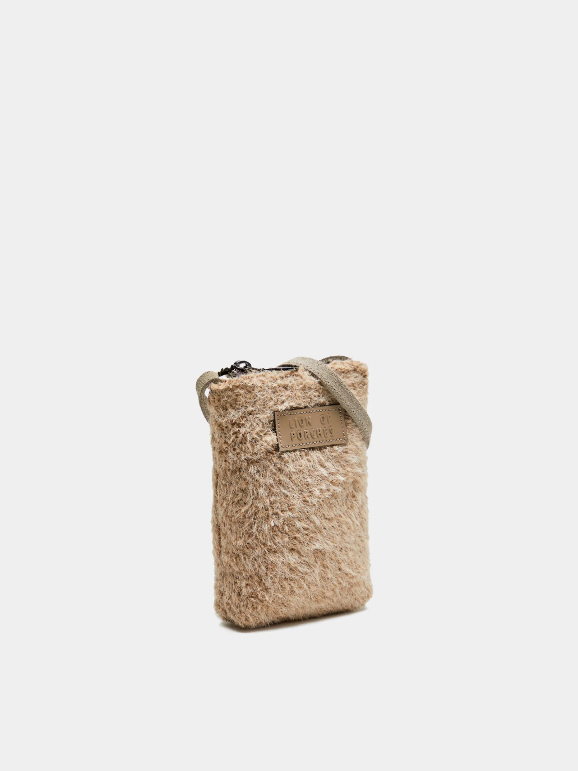 Porta-telemóvel em pelo. Alça de camurça. Etiqueta personalizada em pele na frente.