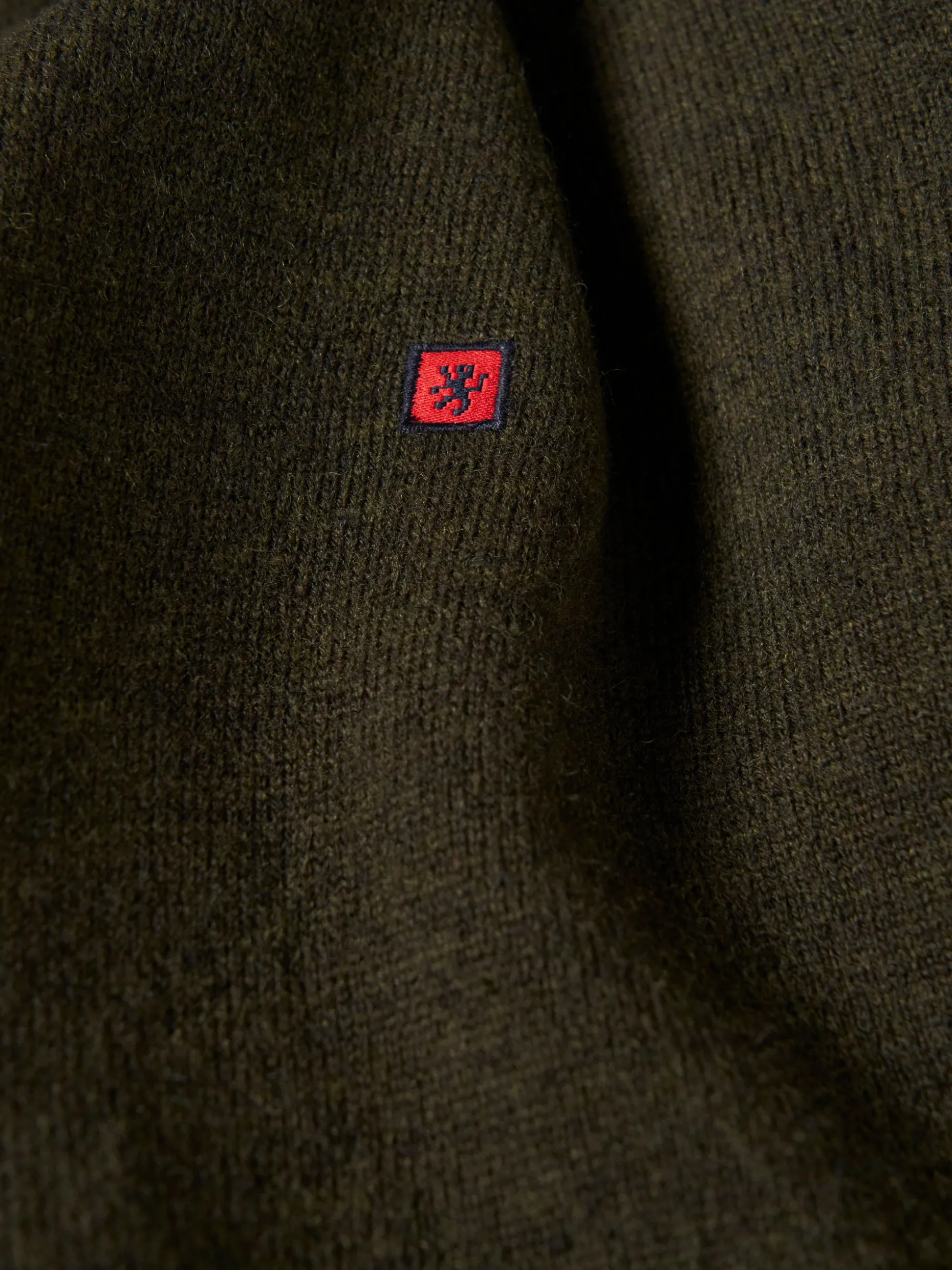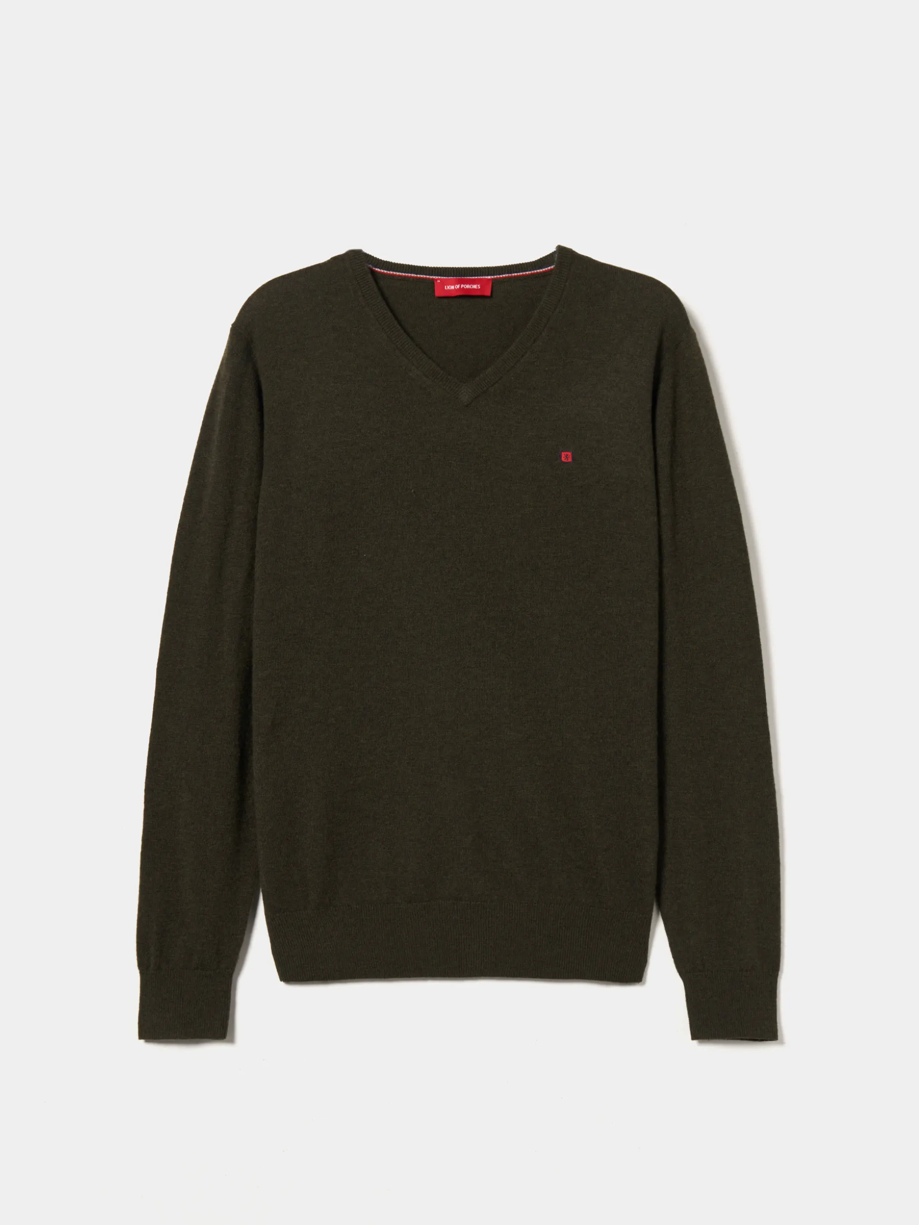 Pullover decote em bico manga comprida com etiqueta leão no peito. Riscas tricolor no interior da gola.