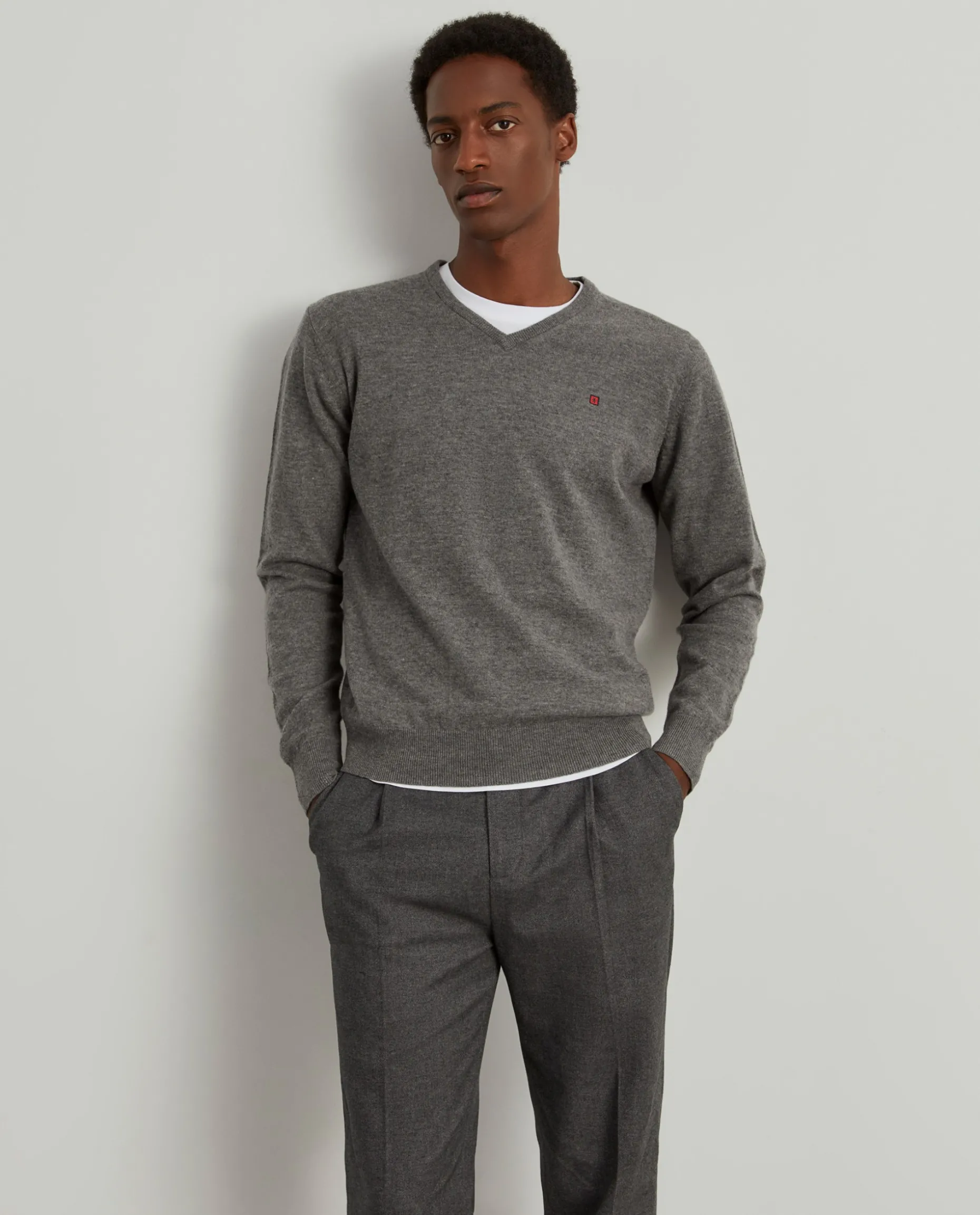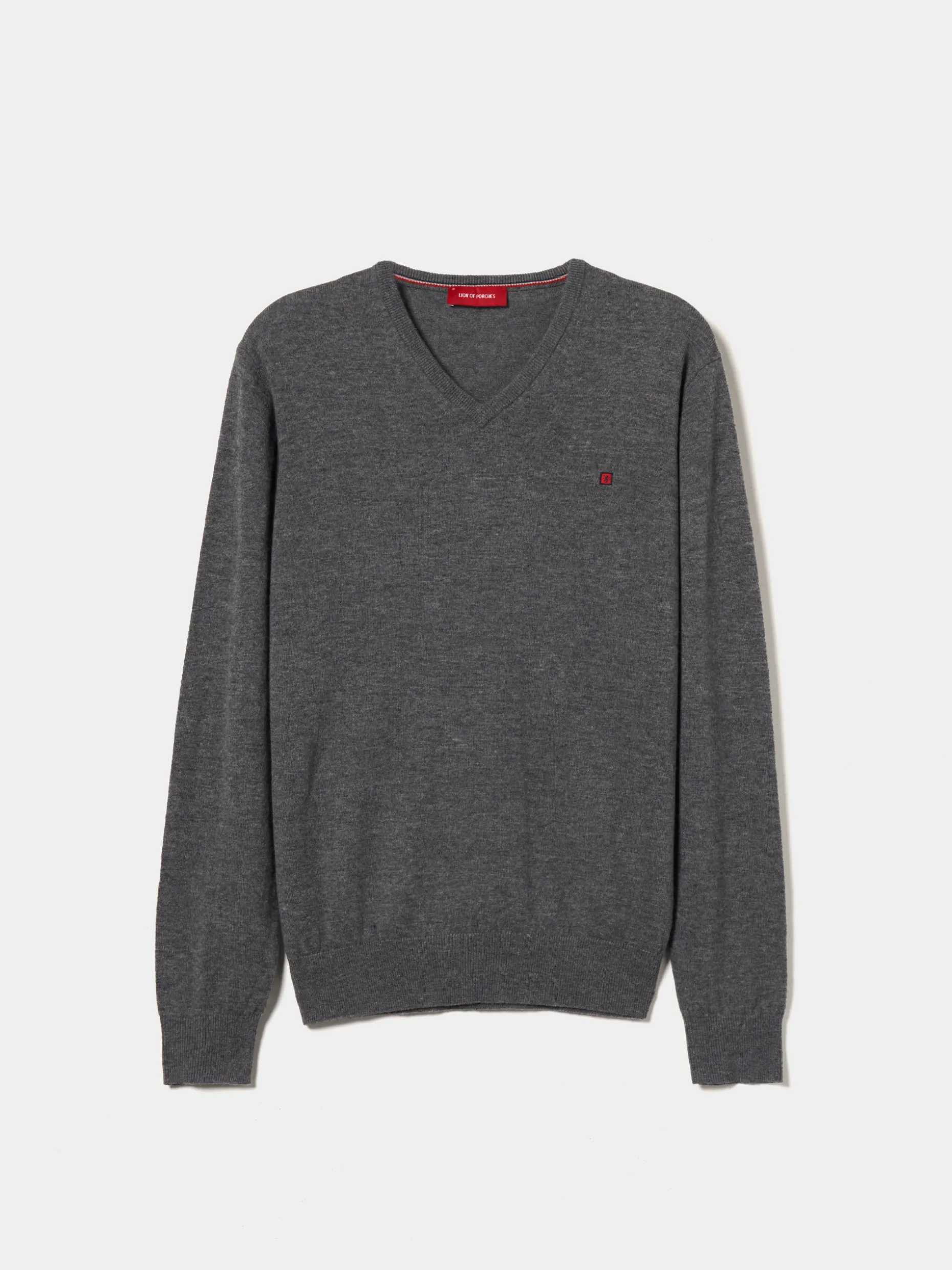 Pullover decote em bico manga comprida com etiqueta leão no peito. Riscas tricolor no interior da gola.