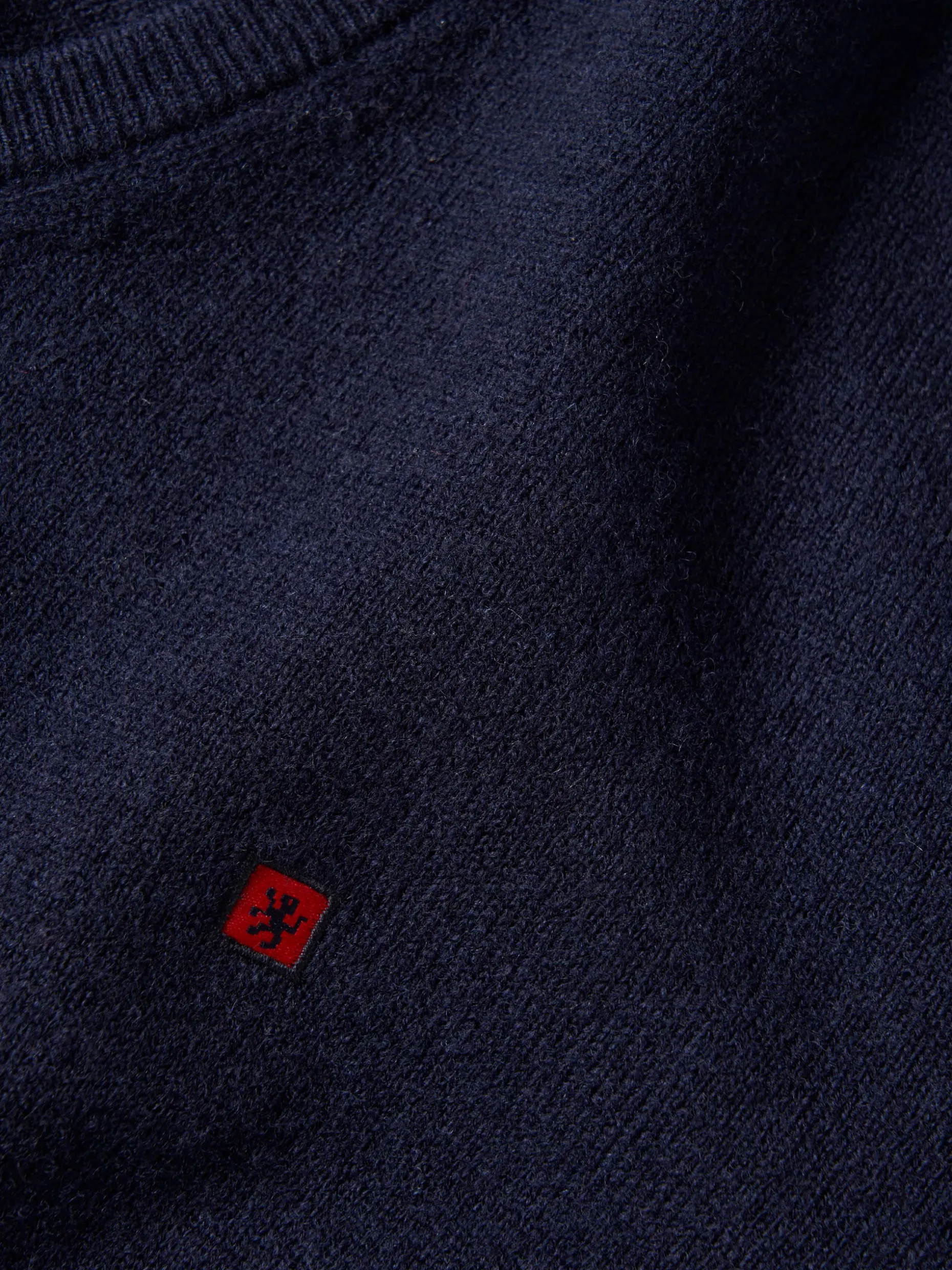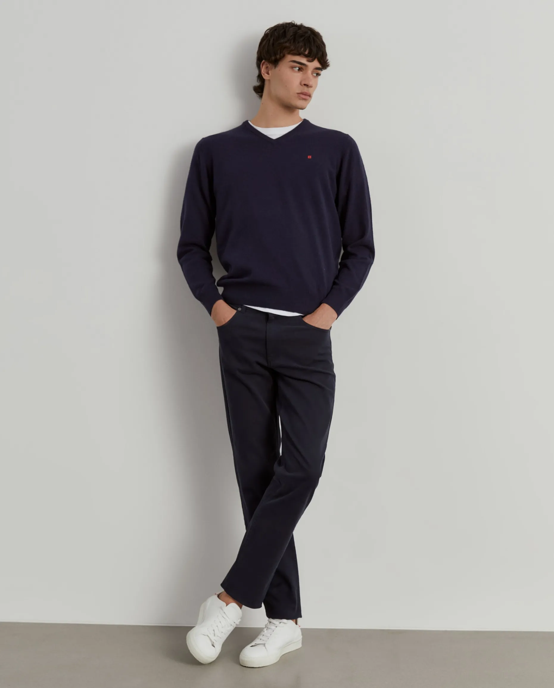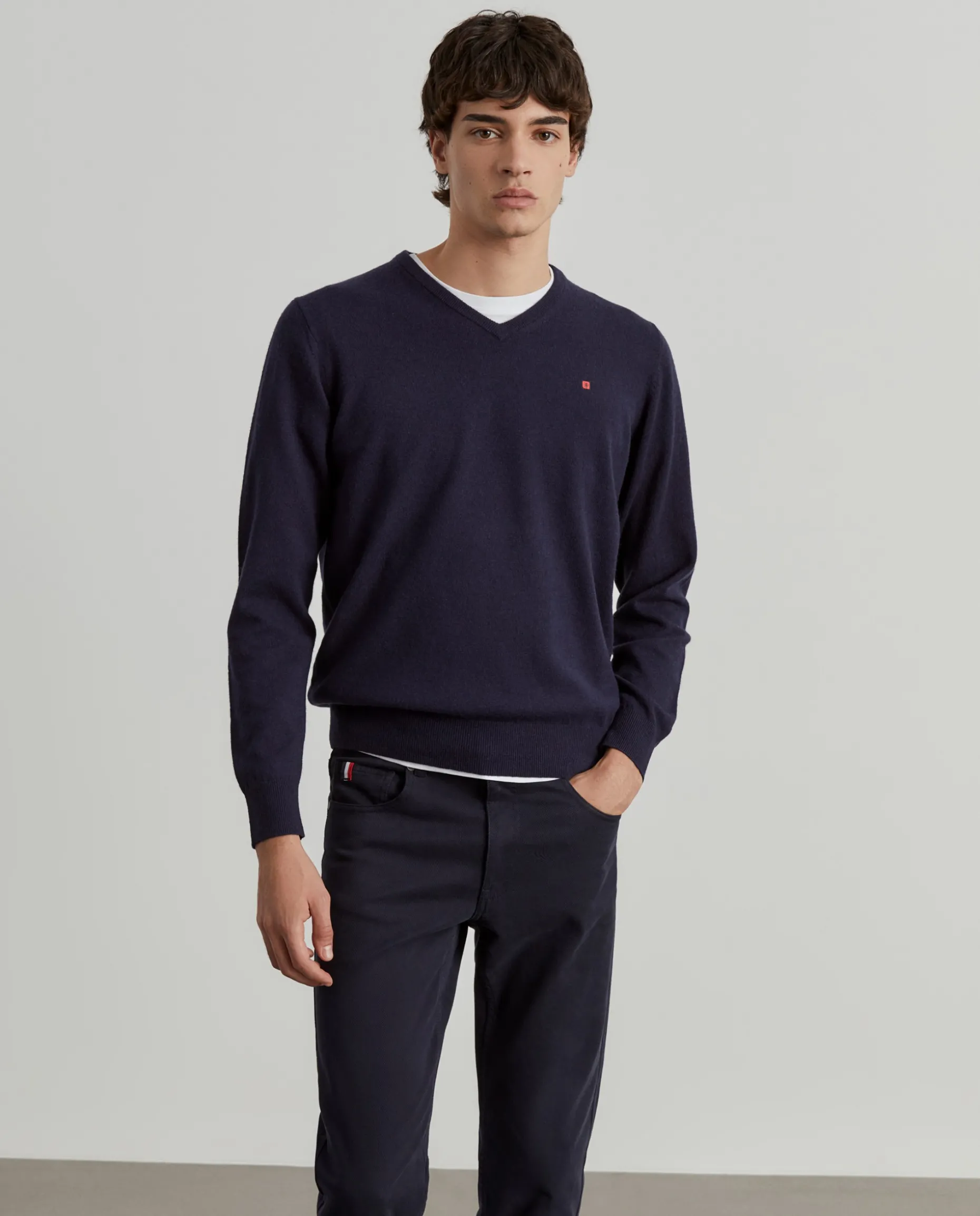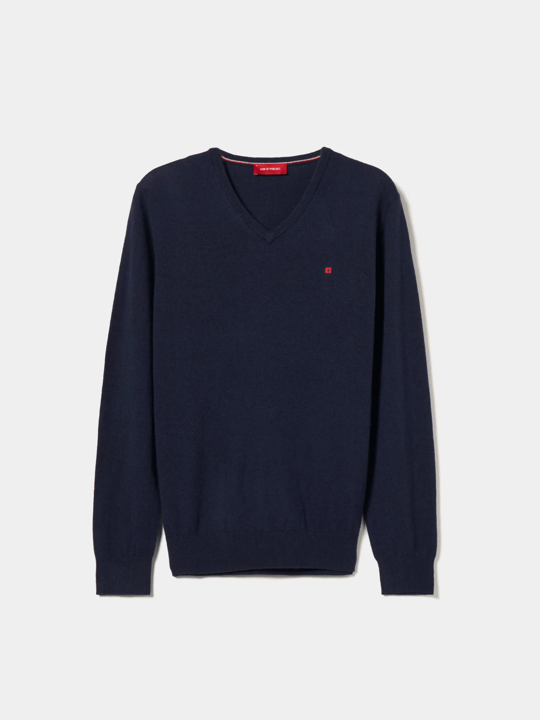 Pullover decote em bico manga comprida com etiqueta leão no peito. Riscas tricolor no interior da gola.