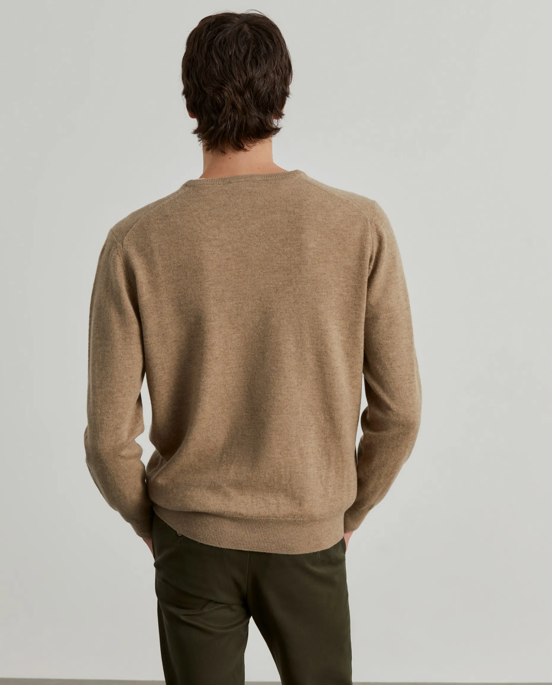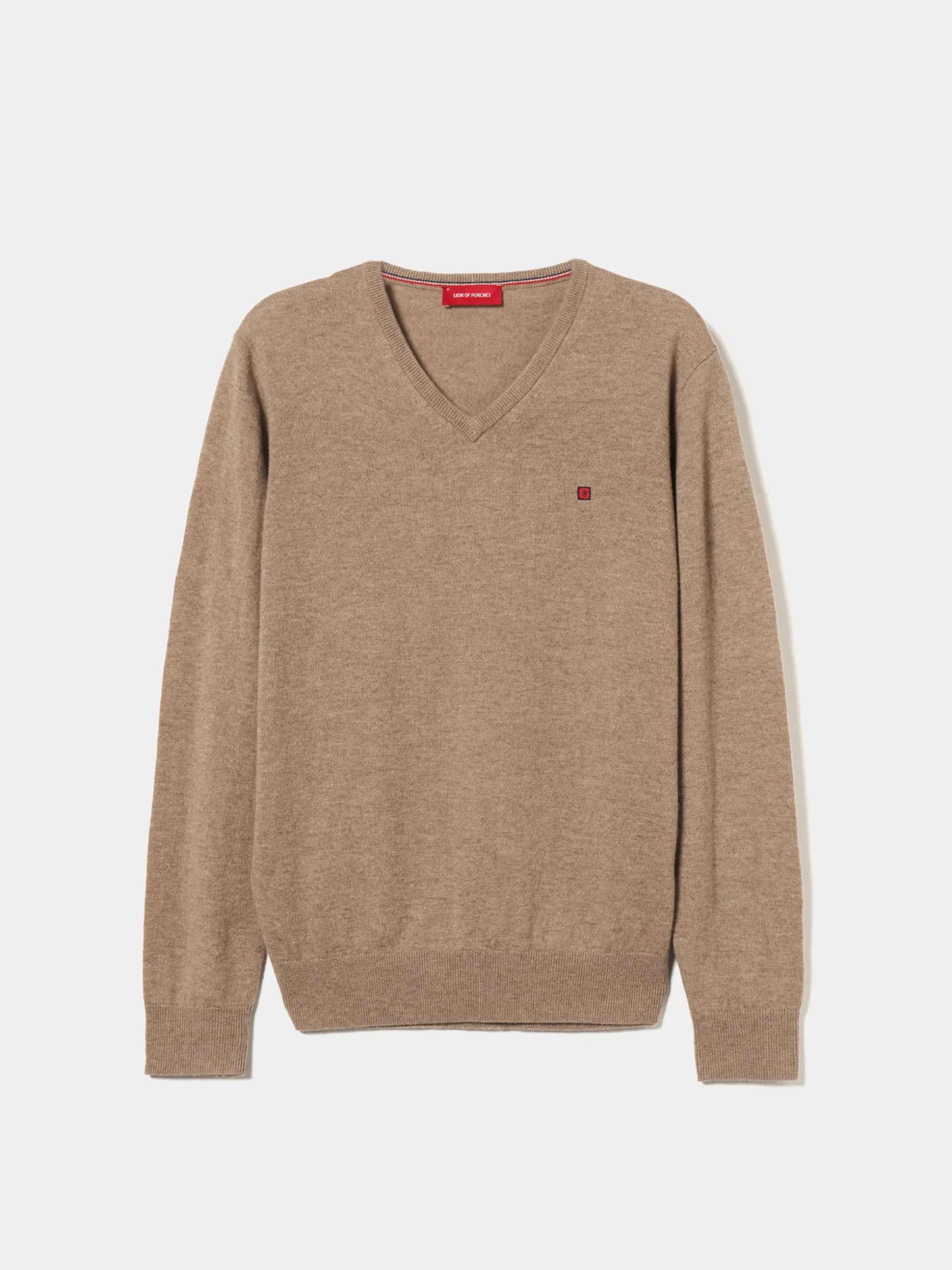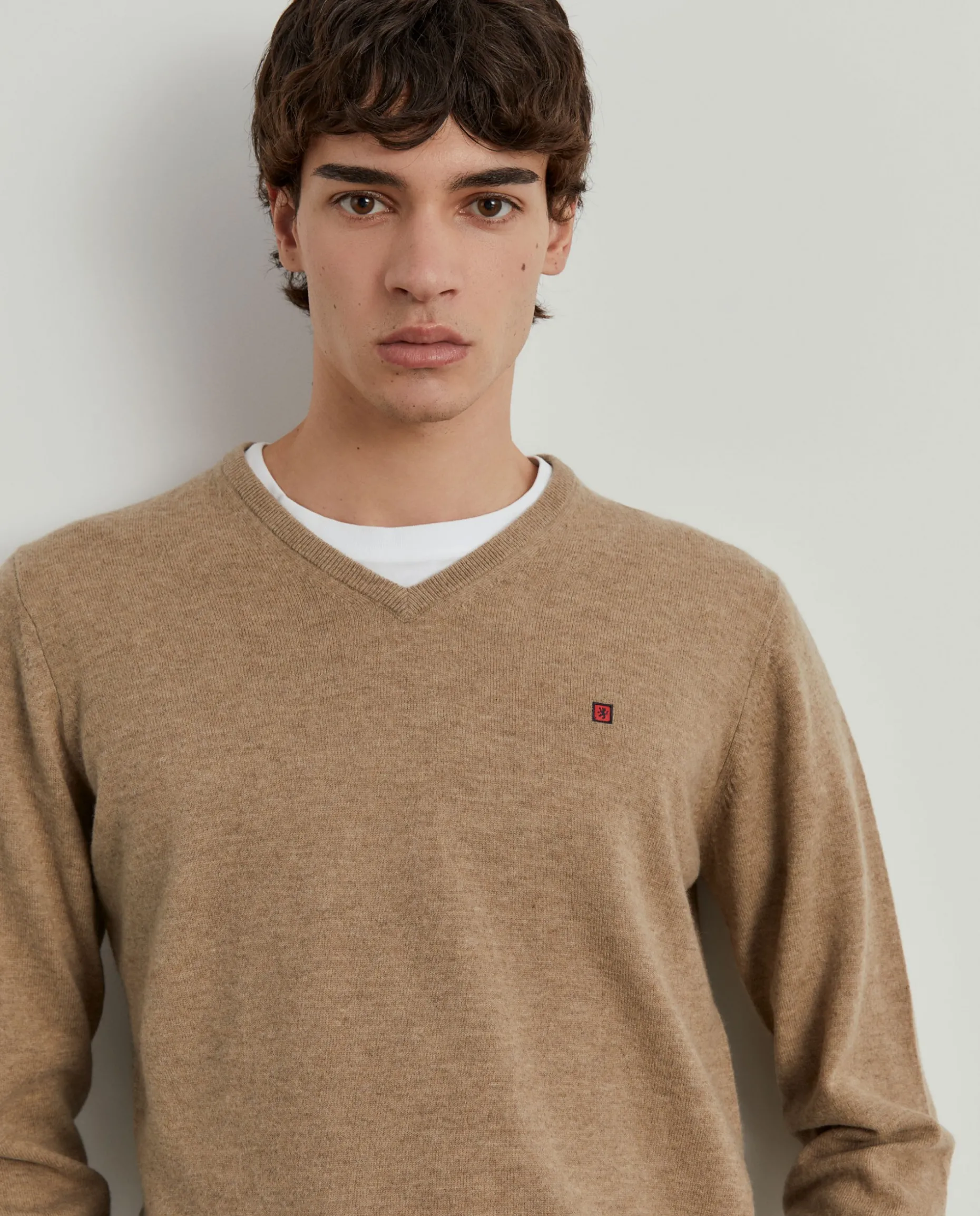 Pullover decote em bico manga comprida com etiqueta leão no peito. Riscas tricolor no interior da gola.