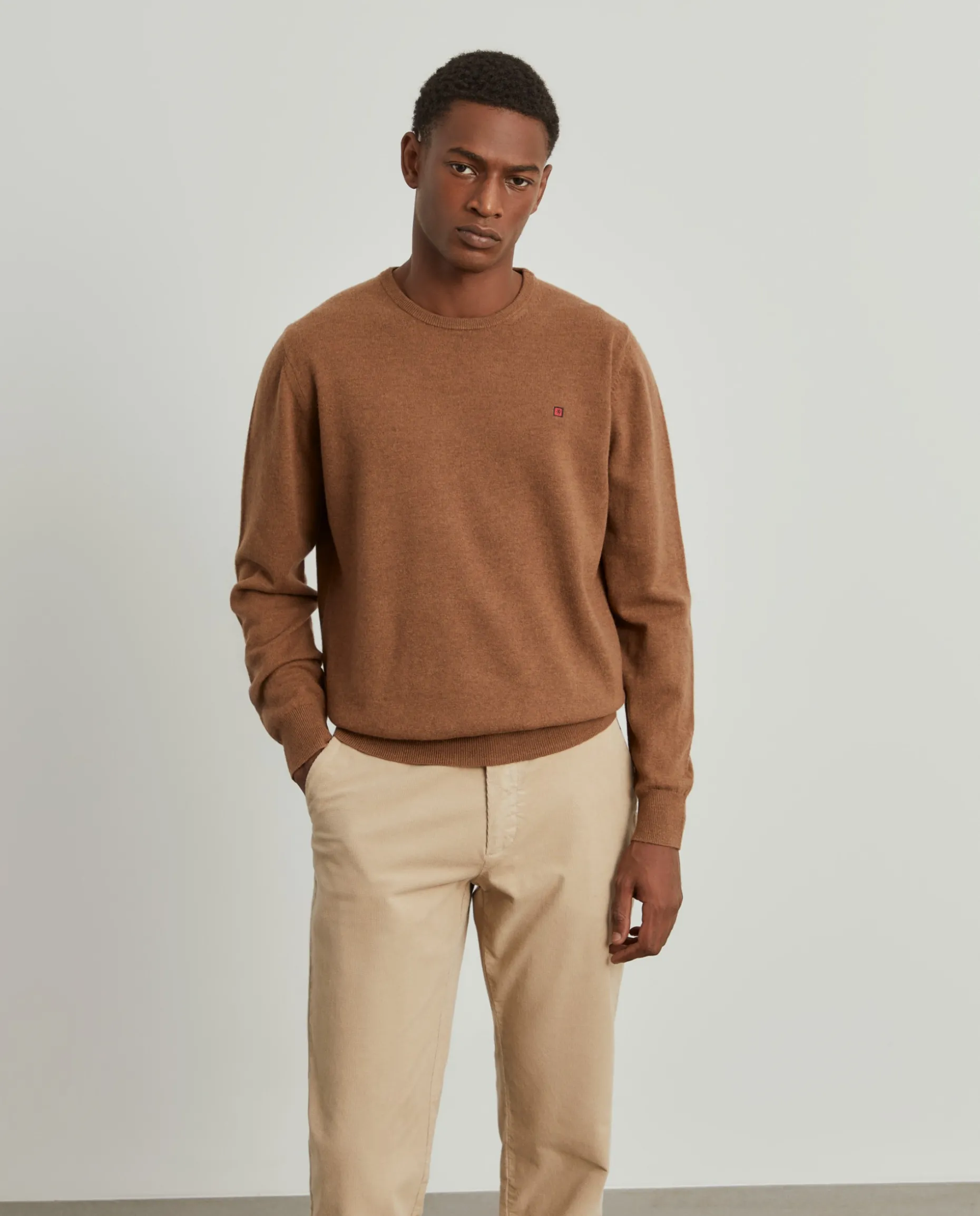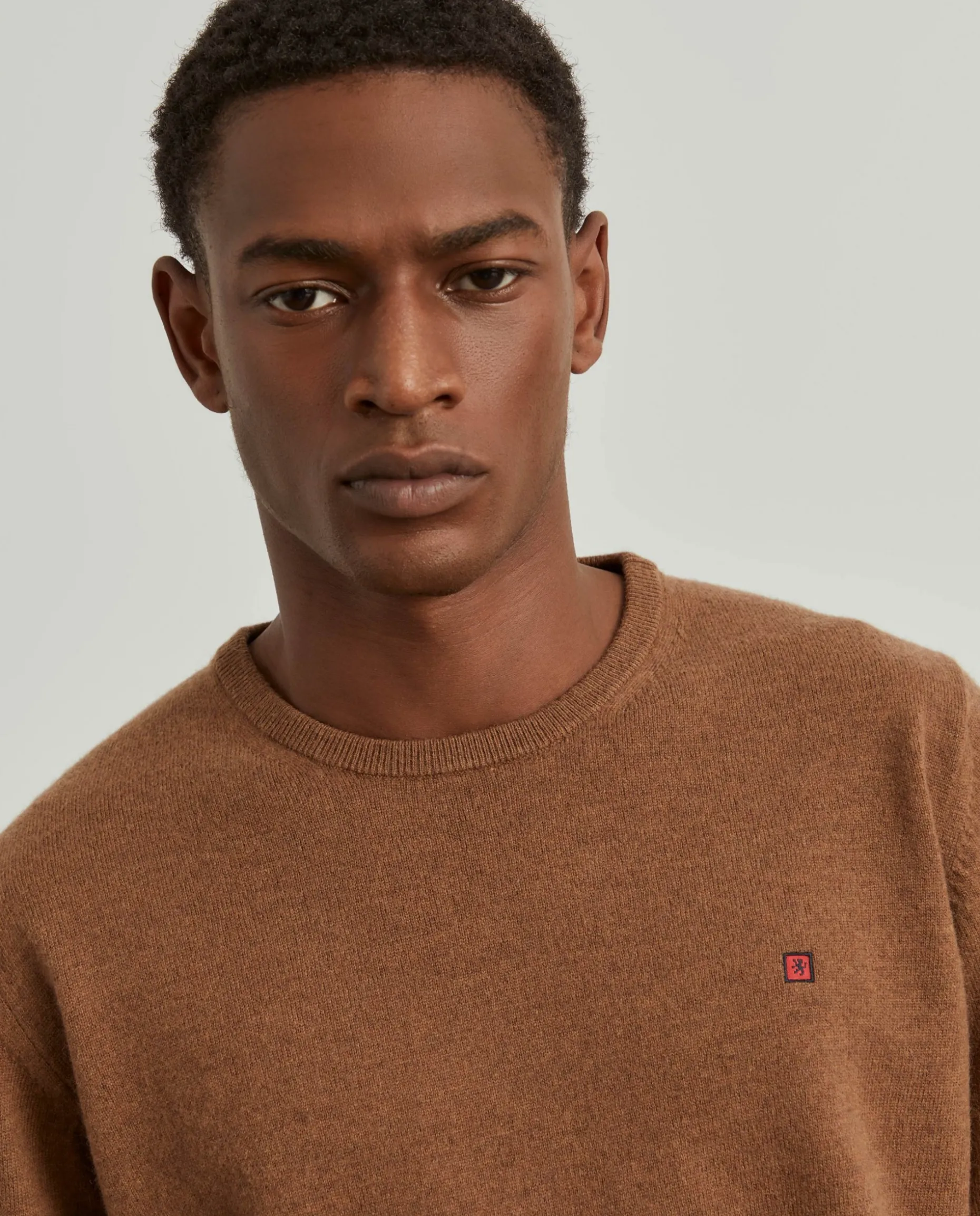 Camisola decote redondo manga comprida com etiqueta leão no peito. Riscas tricolor no interior da gola.