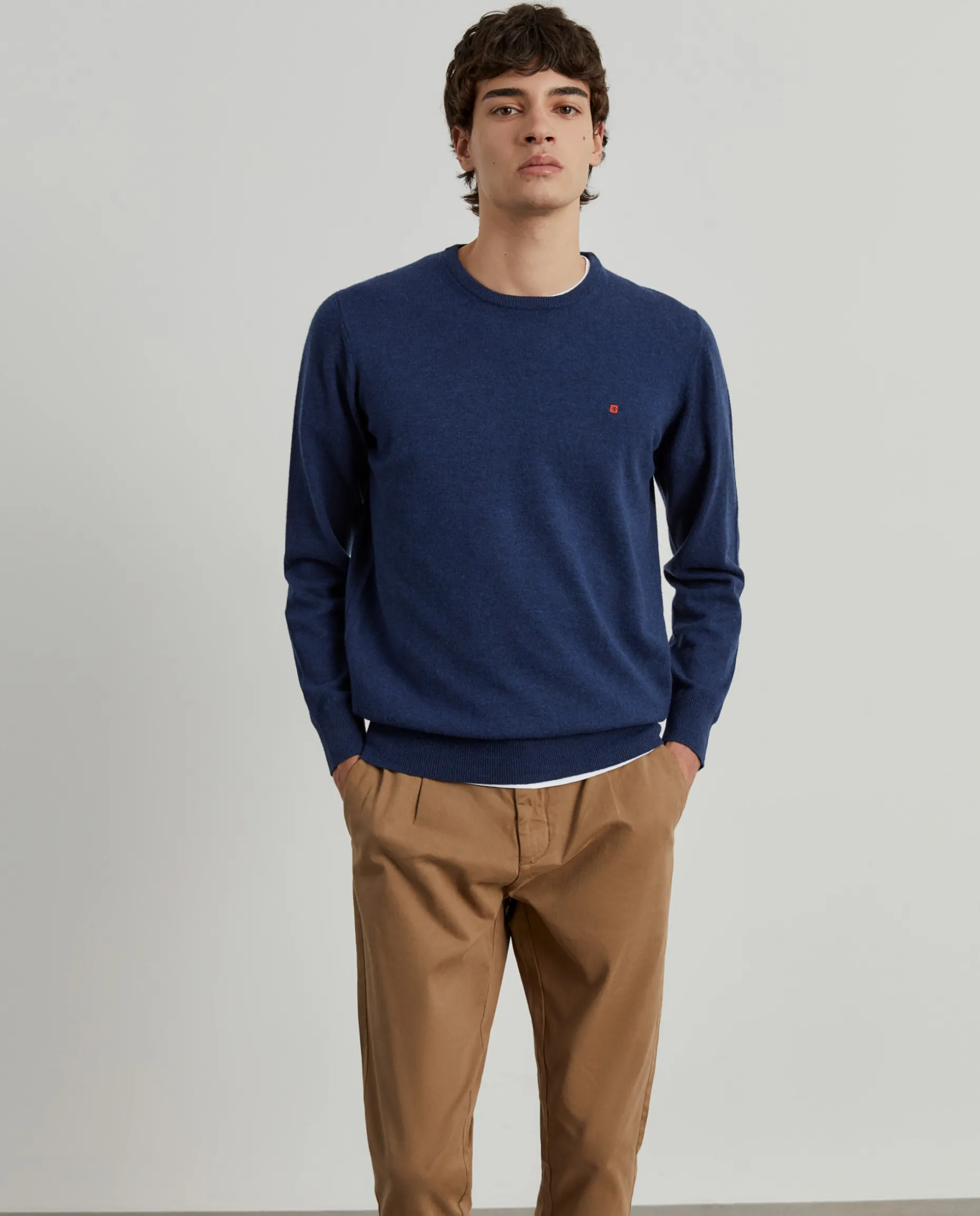 Camisola decote redondo manga comprida com etiqueta leão no peito. Riscas tricolor no interior da gola.