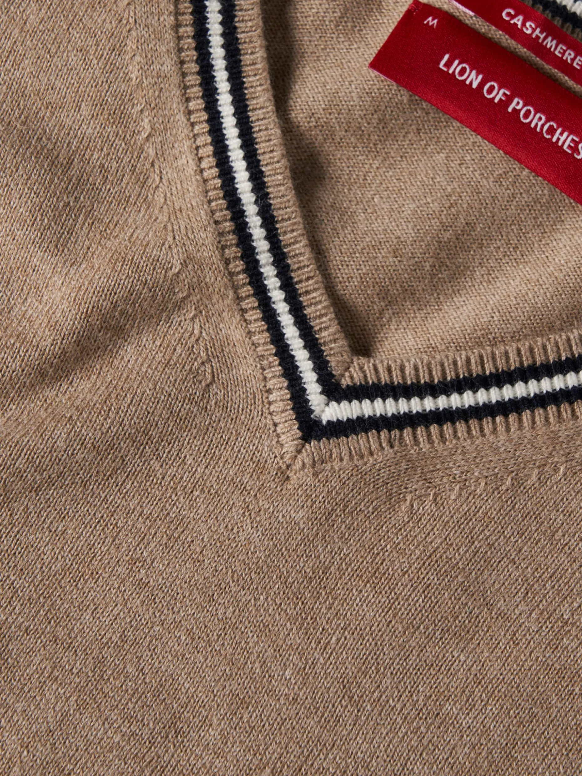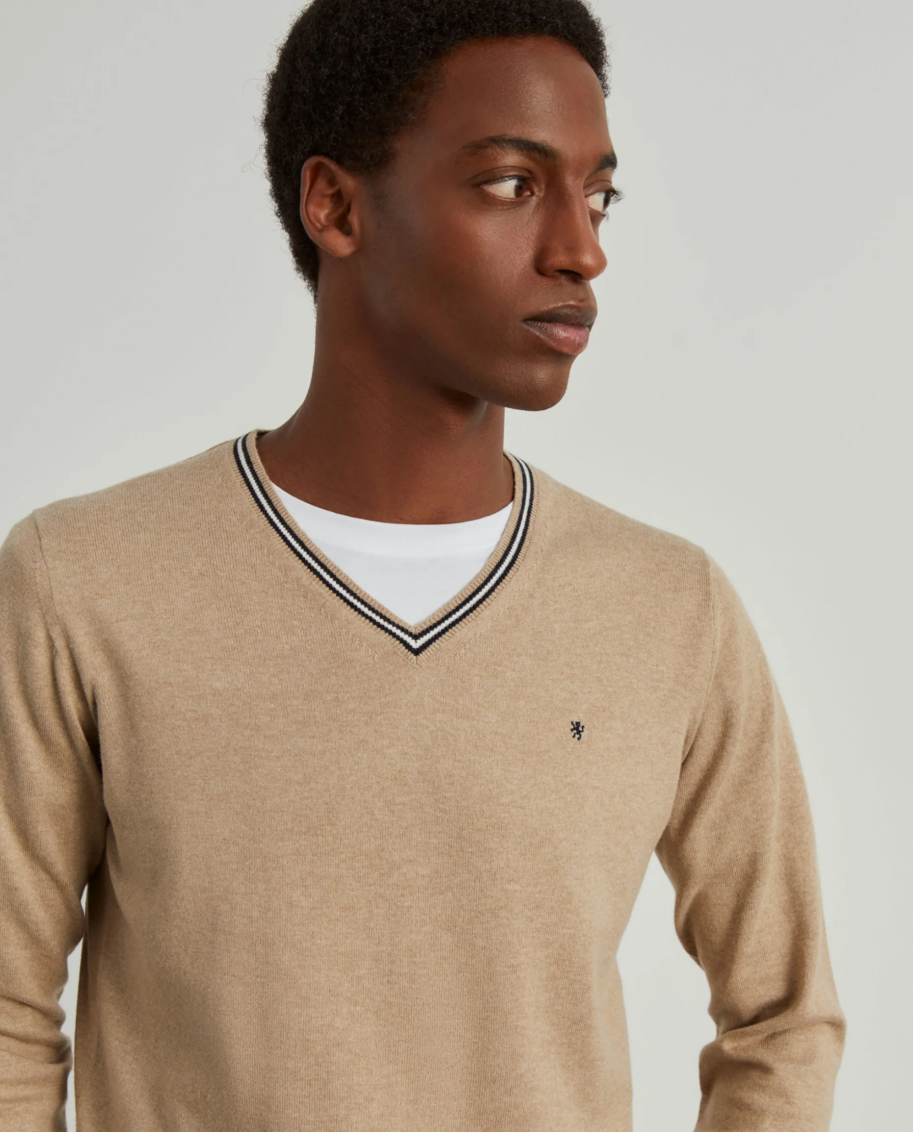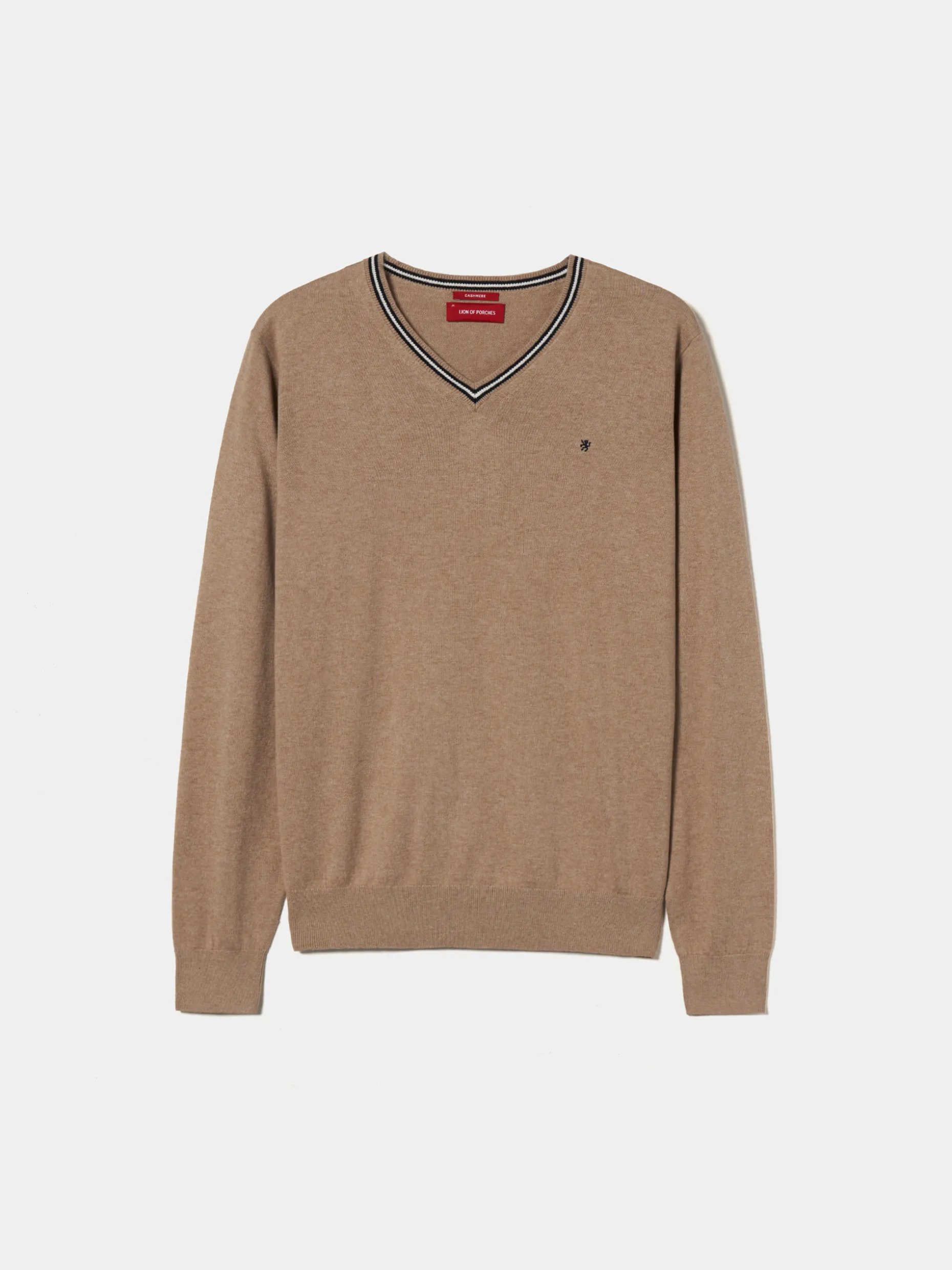 Pullover de manga comprida com decote em V. De cor lisa, à exceção do decote com riscas em contraste. Finaliza com pequeno leão em contraste no peito.