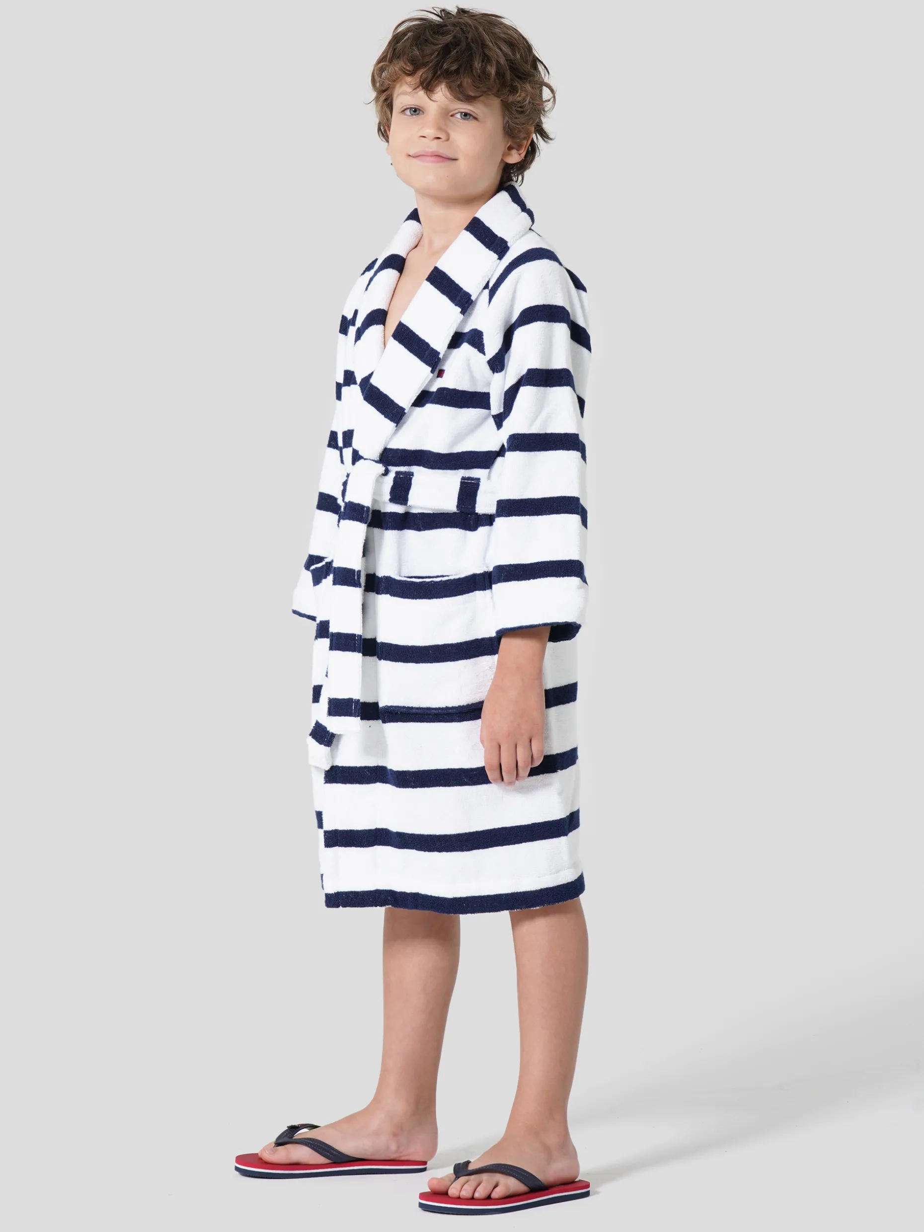 Roupão confecionado em turco 100% algodão. O tamanho 1 é o indicado para idades compreendidas entre os 3/4 e os 5/6, já o tamanho 2 é adequado para crianças que, habitualmente, vestem o tamanho 7/8 ou o 9/10, por sua vez o tamanho 3 é o tamanho maior, direcionado para crianças com idades compreendidas entre o 11/12 e o 13/14.