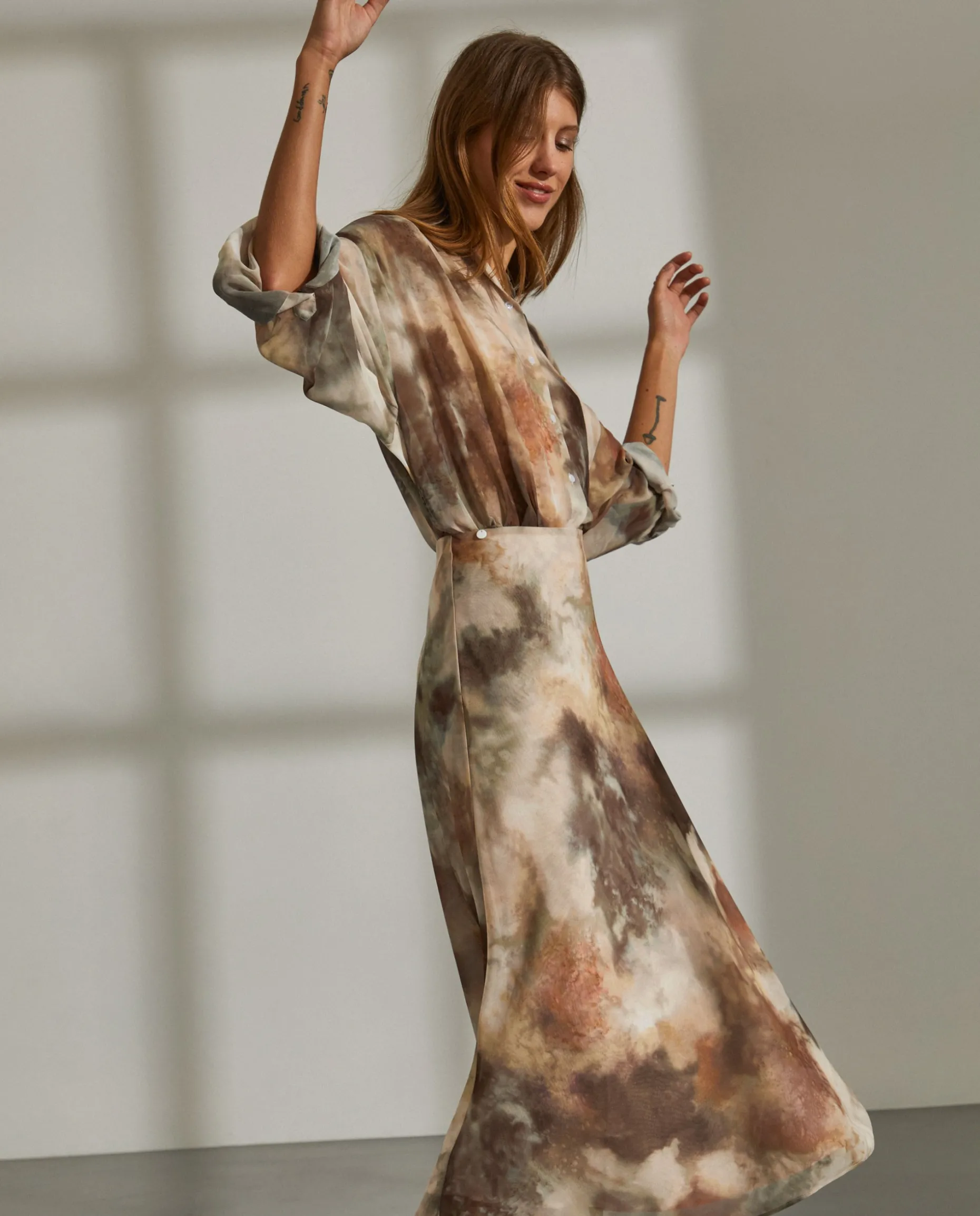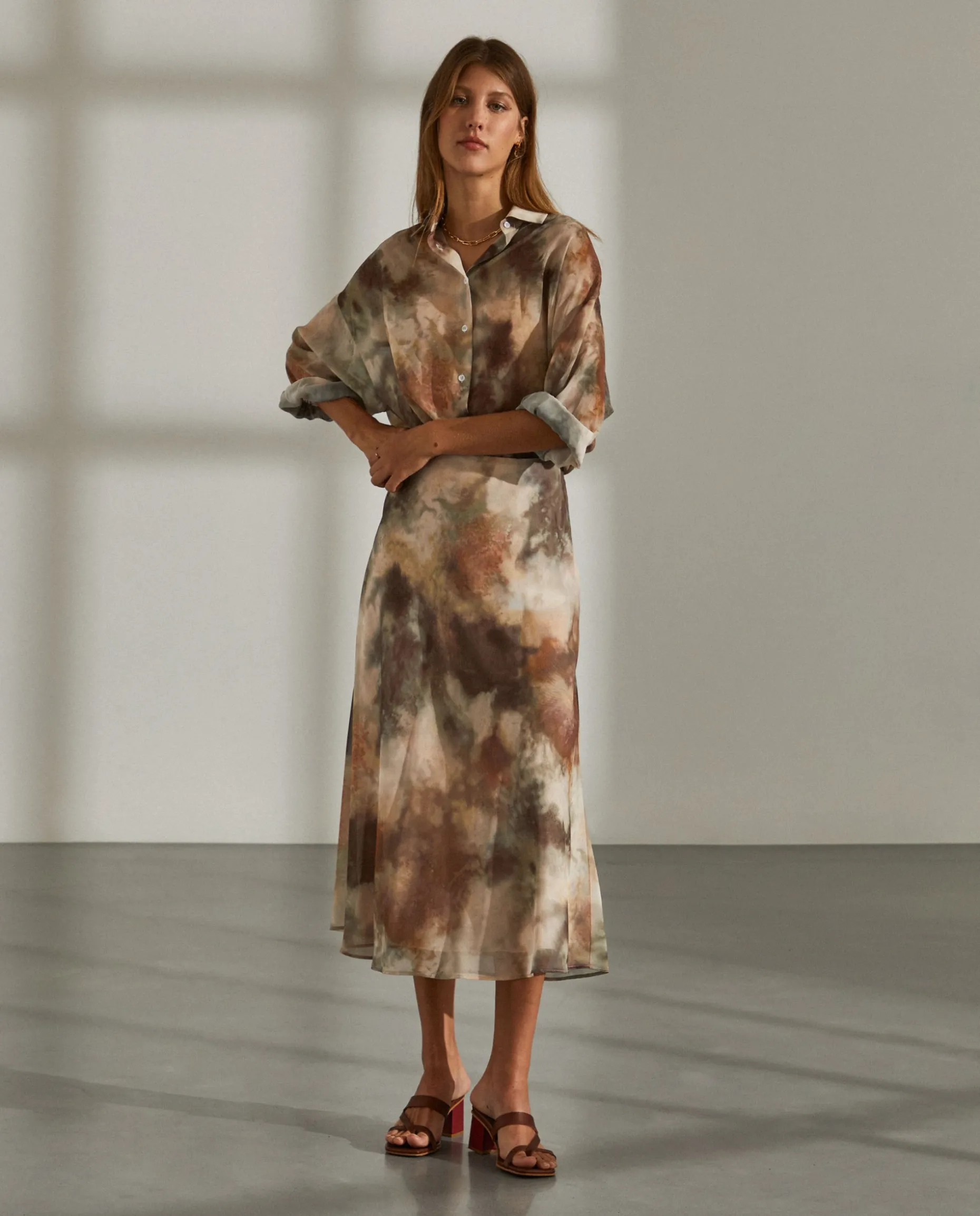 Saia comprida estampada com corte evasé. Forro interior. Aperta com um fecho invisível na lateral.