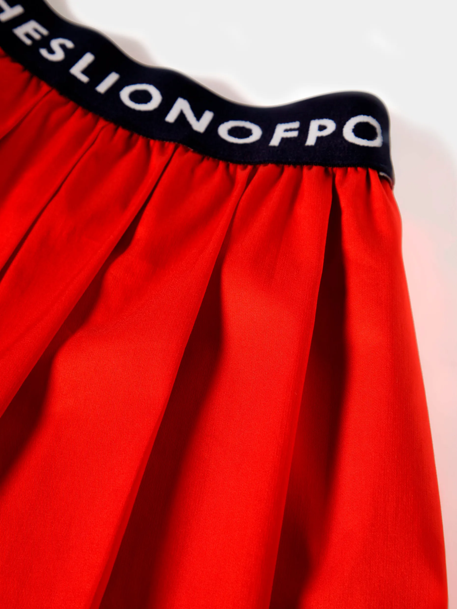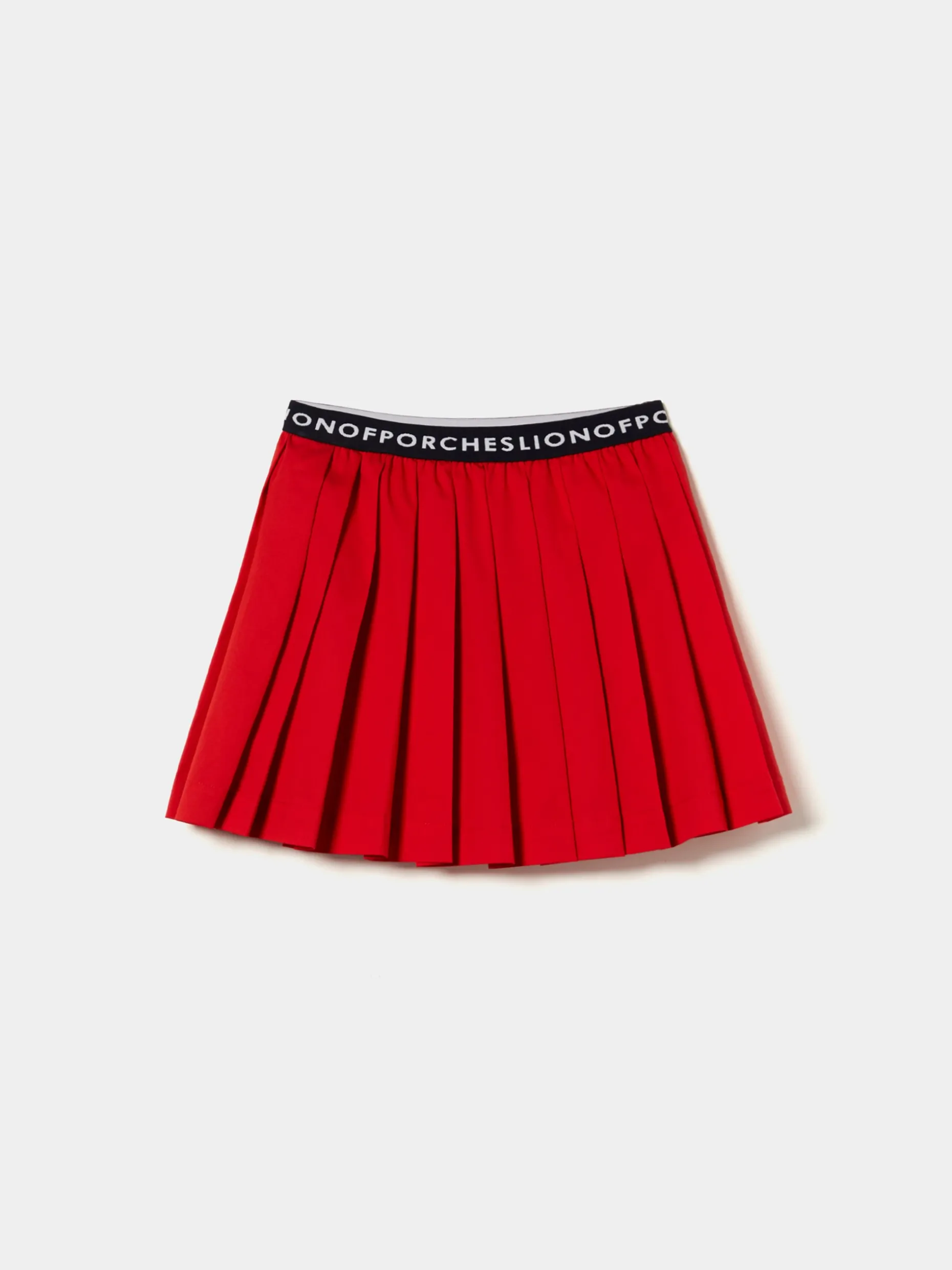 Para as miúdas mais vaidosas, propomos esta saia curta, de pregas, com cintura elástica para maior conforto. A cintura é em contraste de cor com branding Lion of Porches a toda a volta.