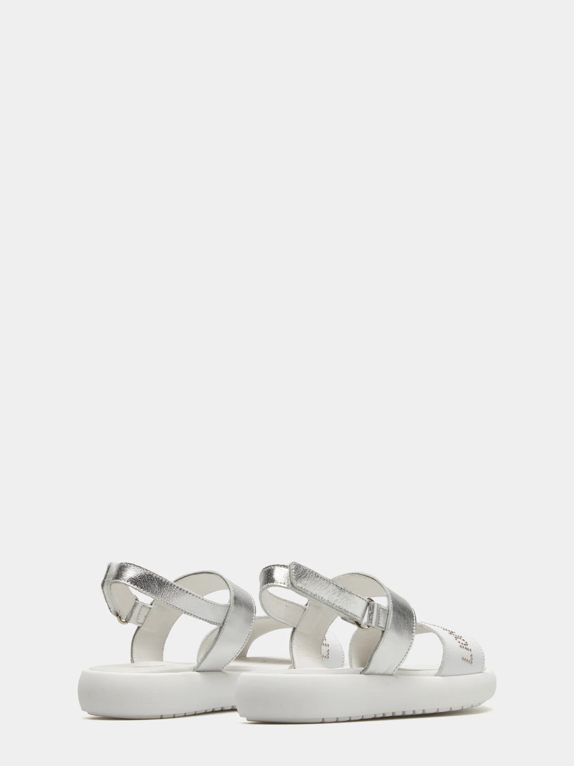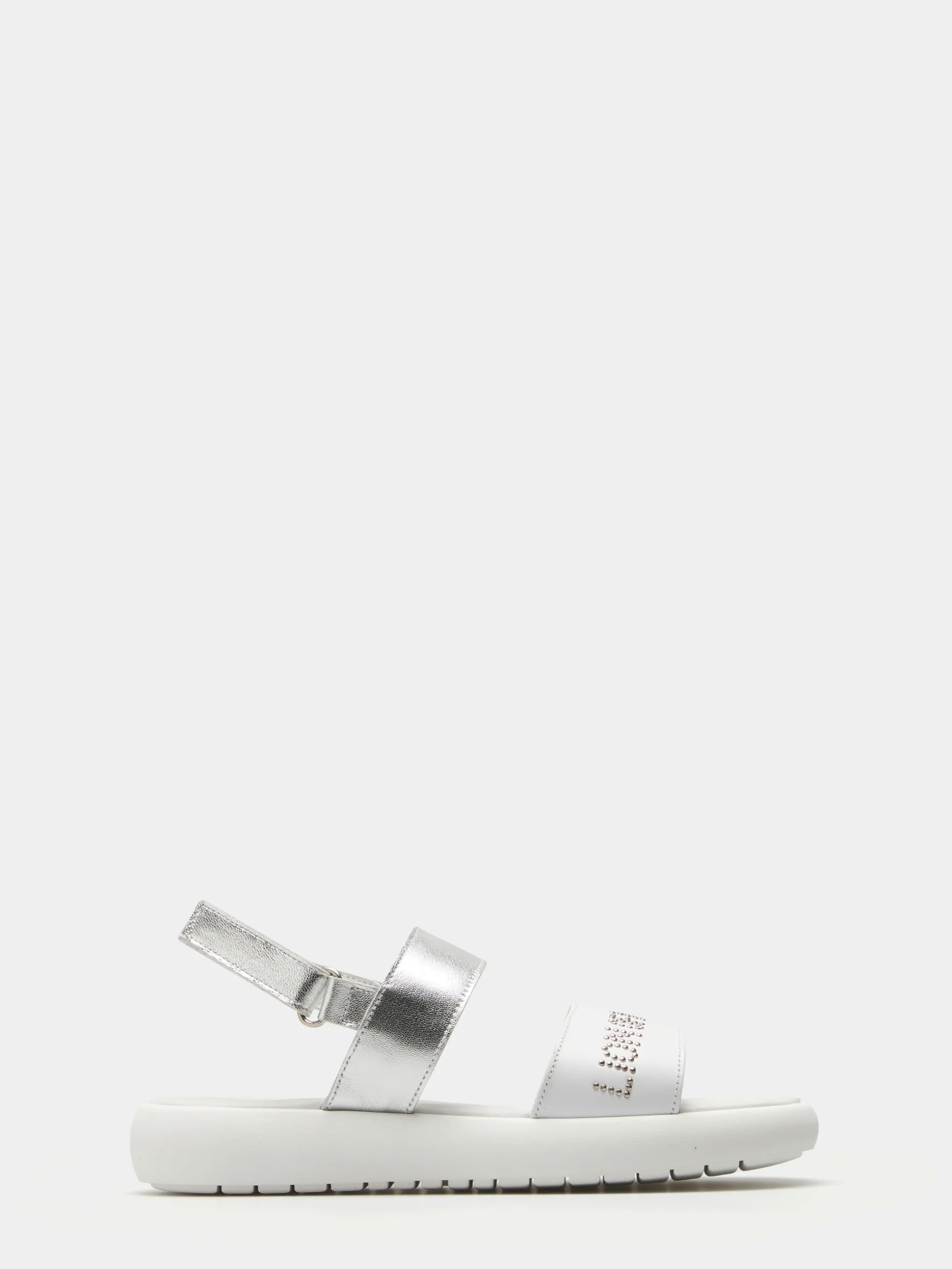 Sandálias de 2 cores. Branding Lion of Porches em pérolas prata na frente. Palmilha com estampado em contraste. Fivela ajustável no tornozelo.