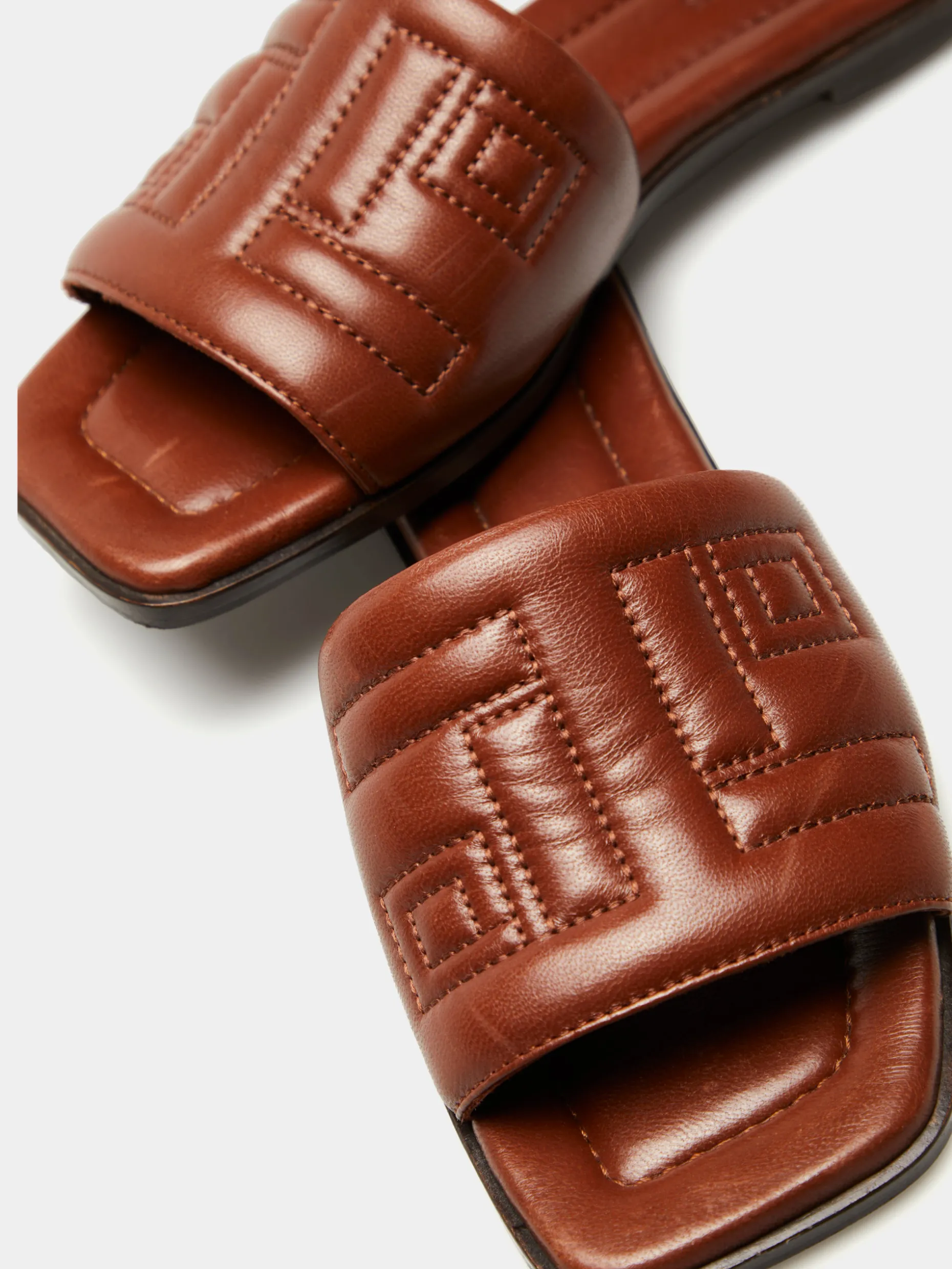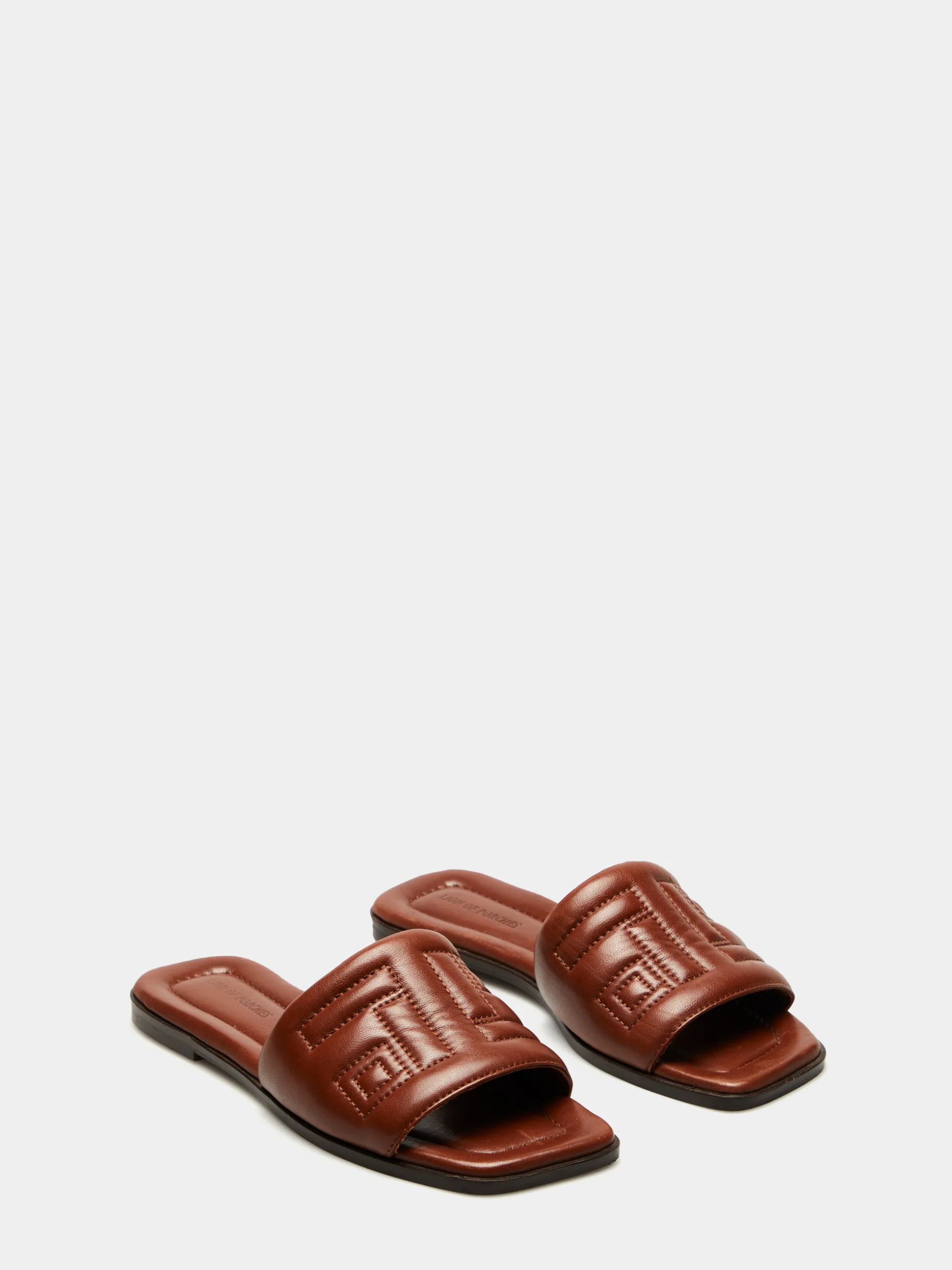 Sandália rasa acolchoada em pele, com pormenor de monograma pespontado ao tom para um toque diferenciador. Palmilhas também ligeiramente almofadadas que conferem maior conforto ao calçar. Biqueira quadrada.