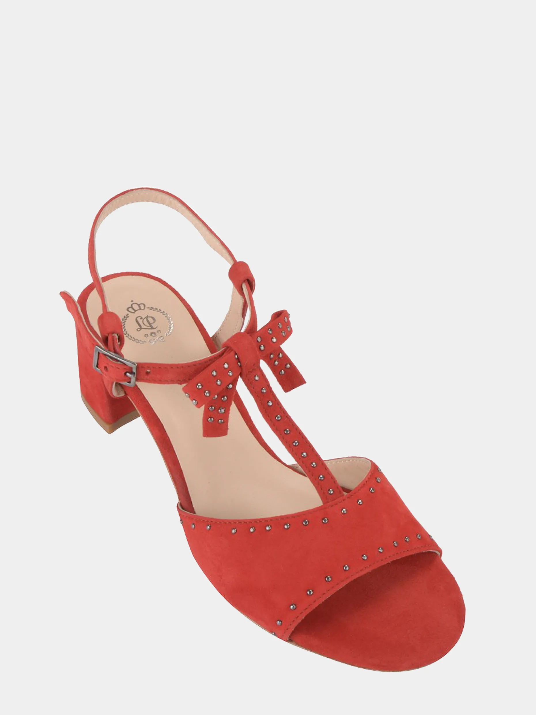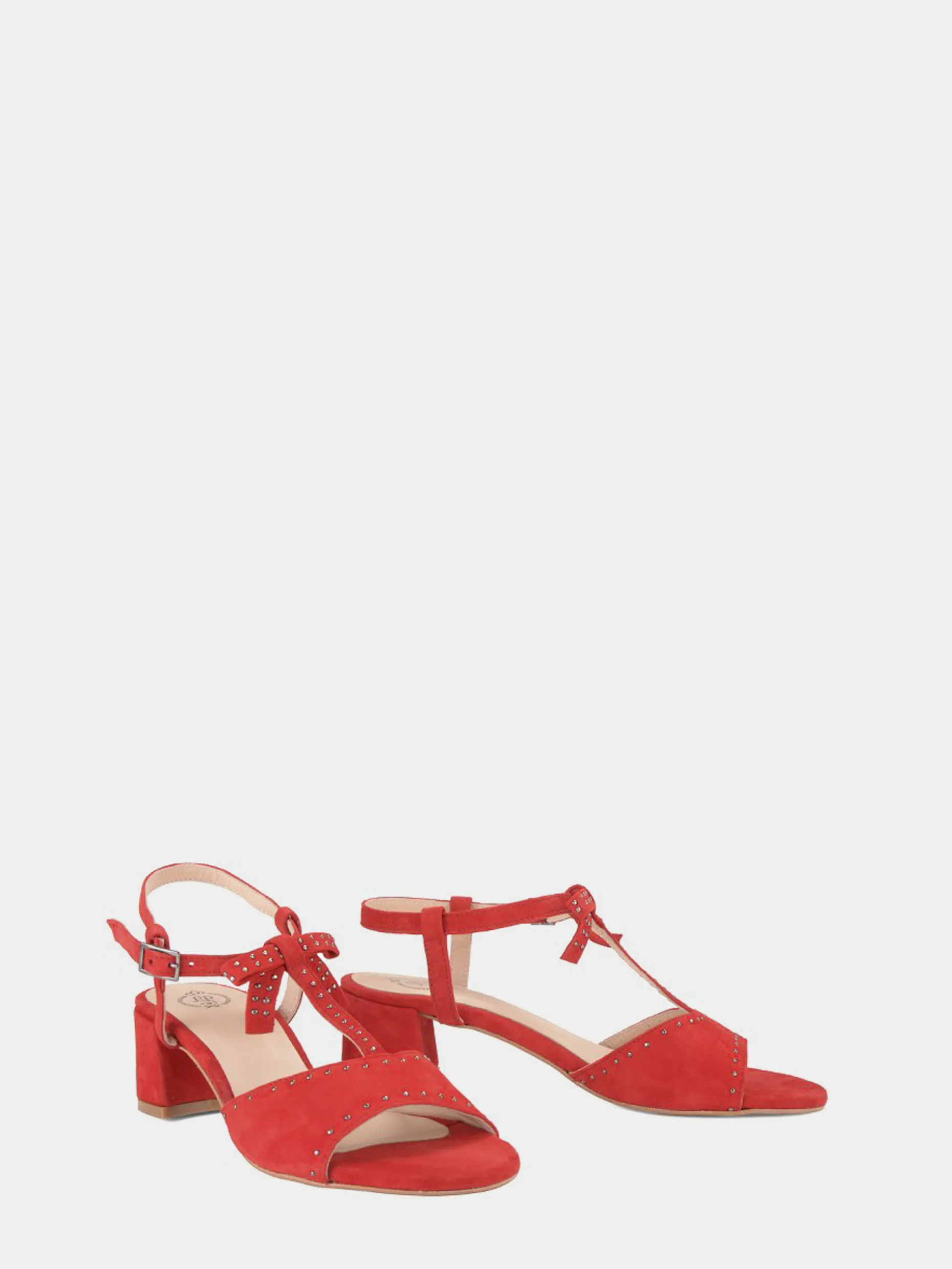 Um laço nos seus pés! Sandálias em camurça de salto reduzido com laço ao centro. Adornadas com pequenas tachas, apresentam uma tira ajustável no tornozelo