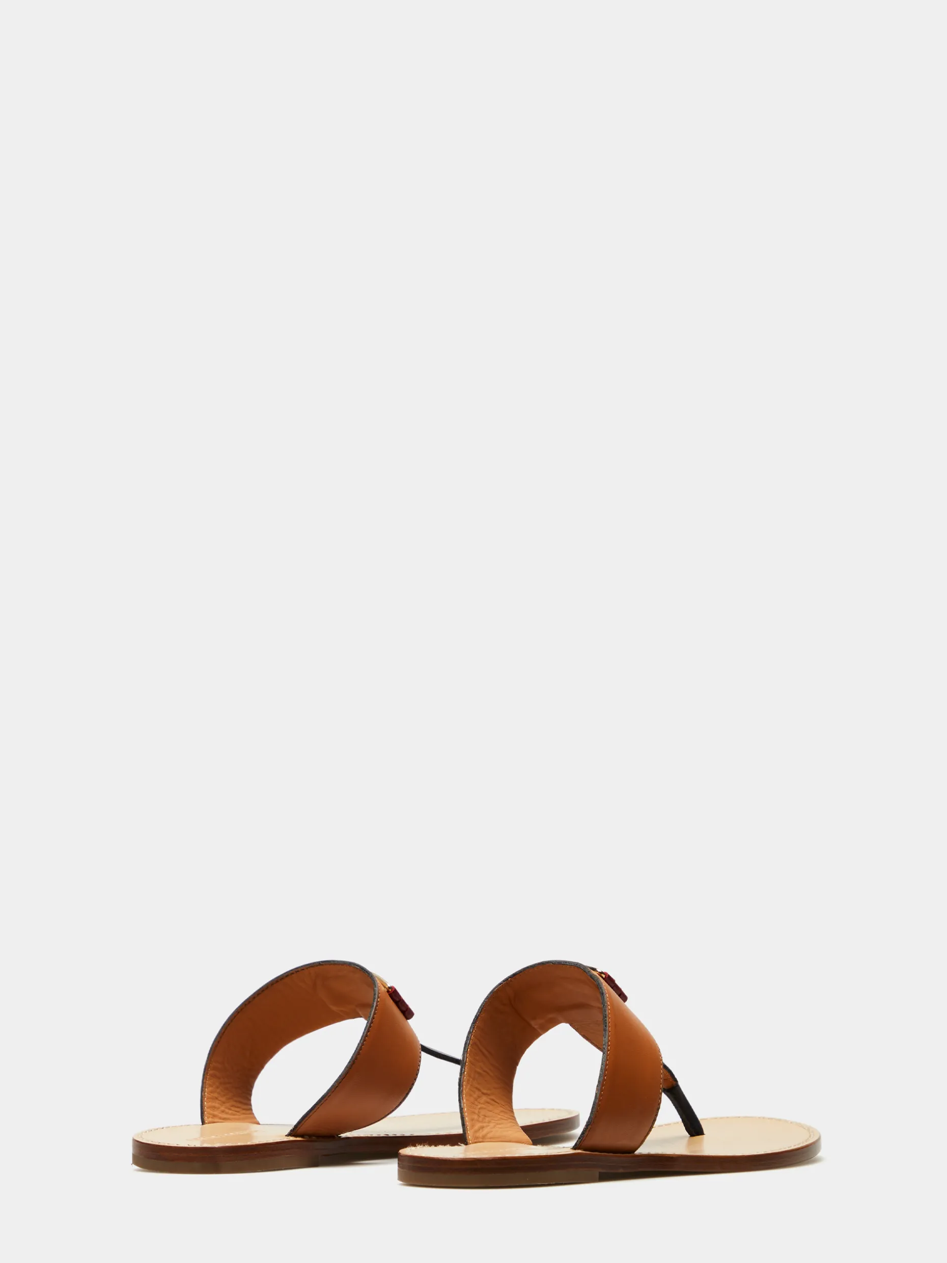 Sandálias de dedo rasas em pele com biqueira redonda. Fivela camel no peito do pé com aplique dourado com leão da marca.