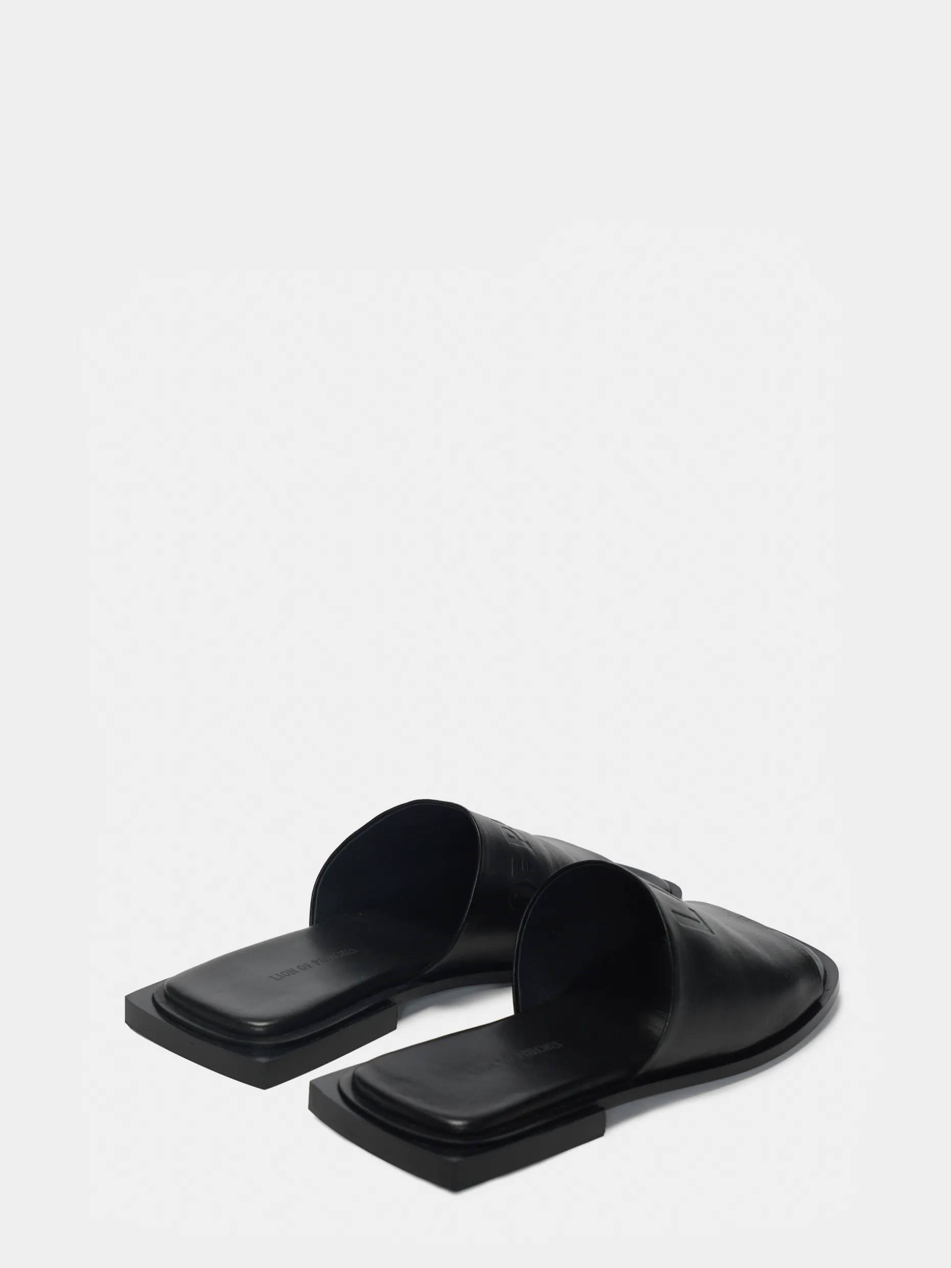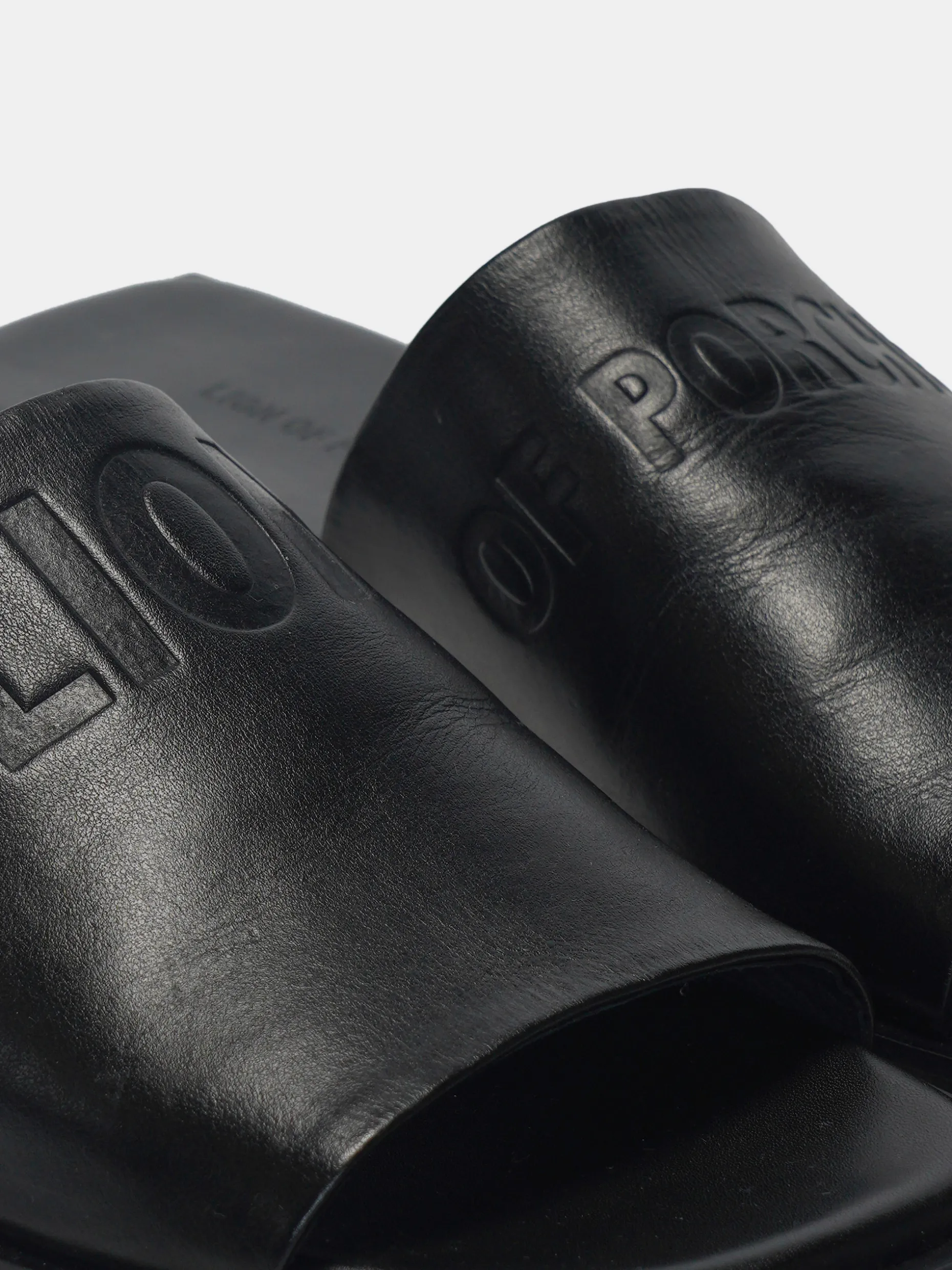 Sandálias em pele. Tacão quadrado. Gravação Lion of Porches na tira.