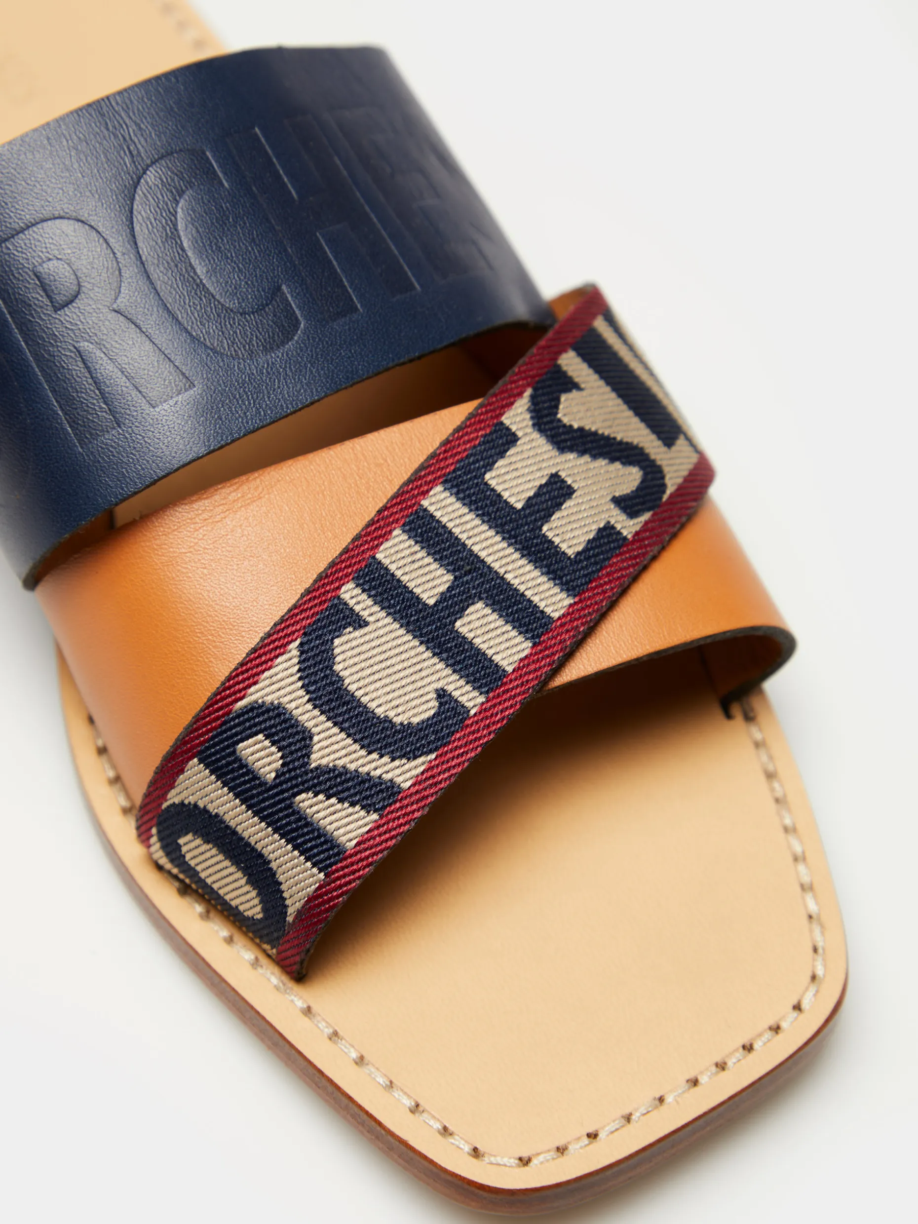 Sandálias rasas de pele cruzada. Tiras grossas, no peito do pé, com branding Lion of Porches em contraste. A biqueira é quadrada.
