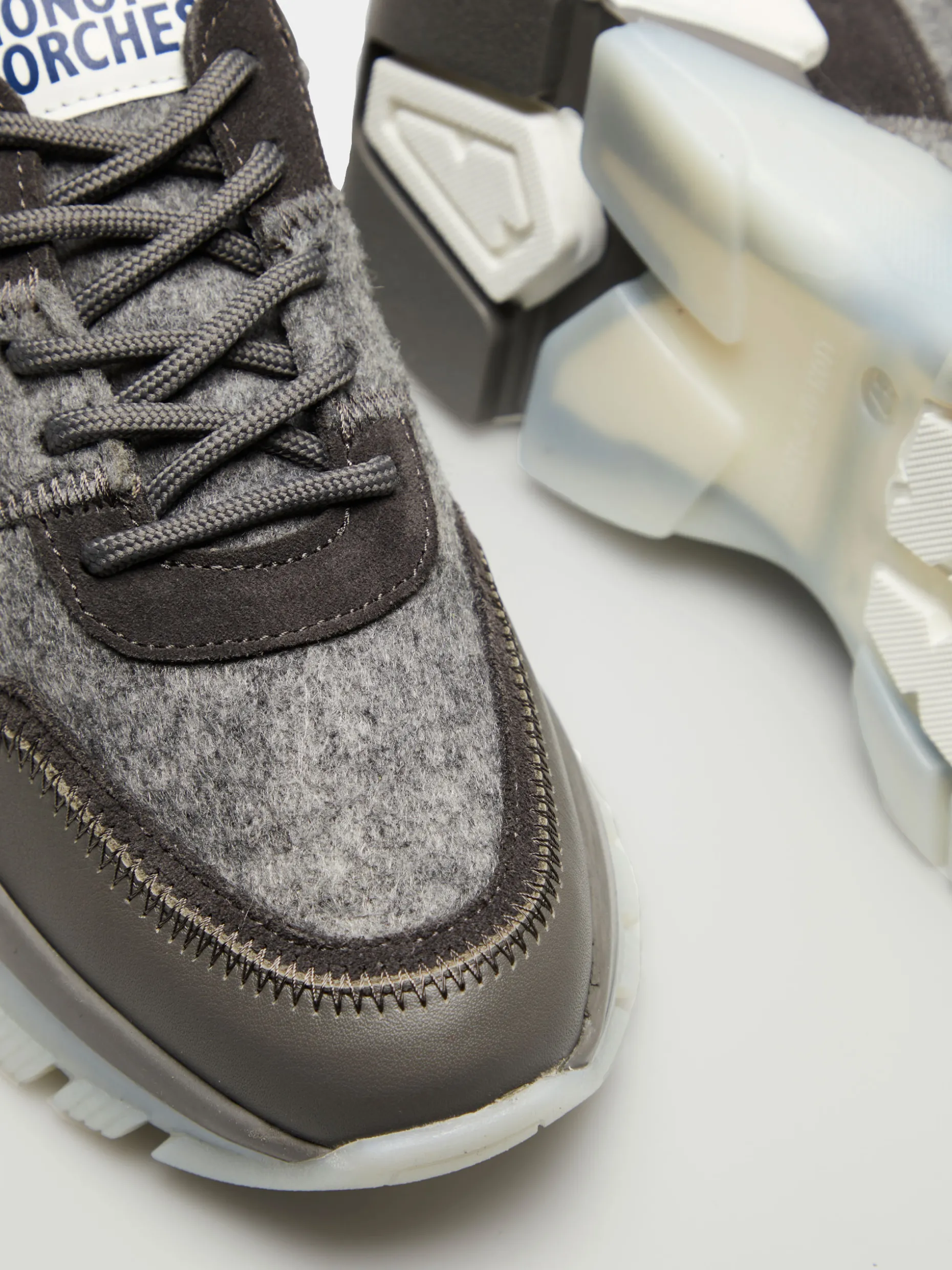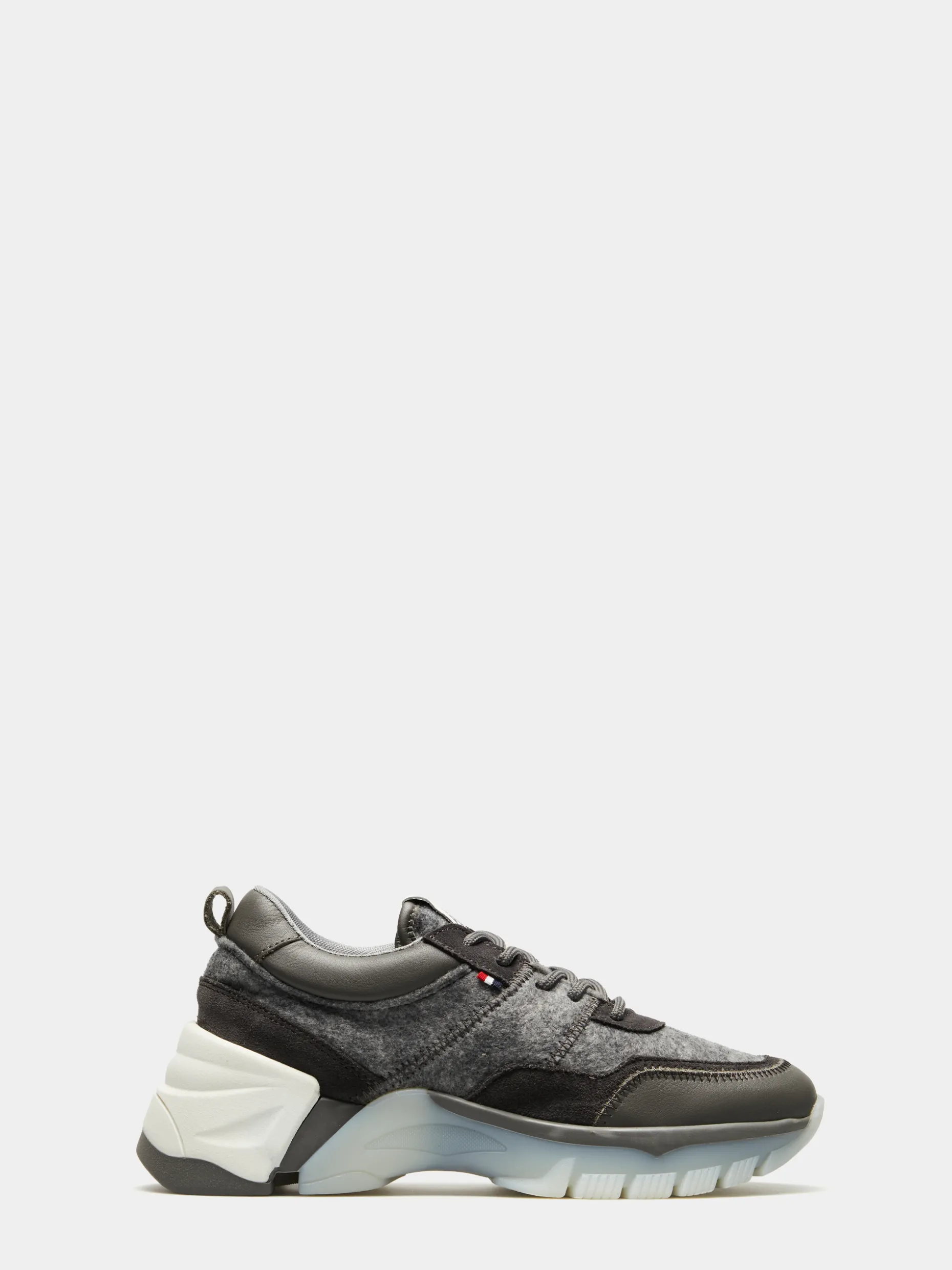 Sapatilha desportiva feita em pele e feltro com cordões cinzentos. Forro natural de coelho, detalhes corporativos e sola irregular translúcida e branca.