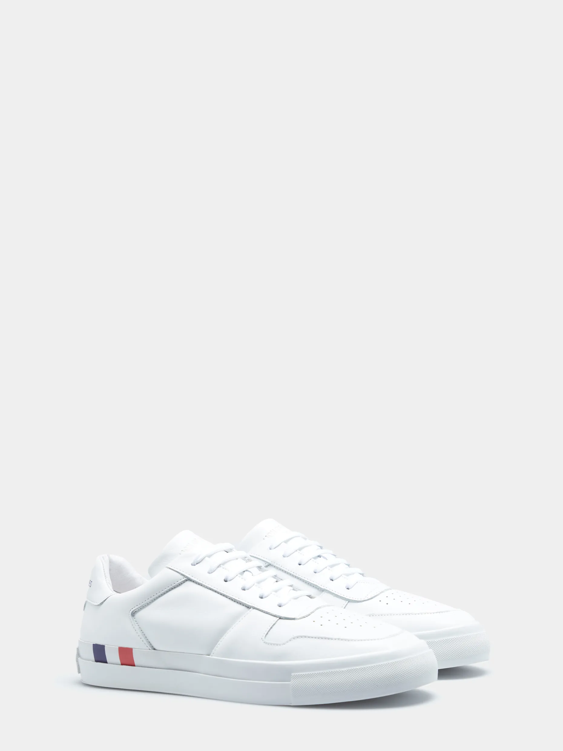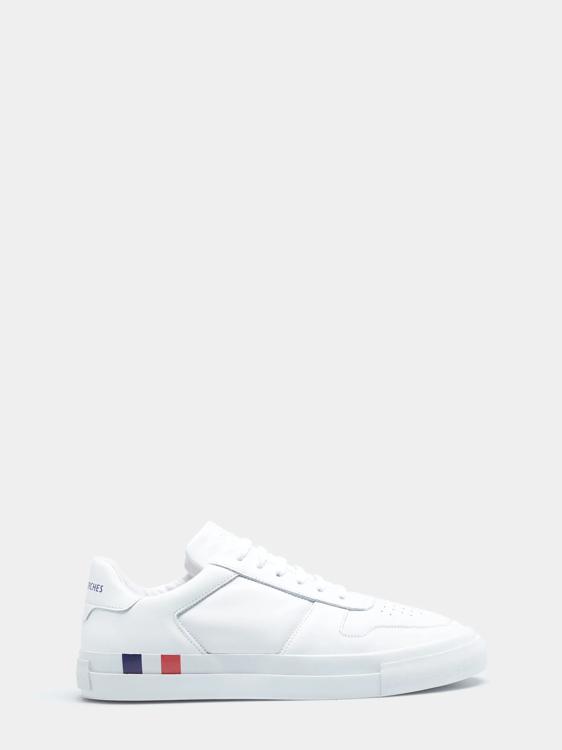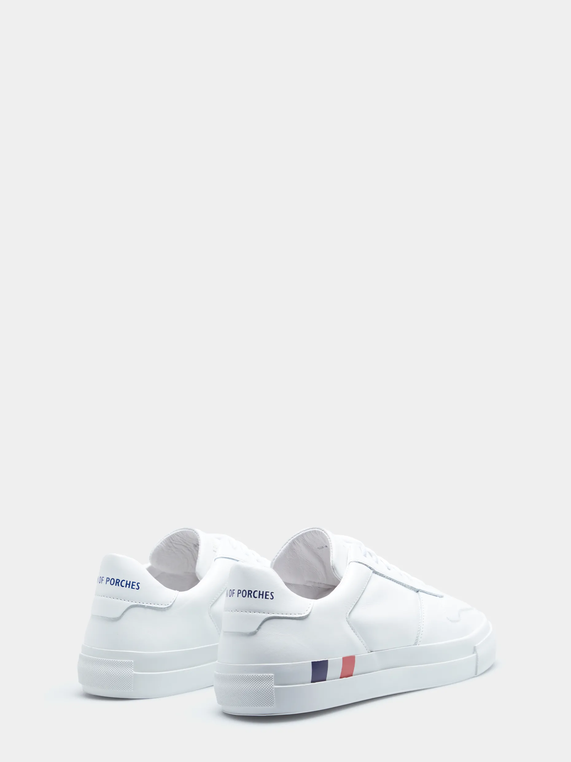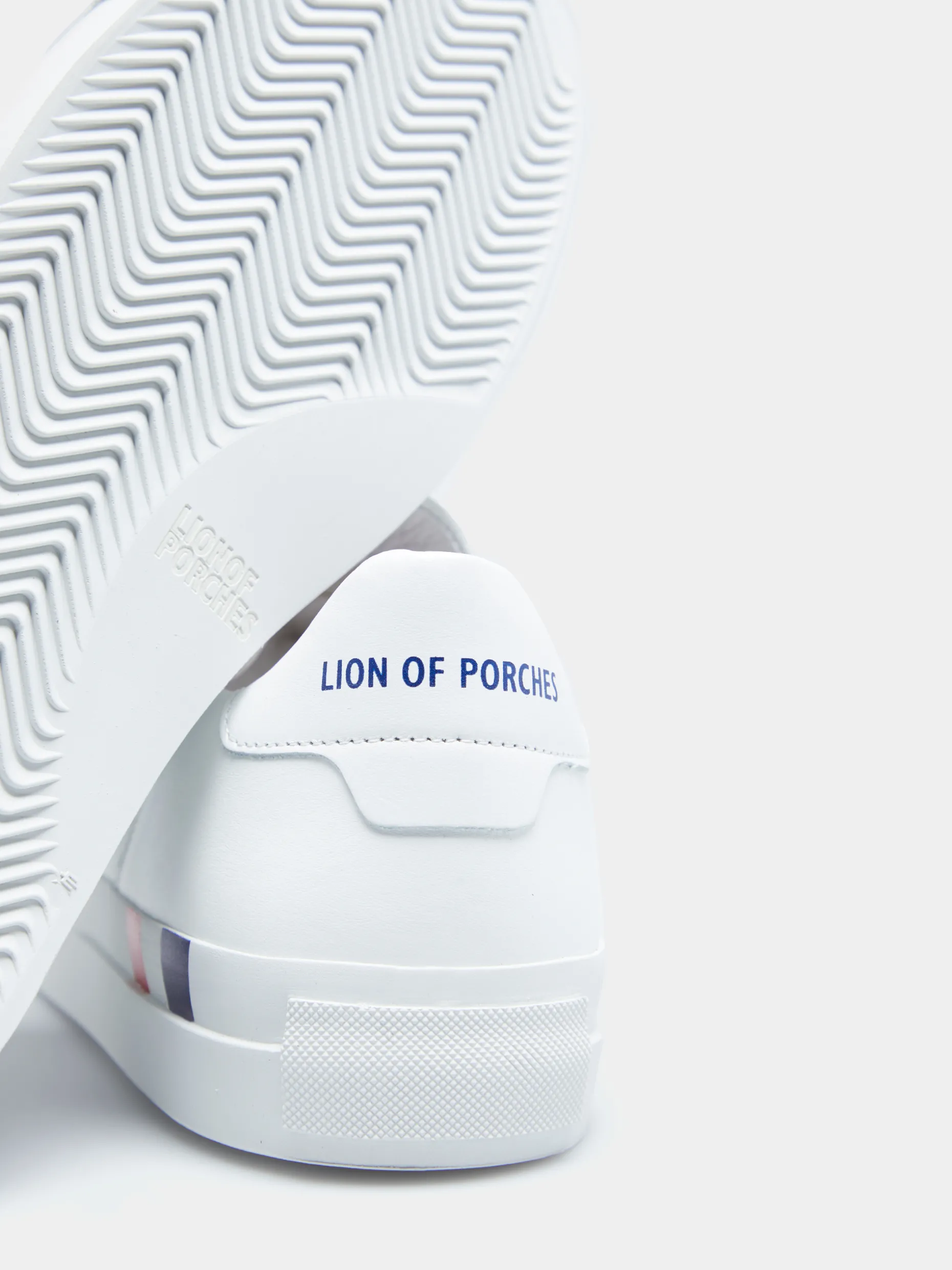 Sapatilhas brancas 100% pele. Apertam com cordões e apresentam o branding Lion of Porches no calcanhar. A sola é de borracha e apresenta a fita corporativa tricolor de lado.