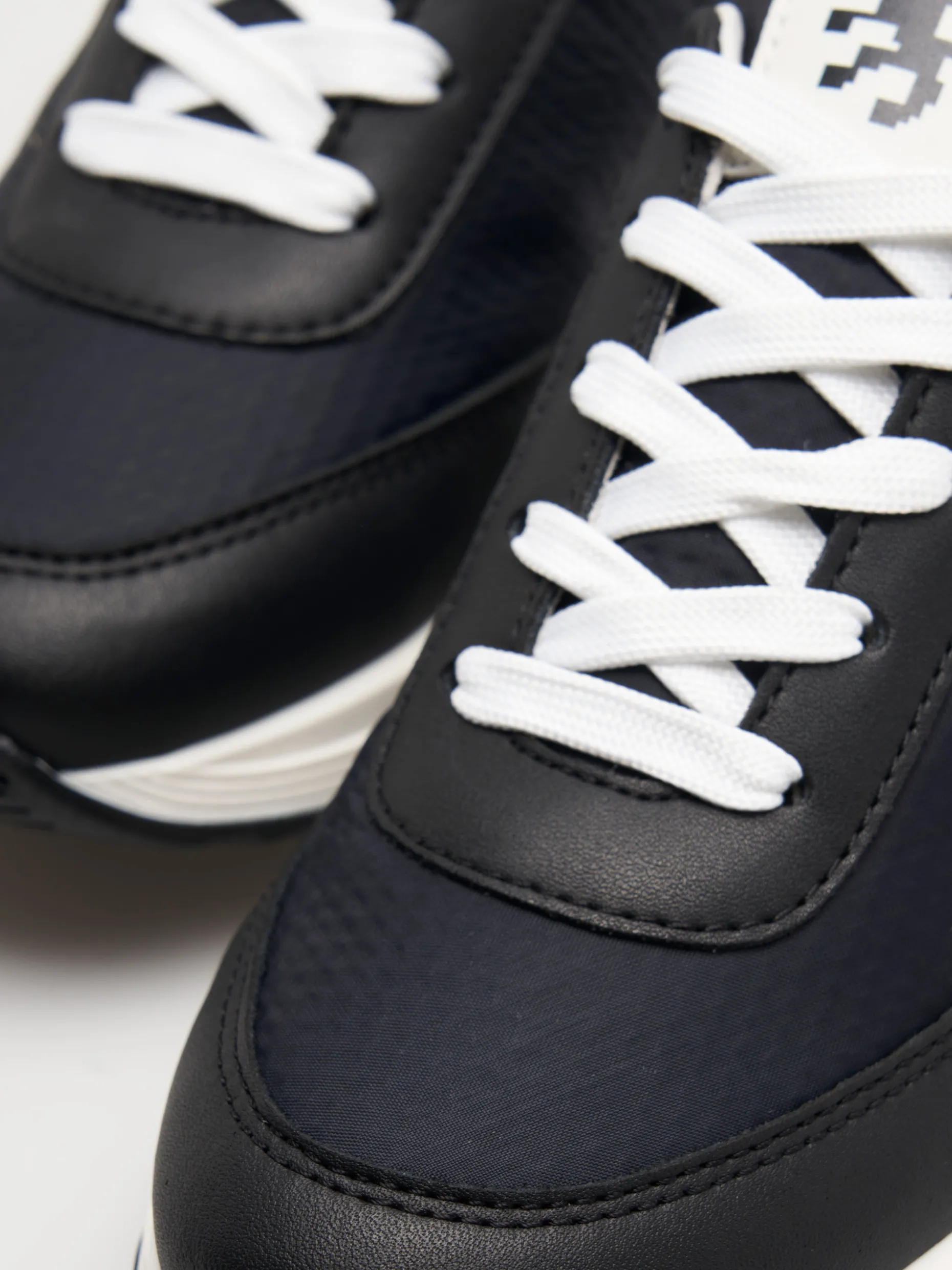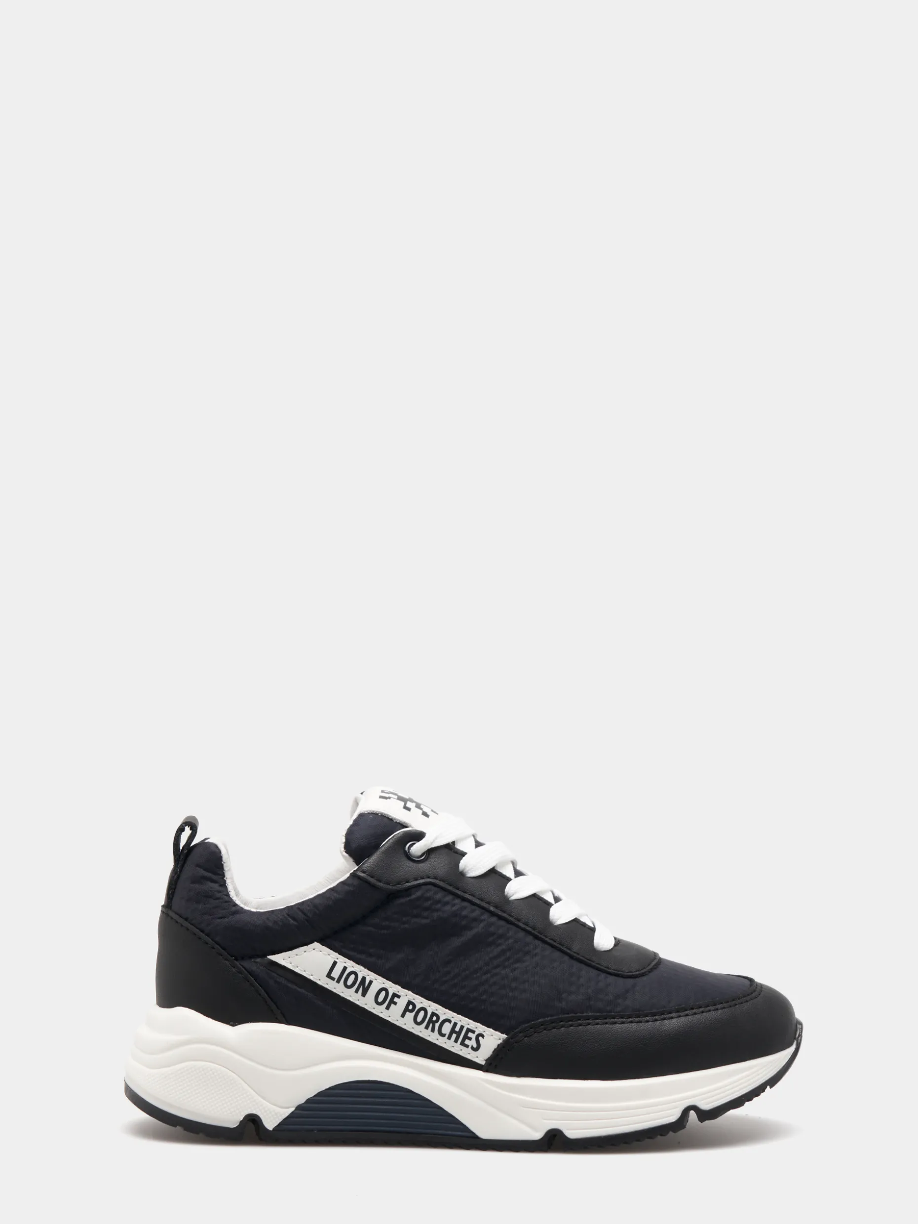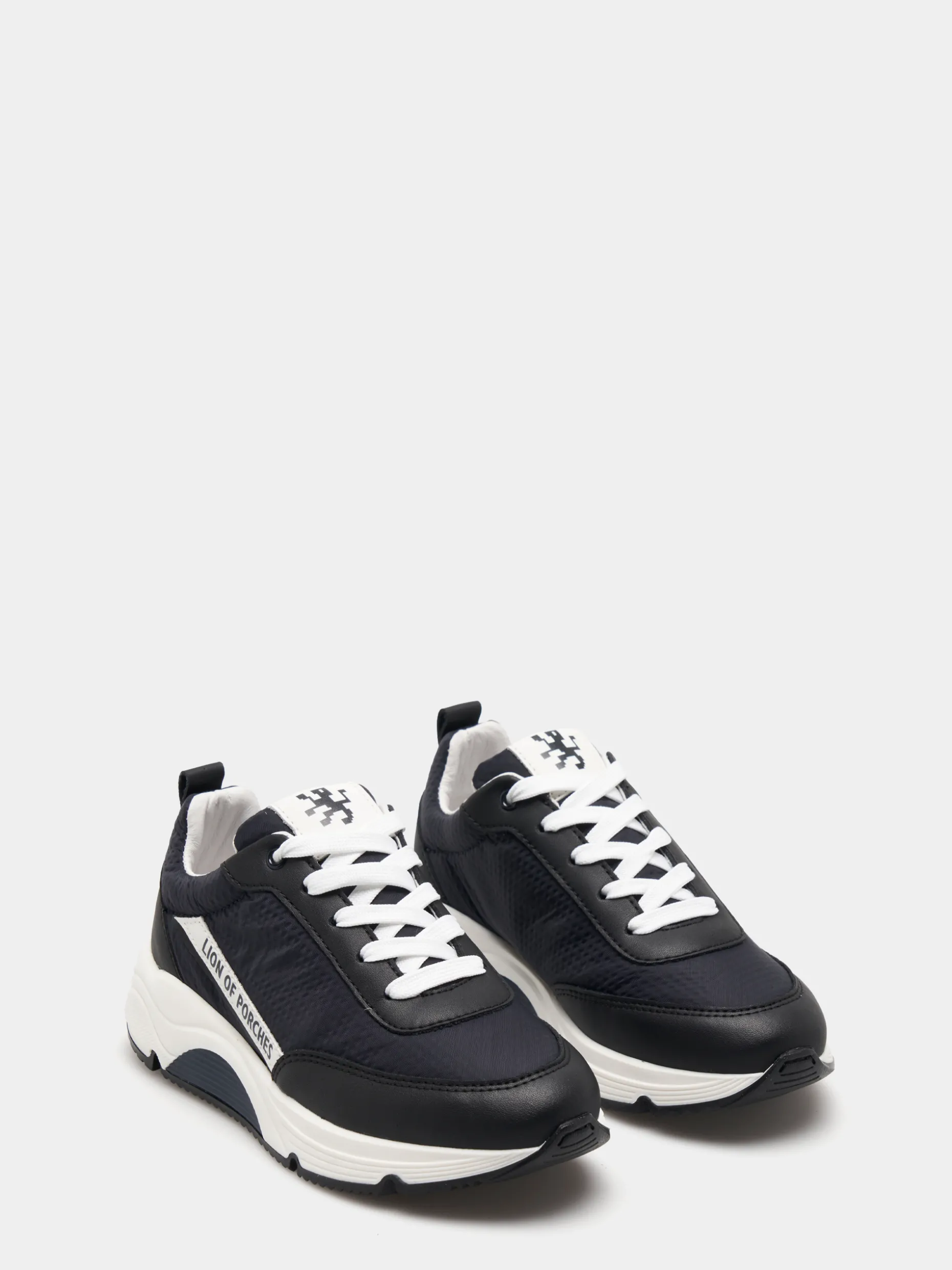 Sapatilhas bicolor combinadas em dois tons de azul. Apertam com cordões brancos em contraste de cor, tal como a sola. Logotipo da marca em contraste na lateral e na língua.