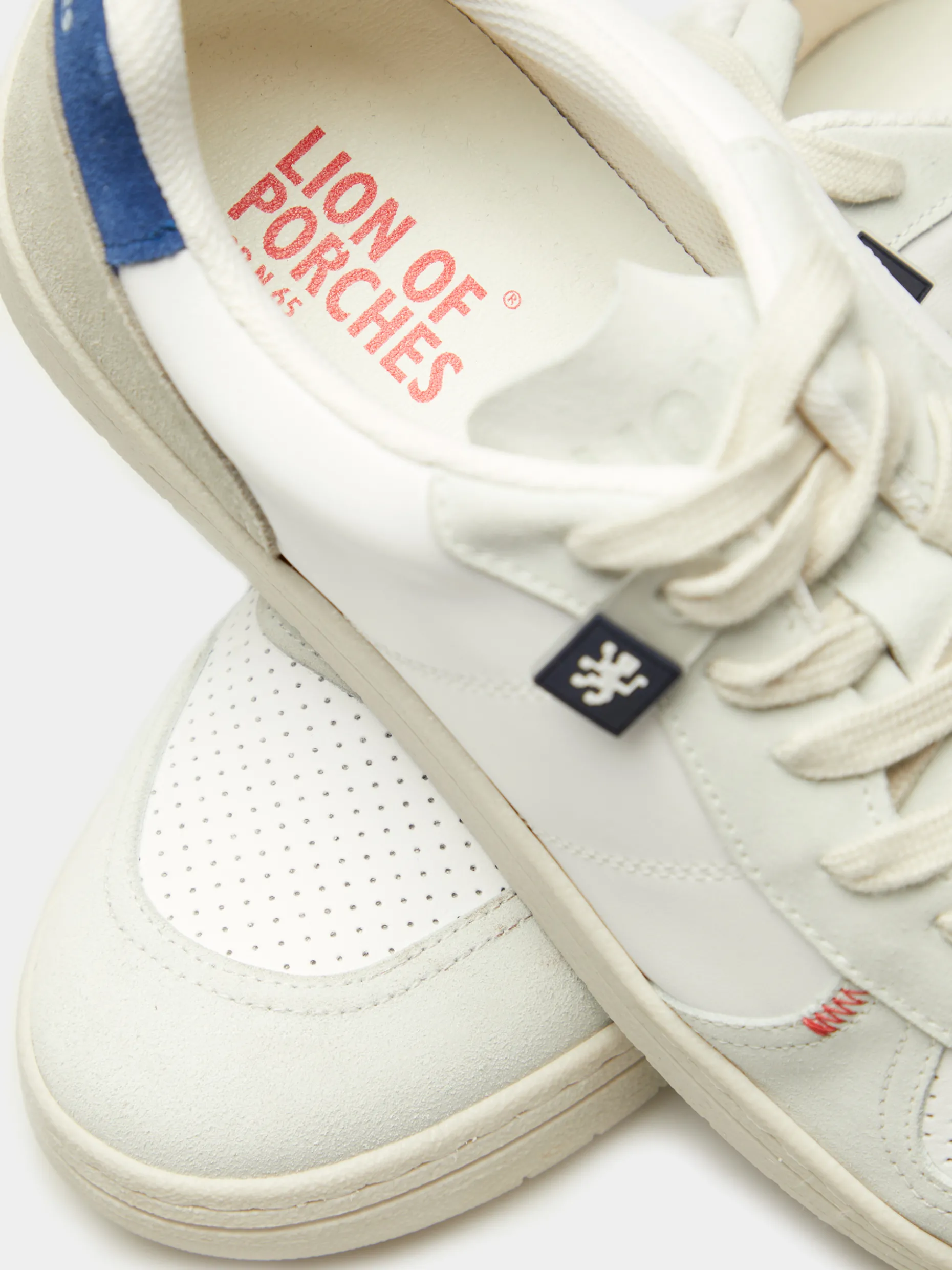 Sapatilhas casuais em camurça e pele com sola de borracha. Os detalhes microperfurados na frente permitem maior respirabilidade e dão ao calçado um toque mais leve. Apertam com cordões brancos e finalizam com logotipo estampado a serigrafia na parte de trás. Pormenor na lateral com pesponto em zig-zag a vermelho. Produzidas em Portugal.