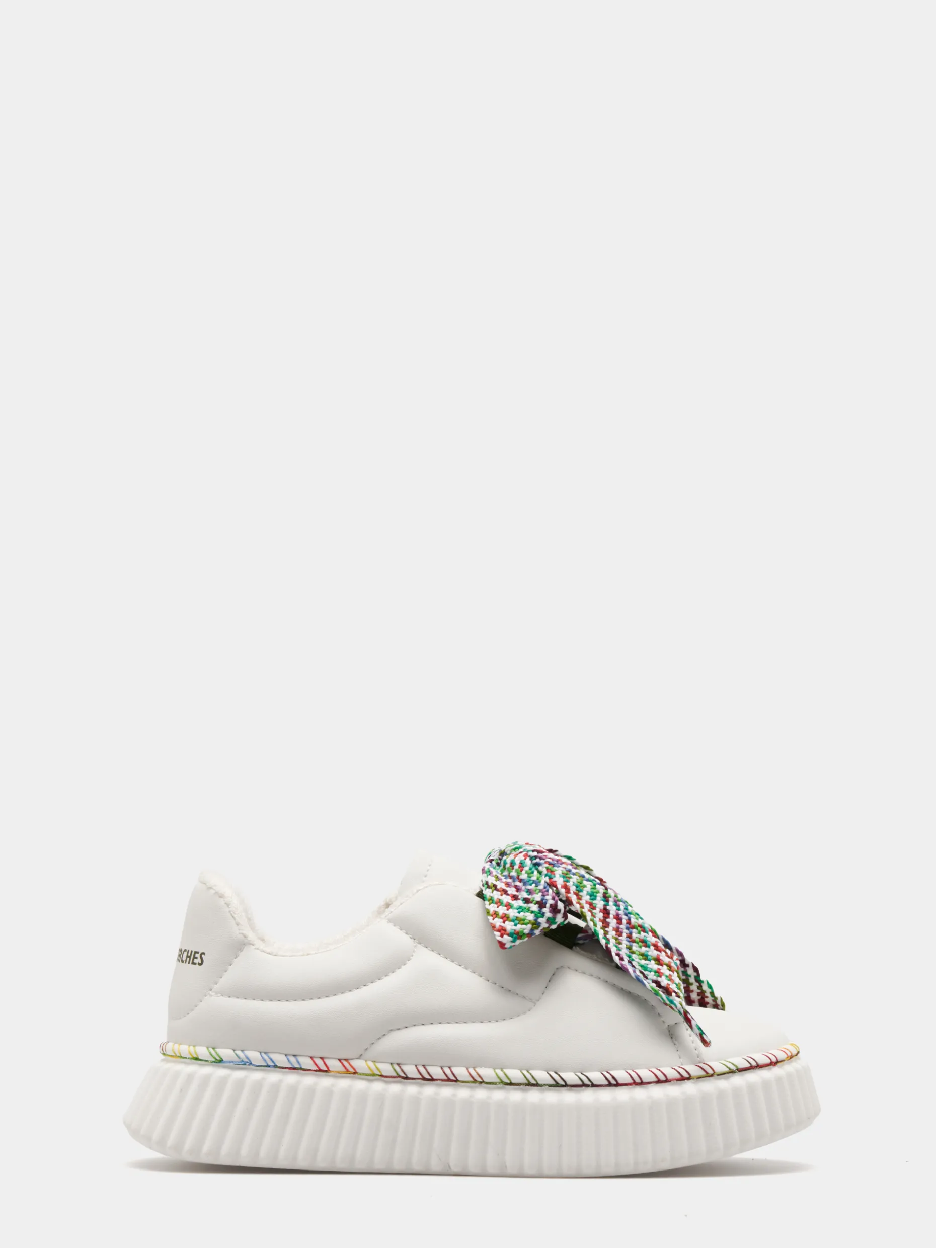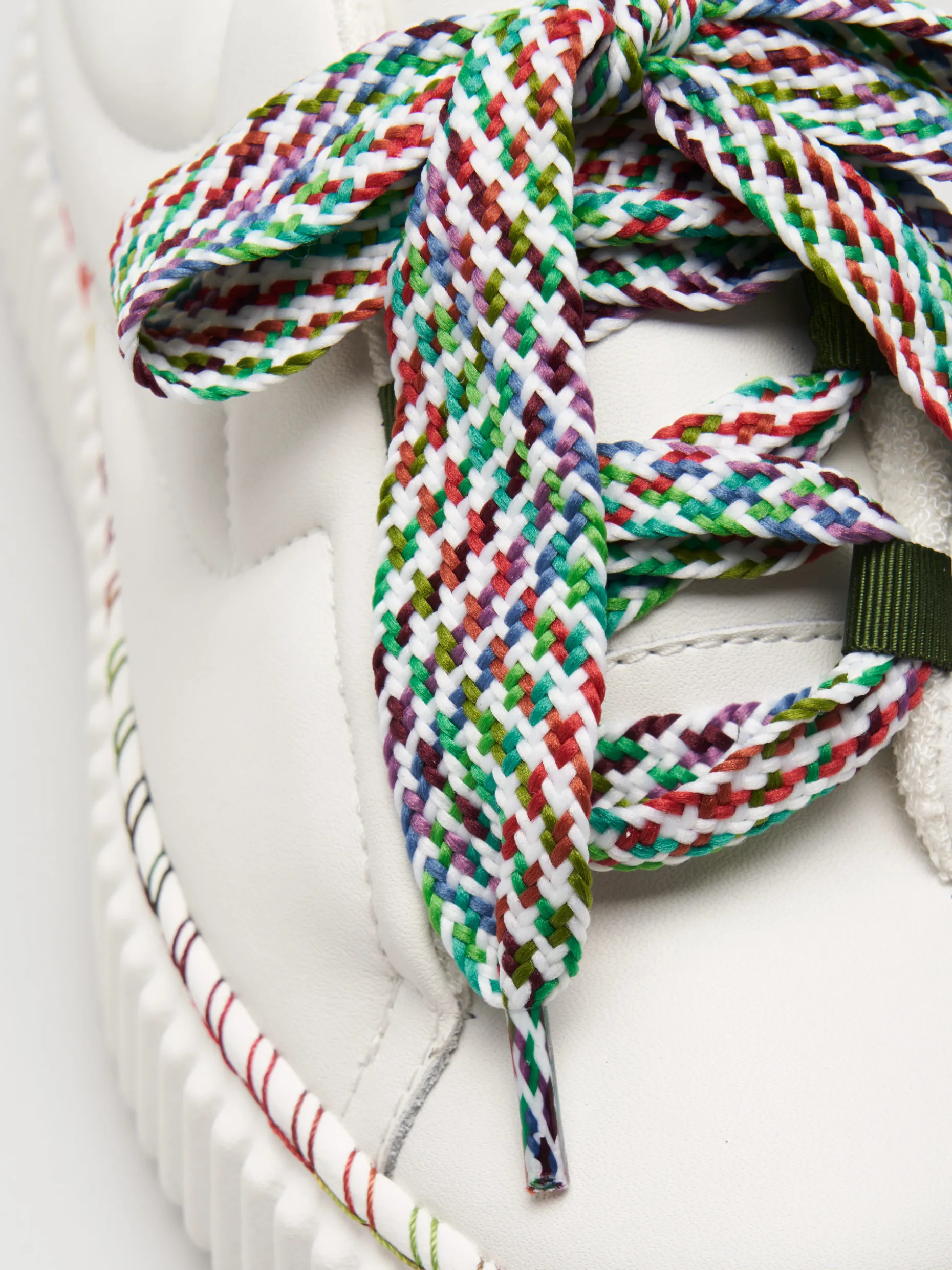 Sapatilhas elegantes em pele, brancas, com pormenor divertido de várias cores na sola. Os cordões são também multicolor. Finalizam com estampado Lion of Porches em contraste no calcanhar.