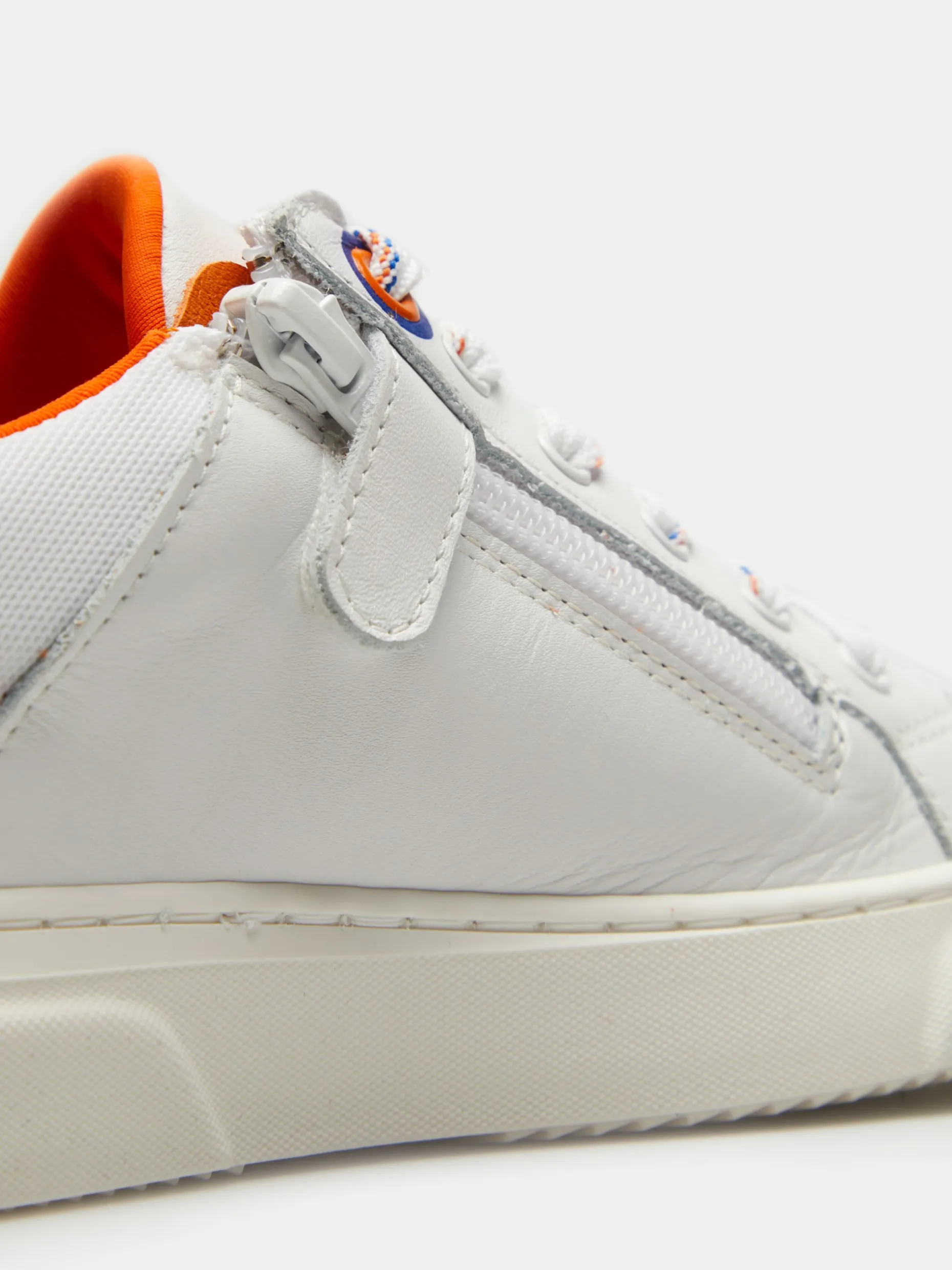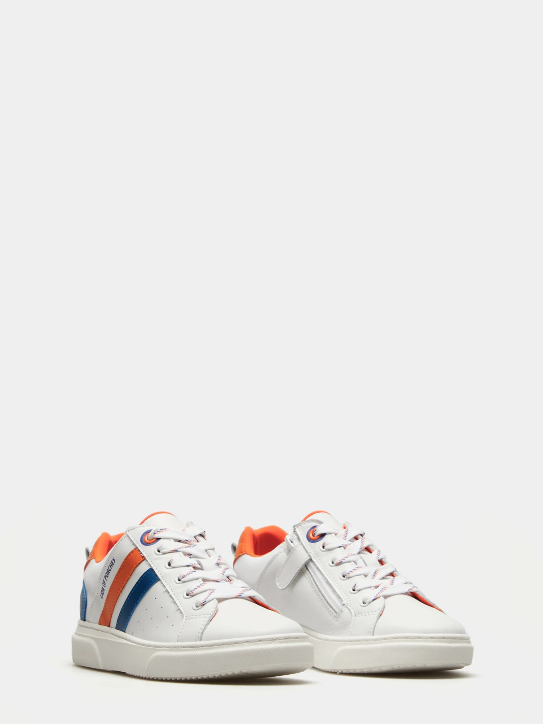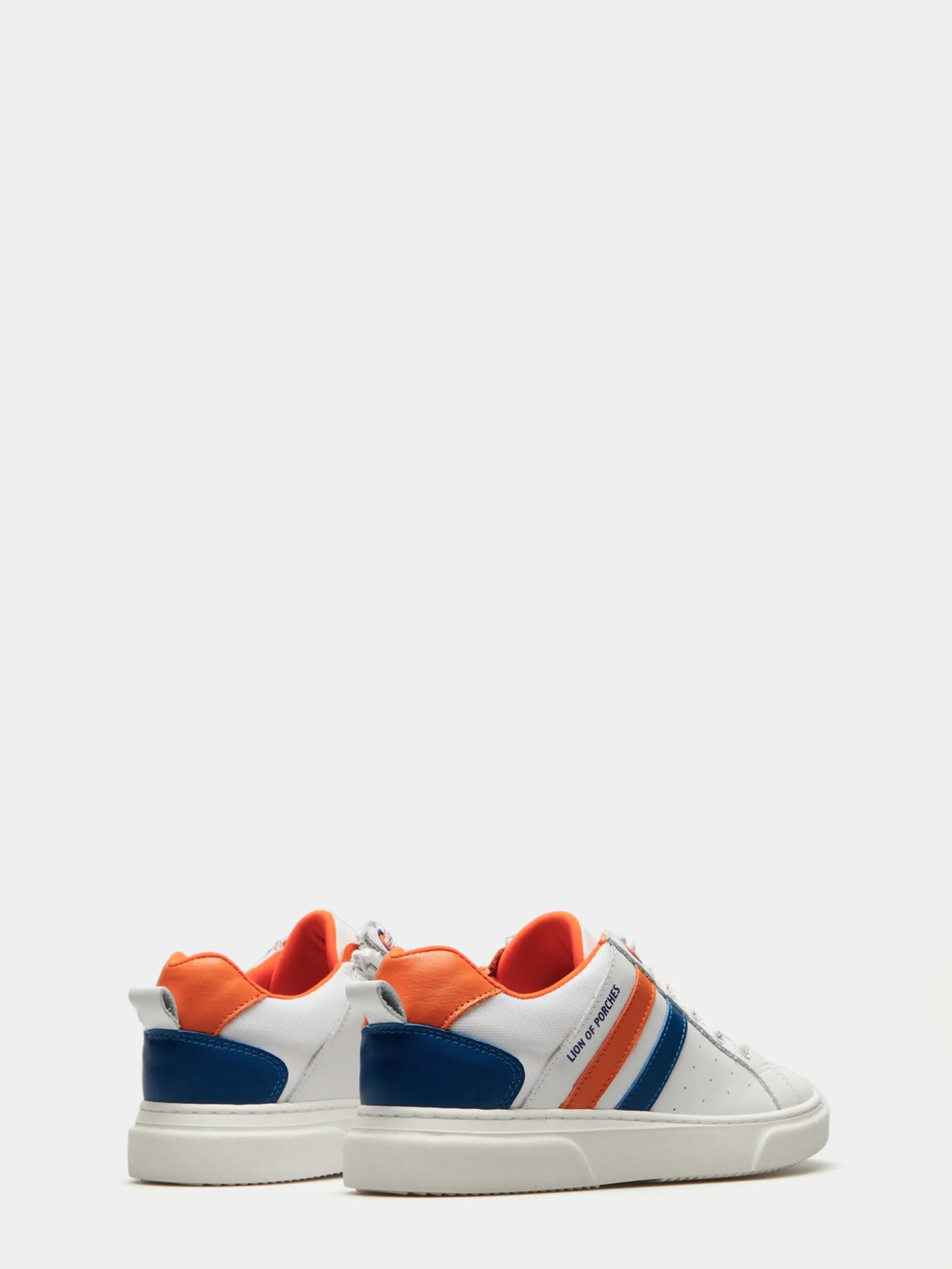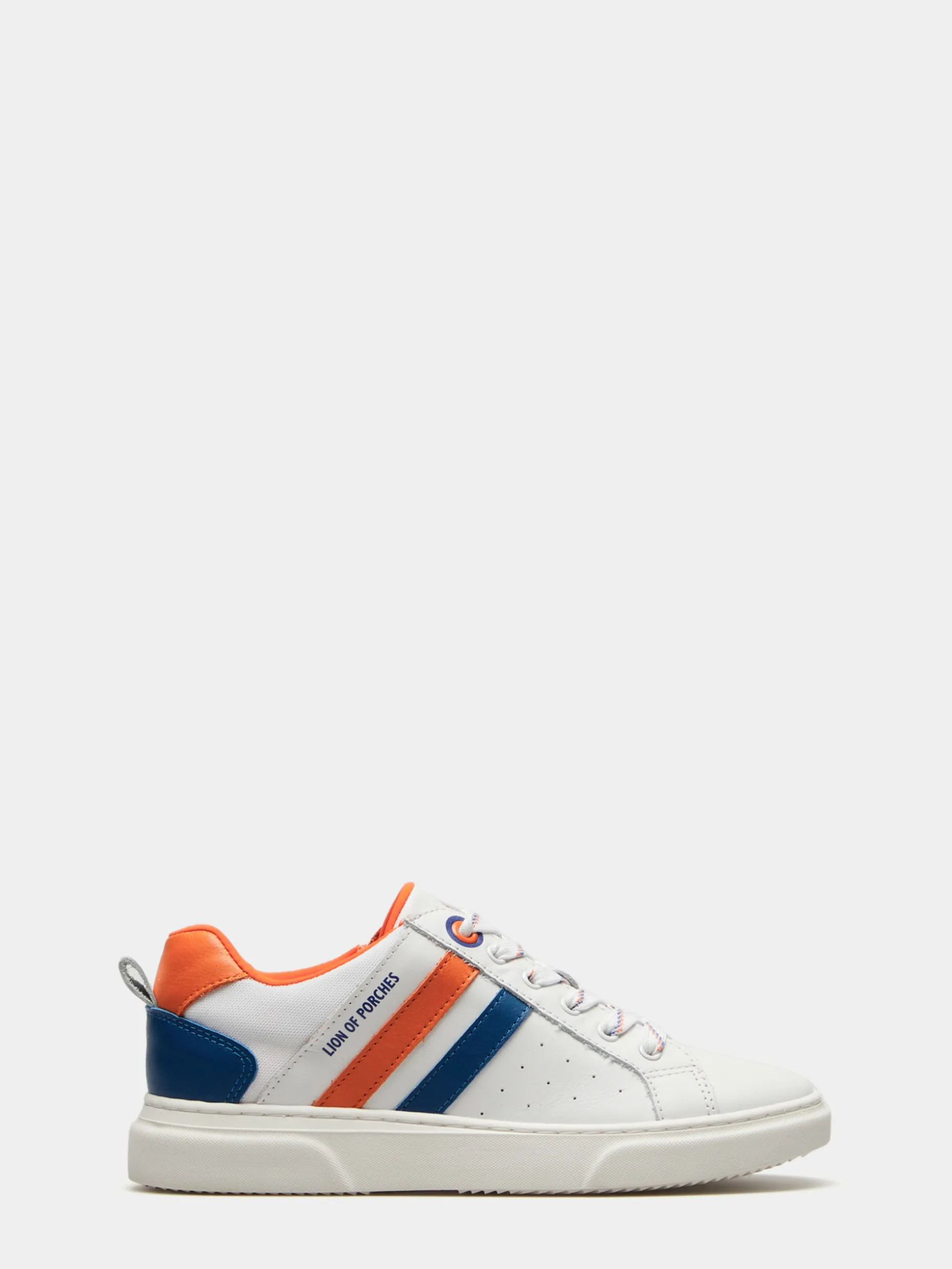 Sapatilhas desportivas combinadas com cordões e fecho na lateral para maior conforto ao calçar. A base é lisa com pormenor diferenciador de calcanhar e barras nas laterais em contraste de cor. Os cordões são tricolor e a sola em borracha. Detalhe perfurado nas laterais que promovem a respirabilidade. Branding Lion of Porches na lateral. Modelo unissexo.