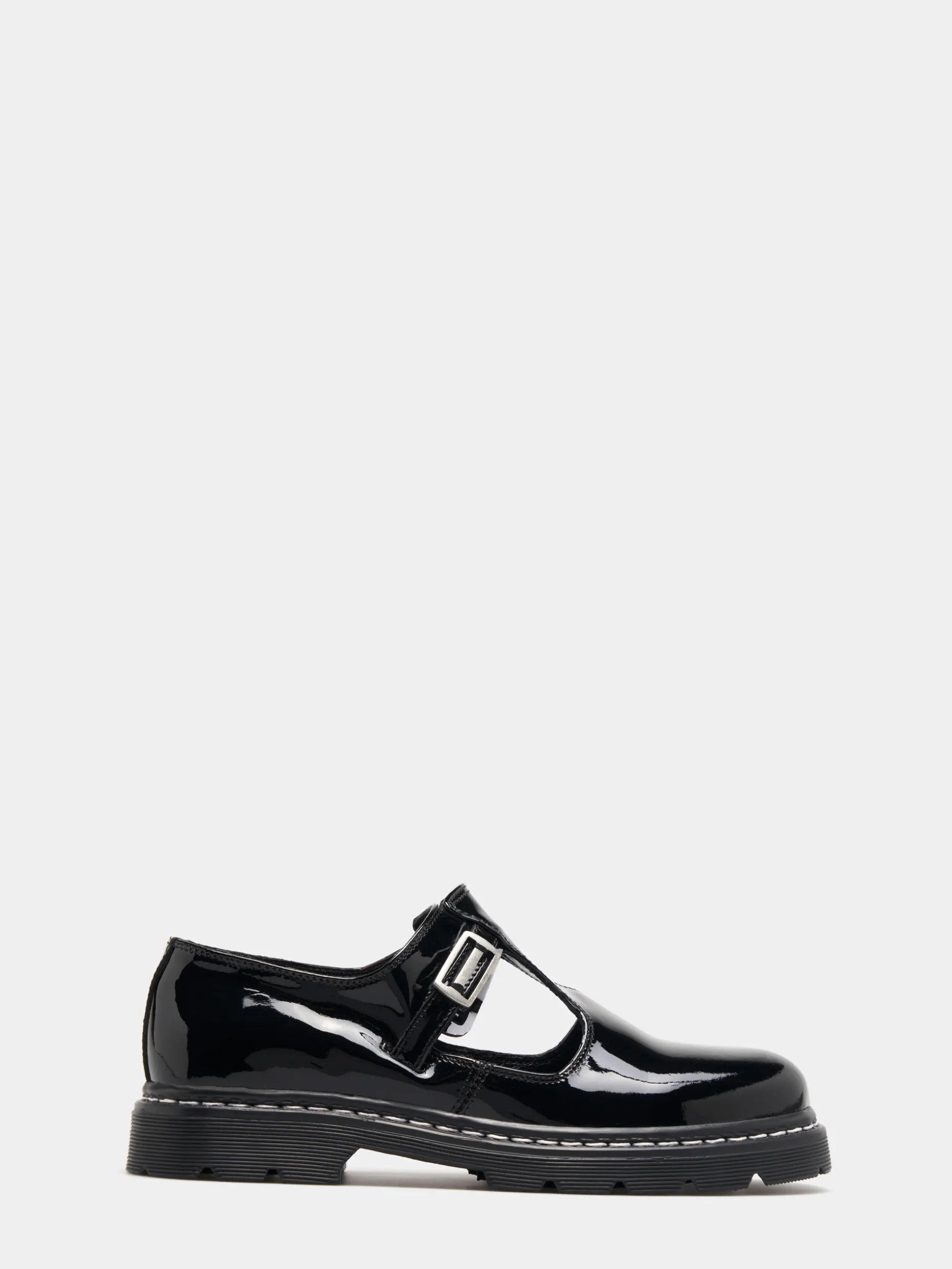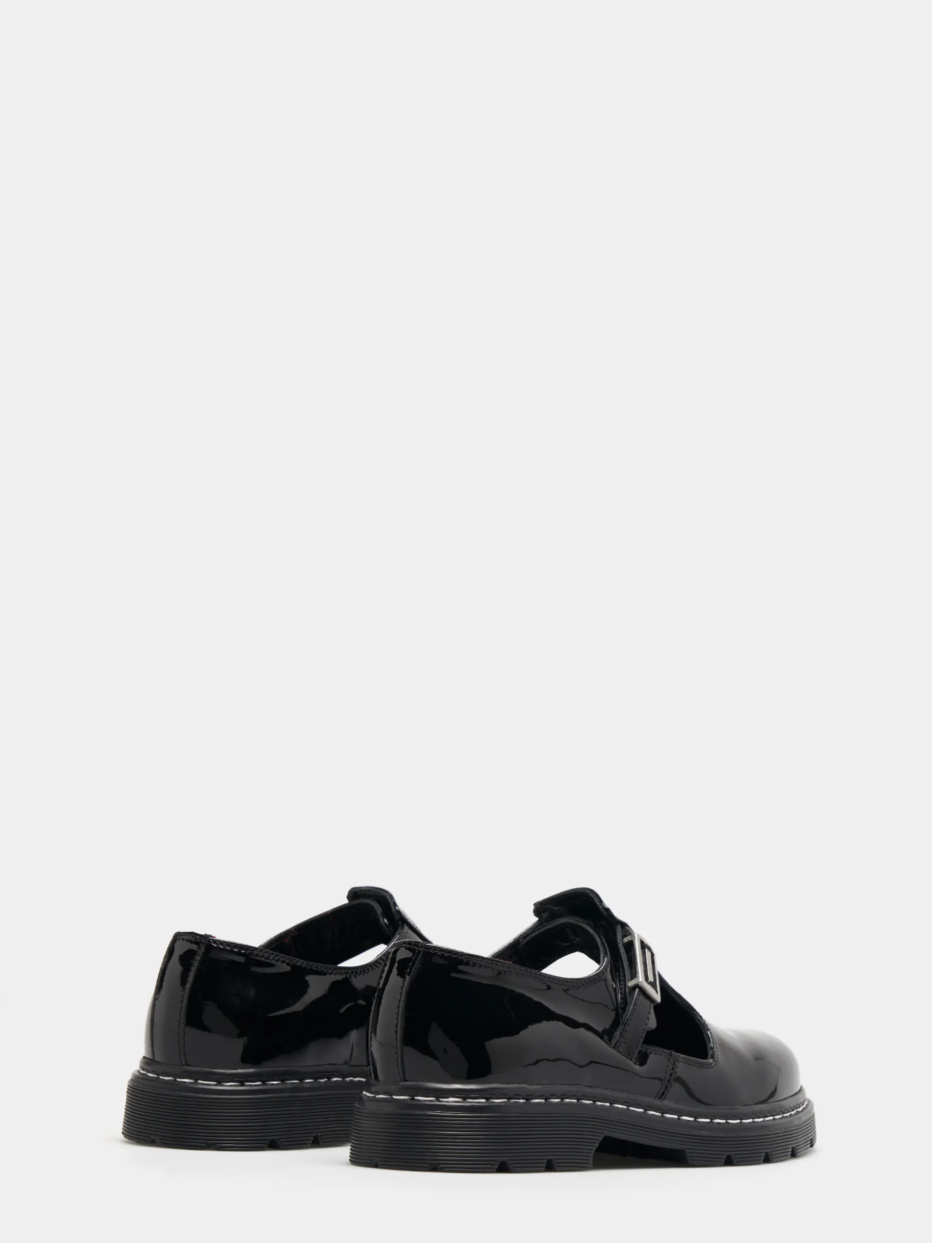 Sapatos envernizados, de sola redonda, abertos no peito. Uma peça exclusiva utilizada no desfile de lançamento da coleção cápsula Lion of Porches x Paatiff, na última edição da Moda Lisboa. Apertam com fivela em metal escovado, igual ao cinto da mesma coleção. Sola texturizada.