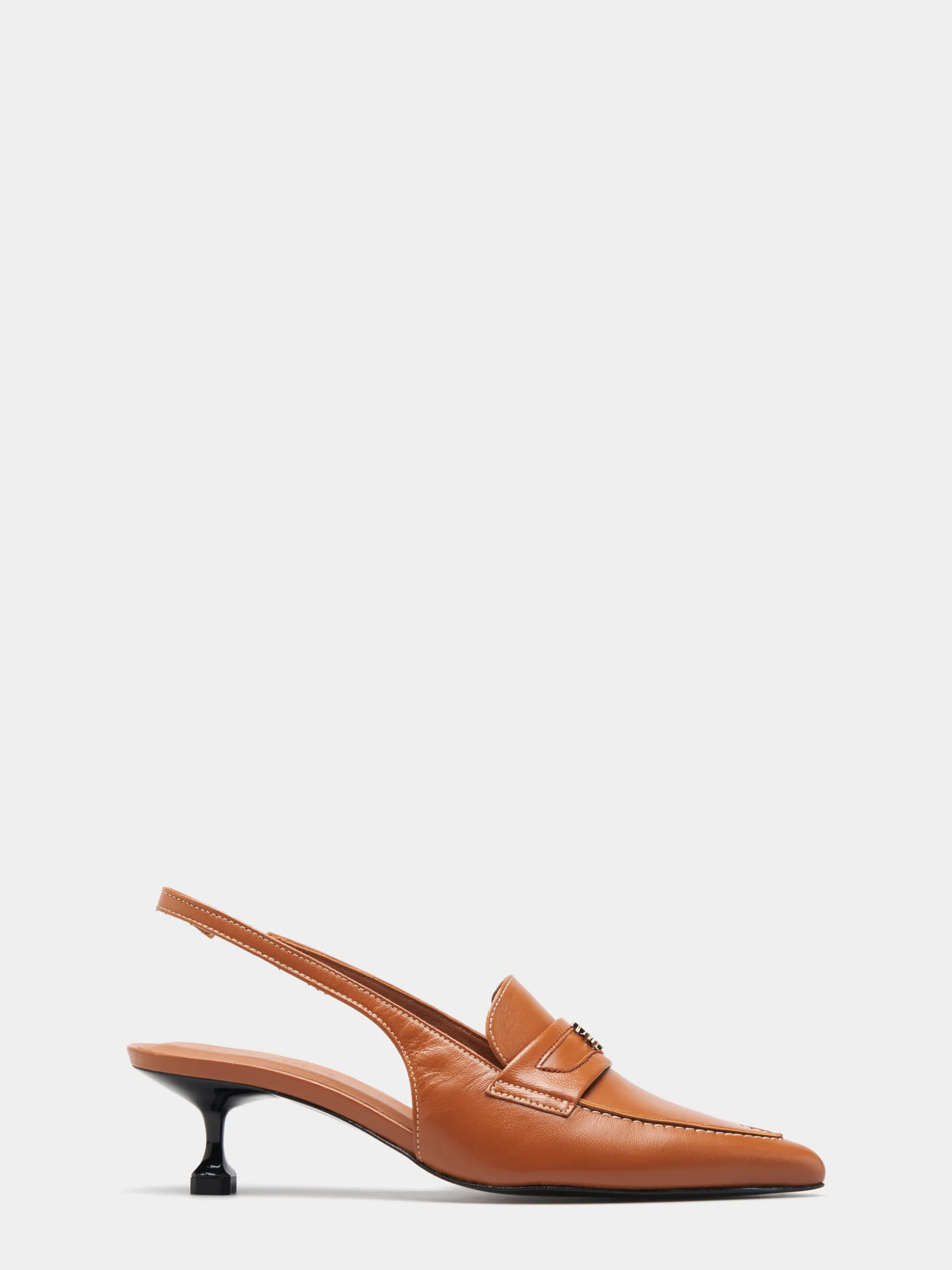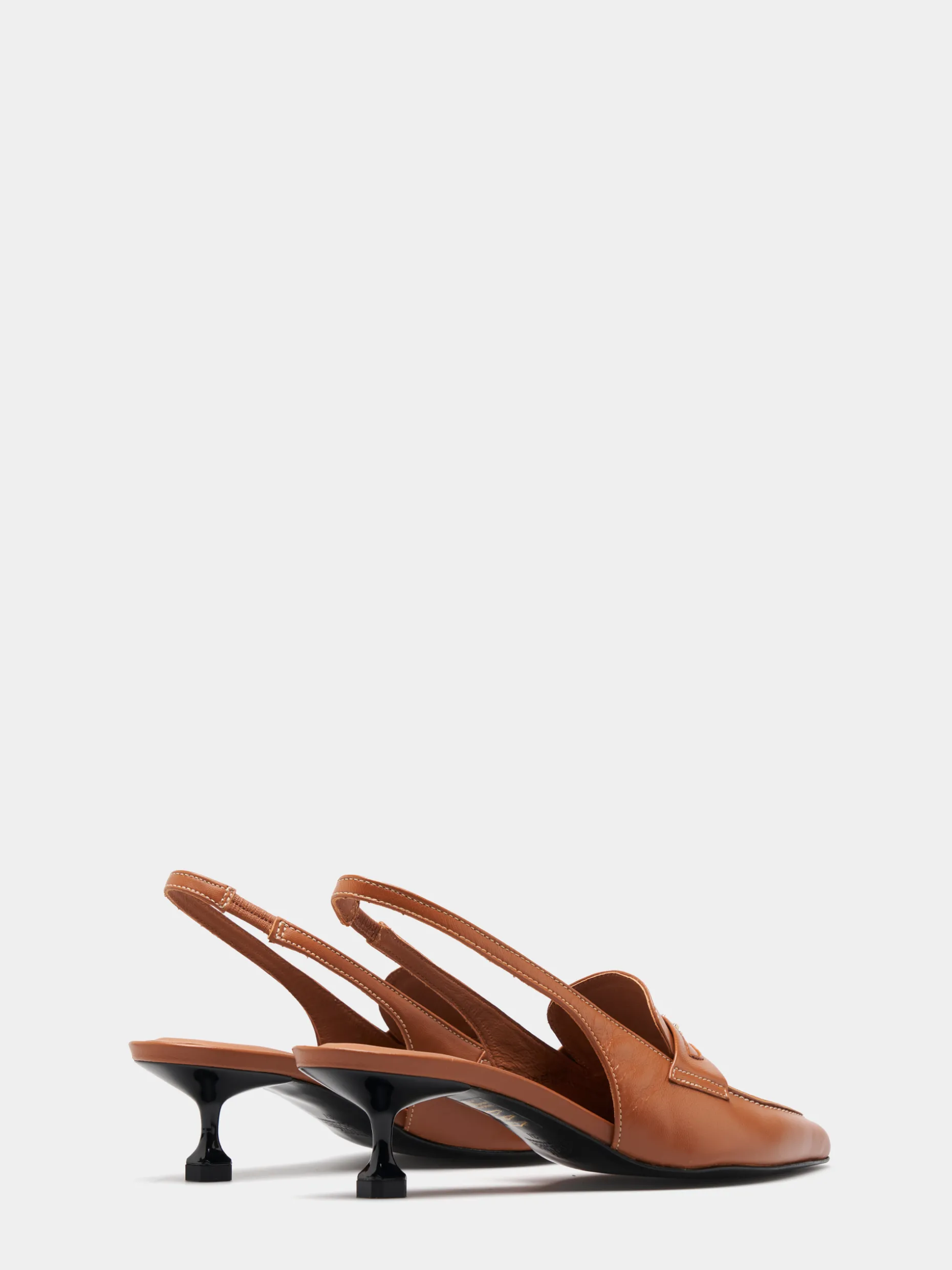 Sapatos mule com tacão kitten. De biqueira pontiaguda, tem pormenor elegante de aplicação metálica na parte dianteira. A tira traseira tem peça elástica para maior conforto. Altura do tacão: 4,5cm.