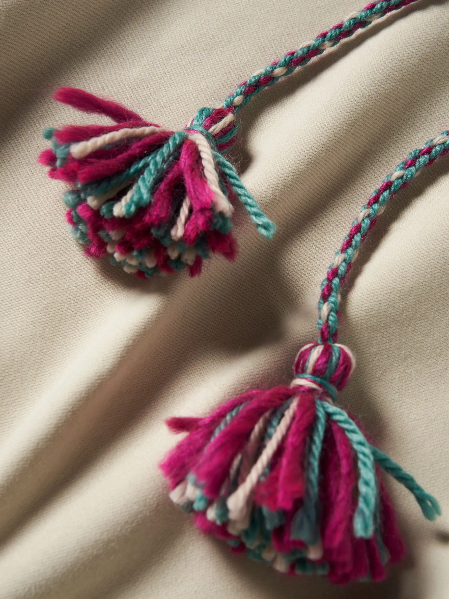 Sweater lisa com capuz. Pormenor colorido de bordado jacquard nas mangas e cordões a ajustar o capuz feitos em fio de lã com pompons na ponta. Confecionada em algodão para maior conforto.
