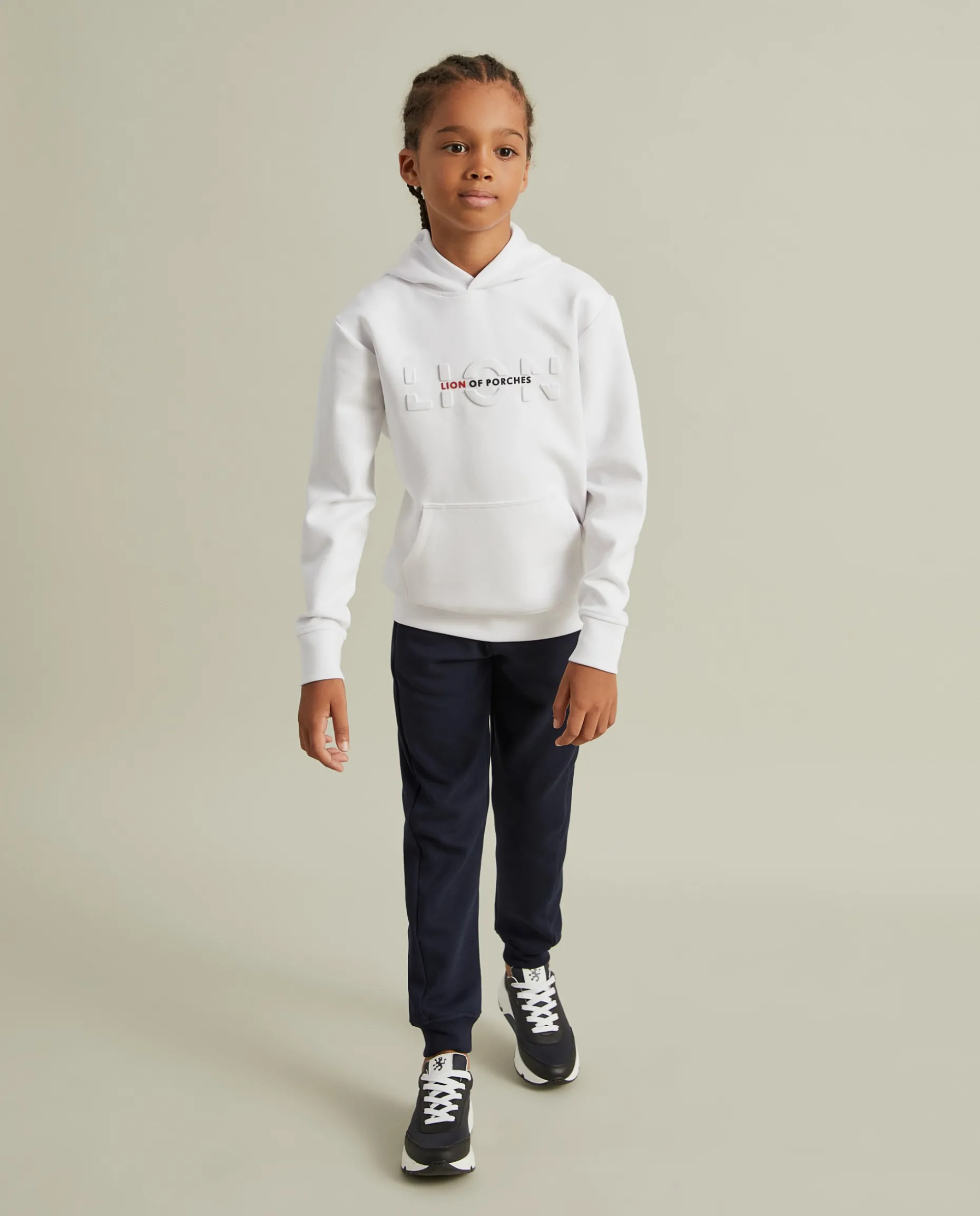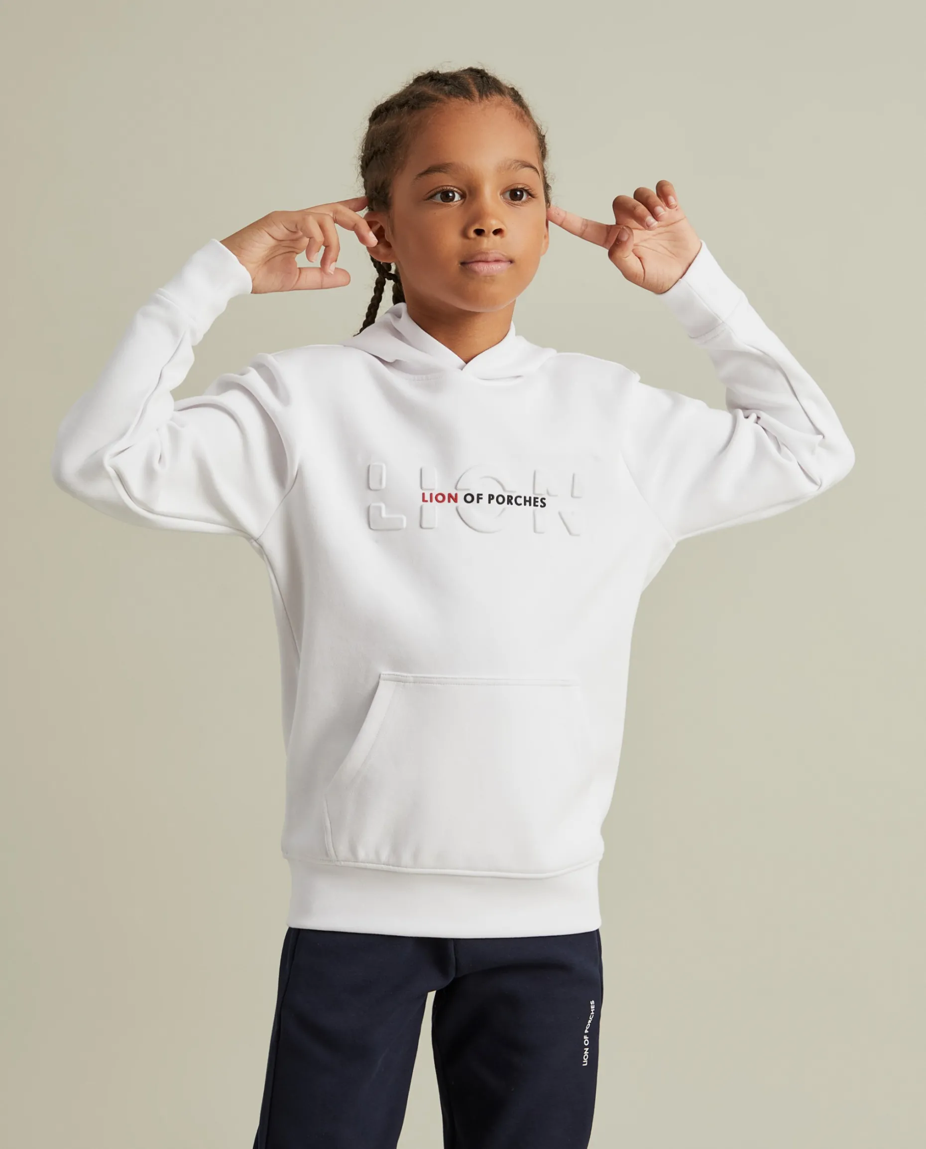 Sweater de manga comprida, cor lisa, com capuz. Pormenor de logotipo em relevo e estampado no peito. Bolso canguru.