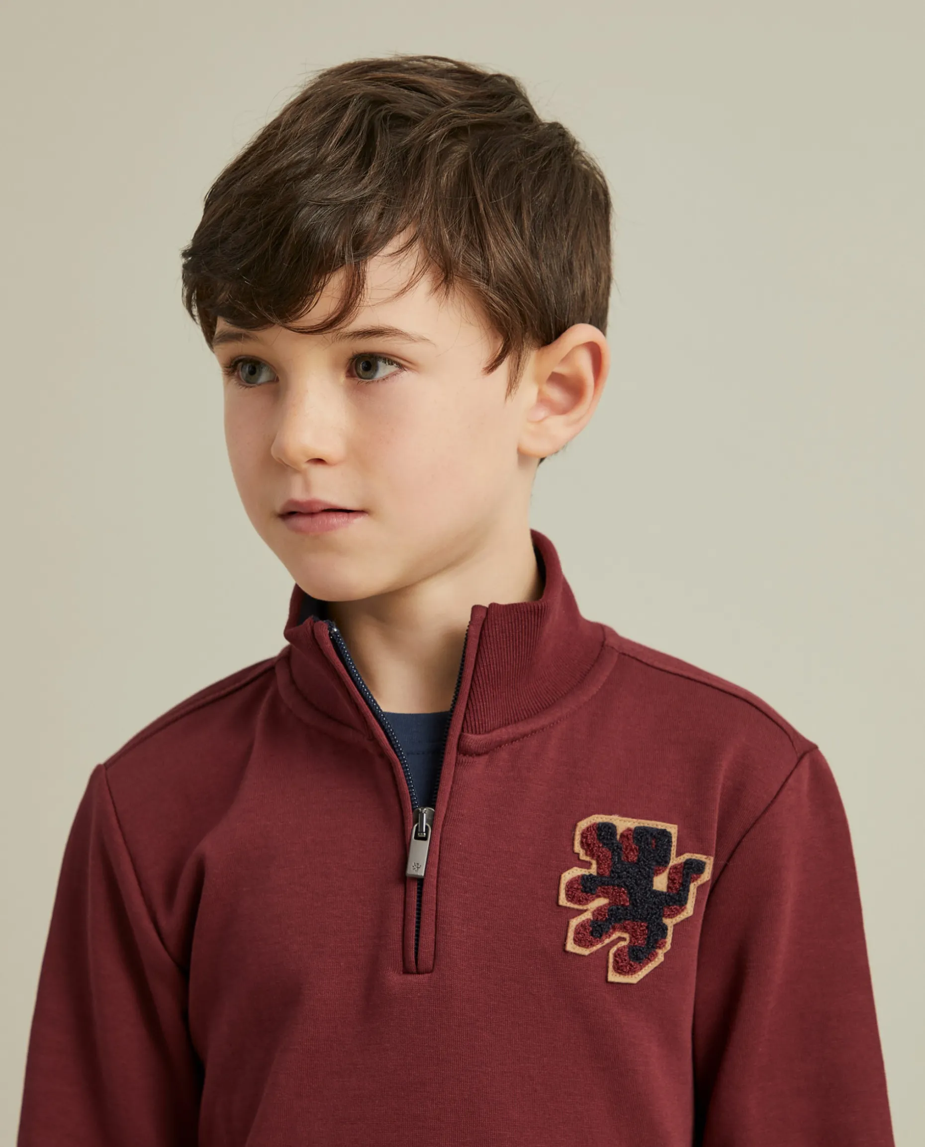 Um essencial no guarda-roupa dos miúdos é esta sweater de manga comprida, de gola alta, com meio fecho. De cor lisa, com leão bordado no peito. Pormenor de risca na cintura e punhos em contraste de cor. Confecionada em algodão para maior conforto e suavidade.