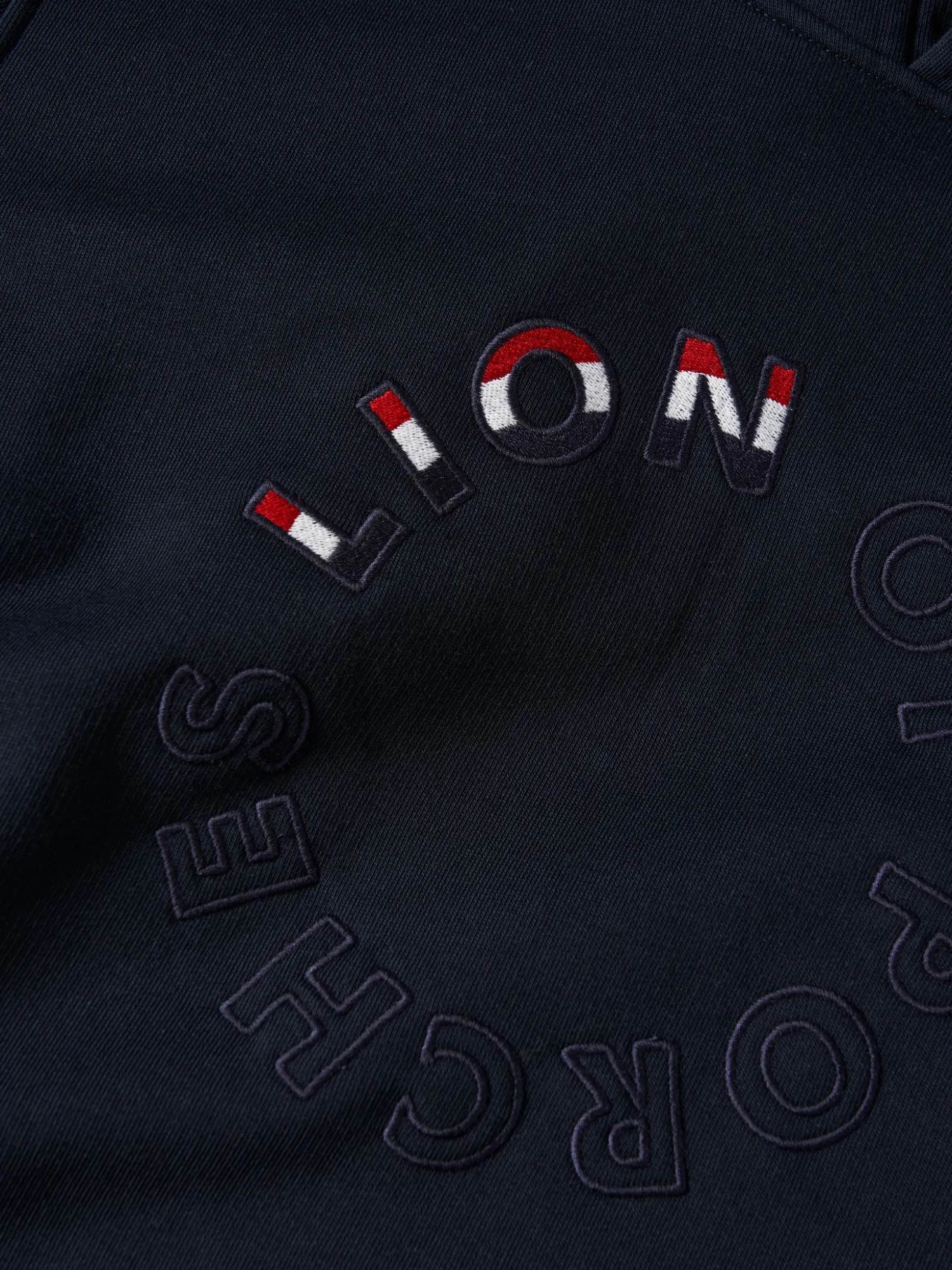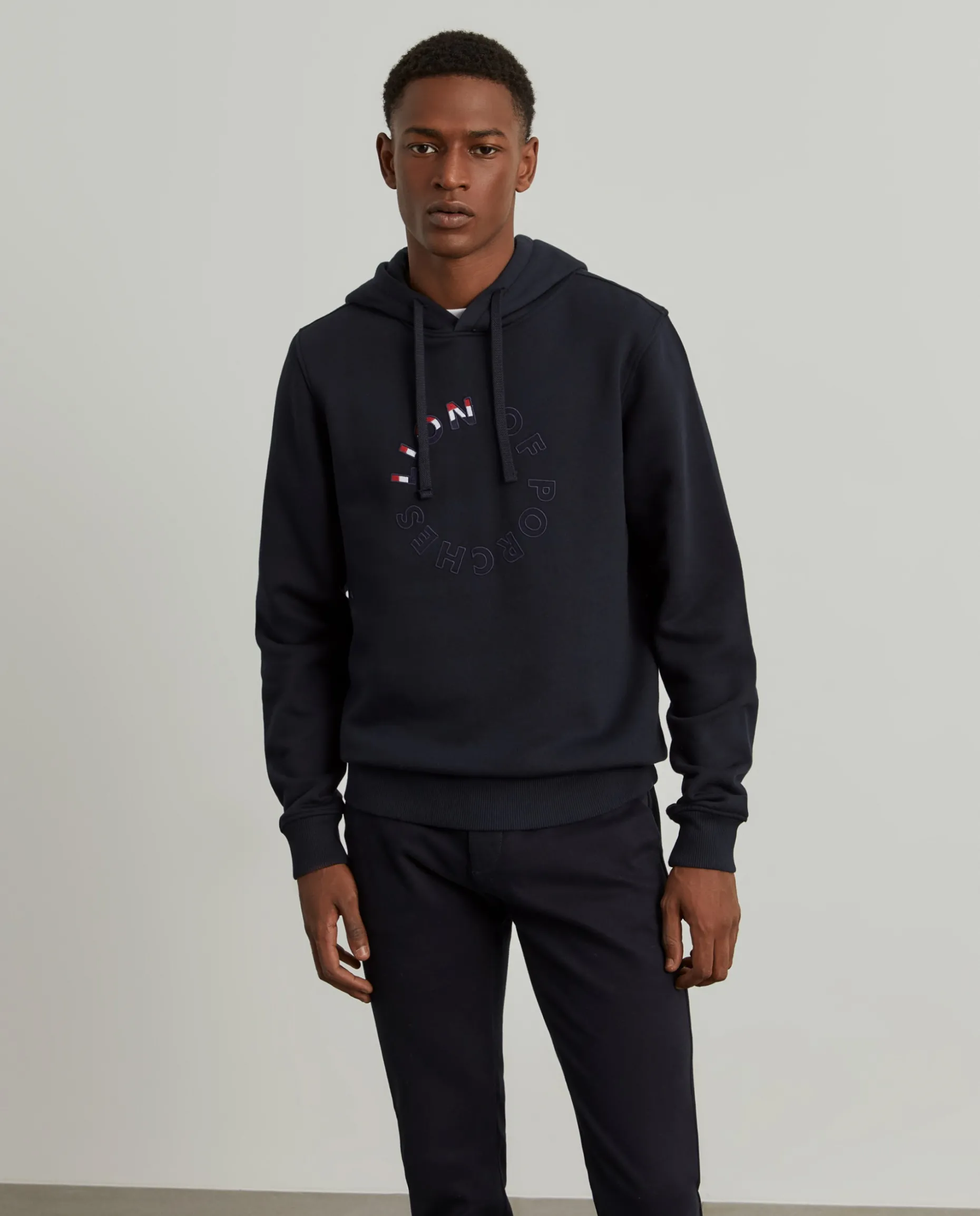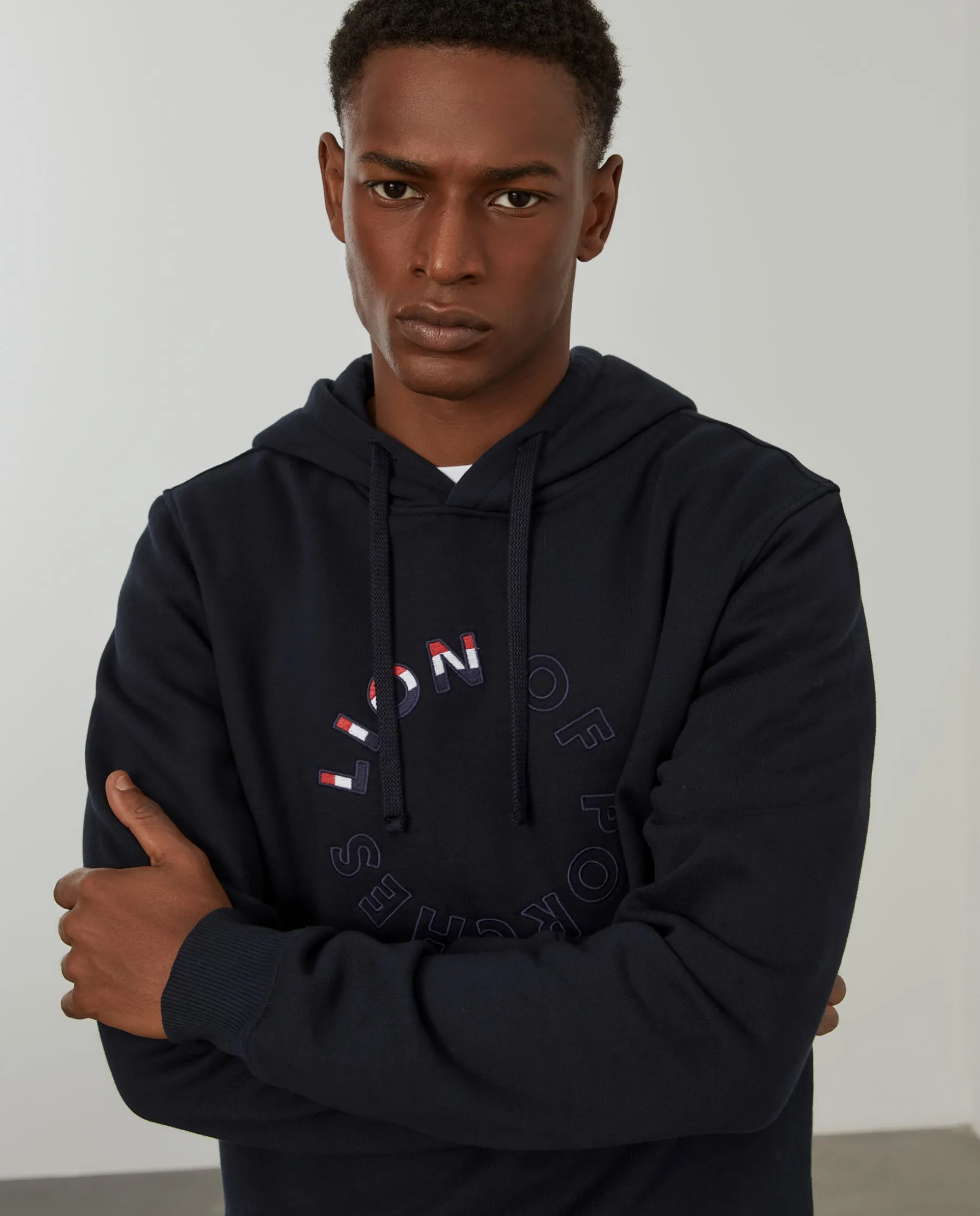 Um essencial num guarda-roupa descontraído e confortável, esta sweater de manga comprida tem capuz ajustável e bordado Lion of Porches na frente. A base e punhos são canelados. É confecionada, na totalidade, em algodão.