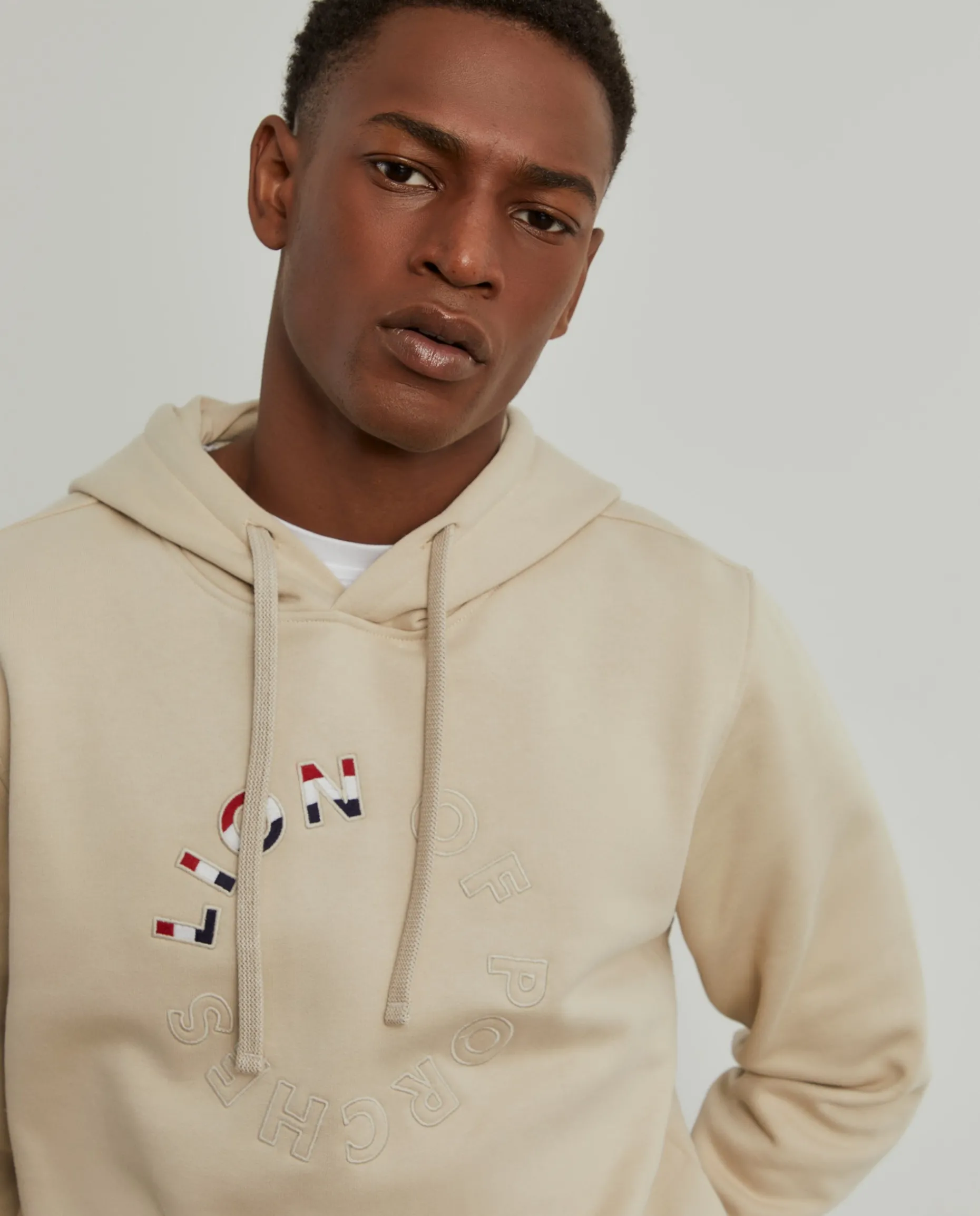Um essencial num guarda-roupa descontraído e confortável, esta sweater de manga comprida tem capuz ajustável e bordado Lion of Porches na frente. A base e punhos são canelados. É confecionada, na totalidade, em algodão.