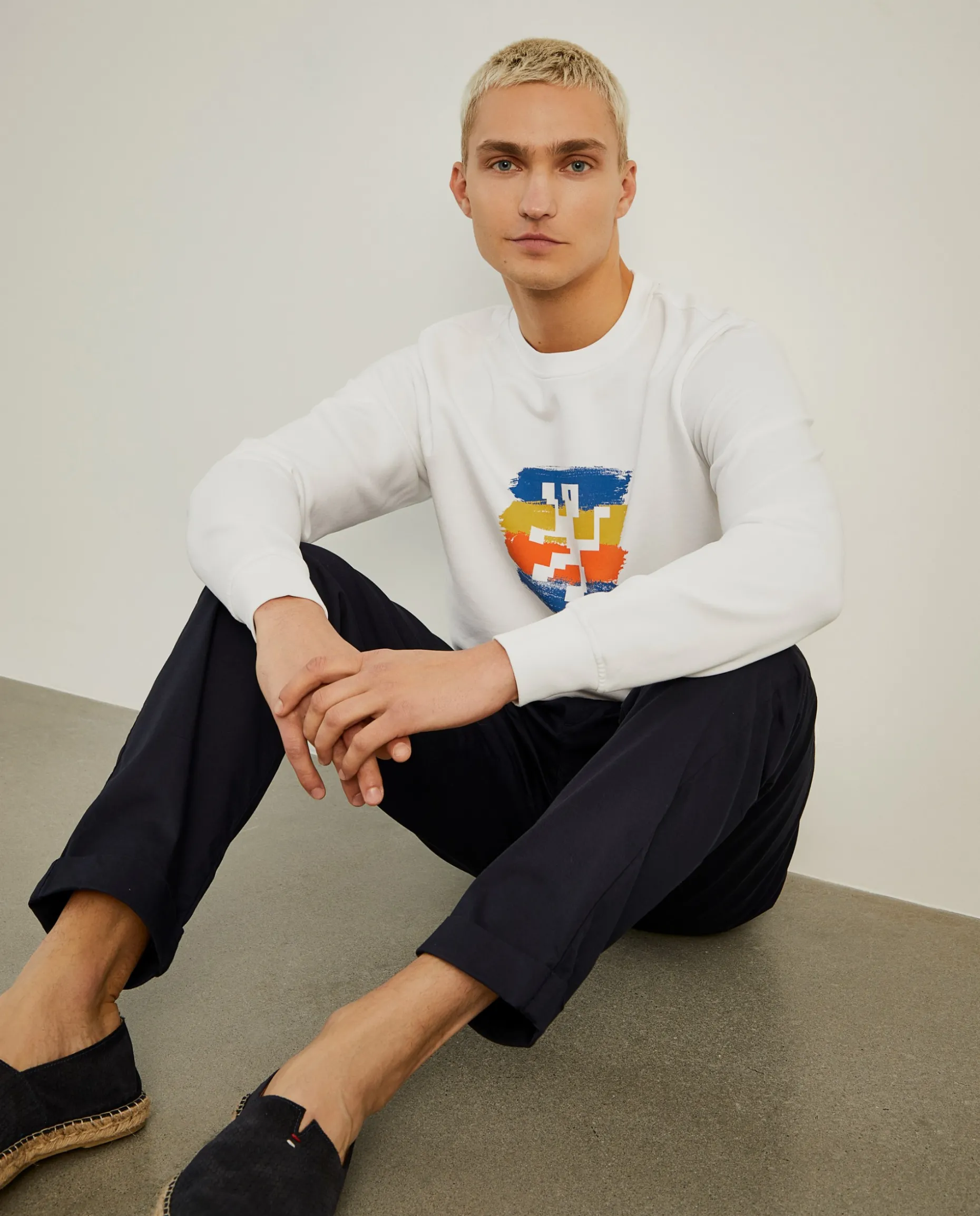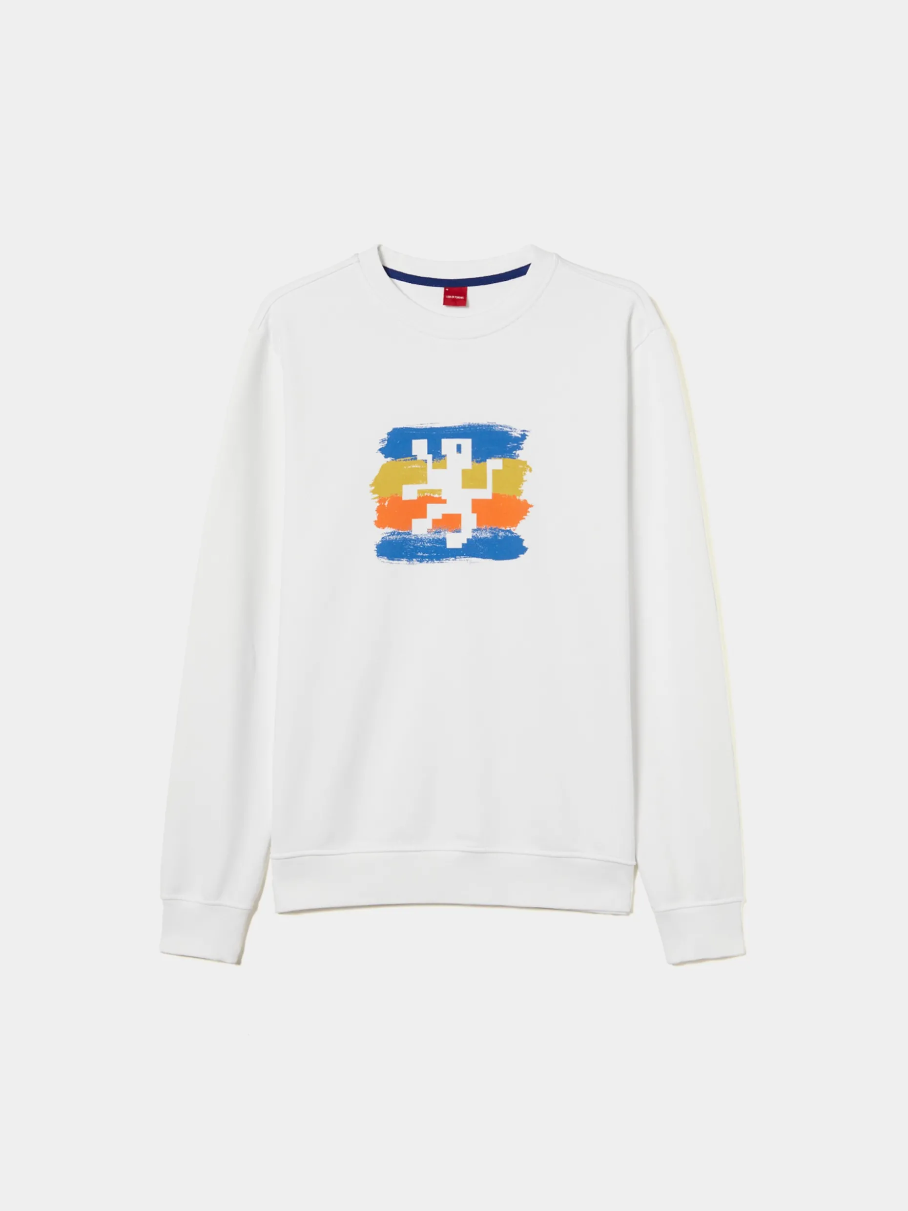 Sweater de manga comprida com decote redondo. De cor lisa, à exceção do grande leão da marca com barras coloridas na frente, em contraste de cor.