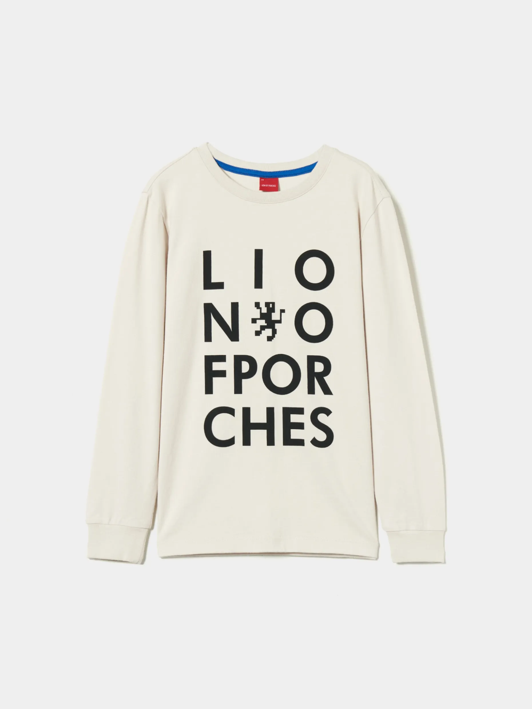Sweater de manga comprida com estampado Lion of Porches em contraste na frente. De decote redondo, finaliza com canelado na gola e nos punhos. Confecionada em algodão para maior conforto. Tapa costuras no interior da gola em contraste.