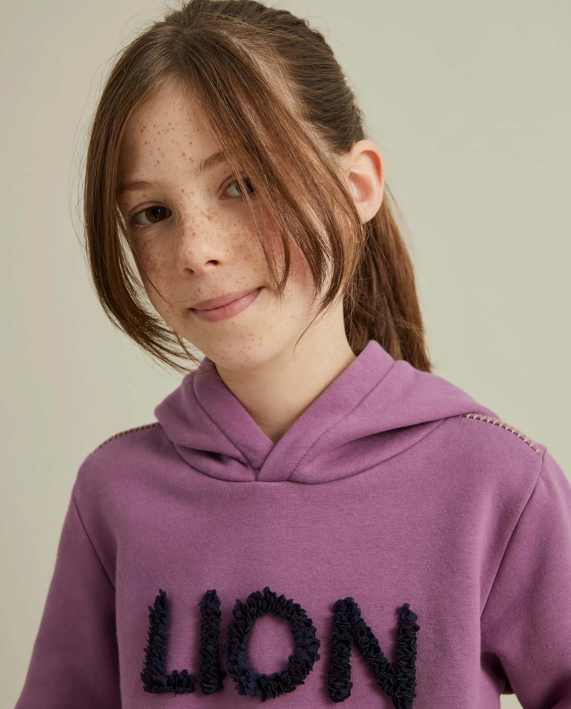 Sweater de manga comprida, mistura de algodão, com aplicação Lion em contraste no peito. Com capuz e pormenor de costura em zig zag nos ombros em contraste de cor. A base e punhos são canelados.