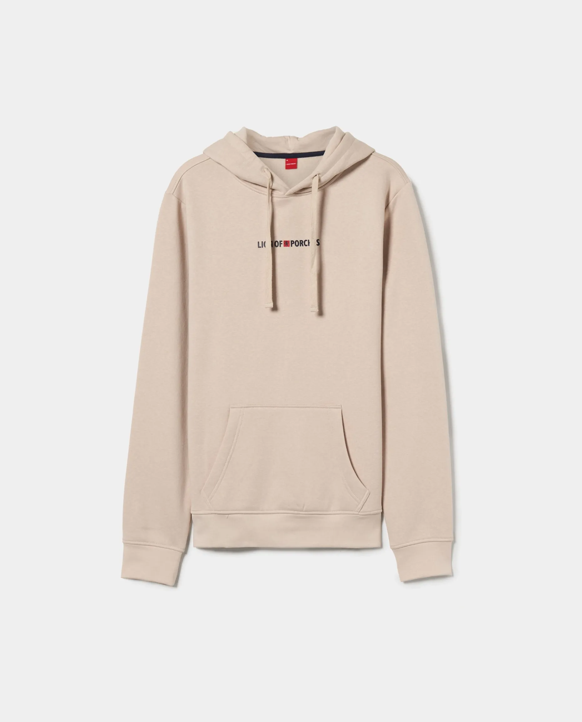 Sweater de manga comprida com capuz para um look casual e confortável. De cor lisa, com estampado Lion of Porches em contraste no peito. O capuz é ajustável. Bolso canguru.