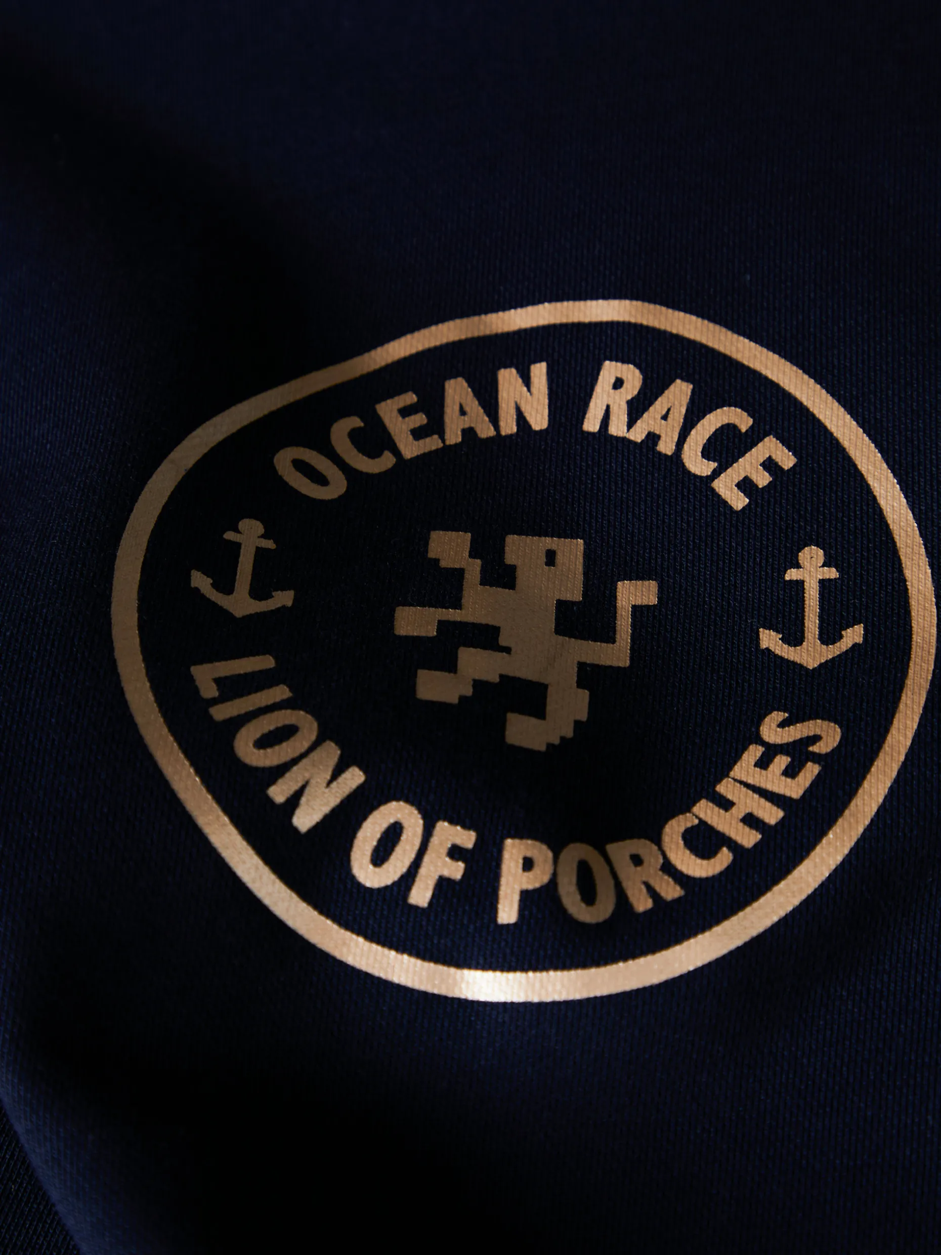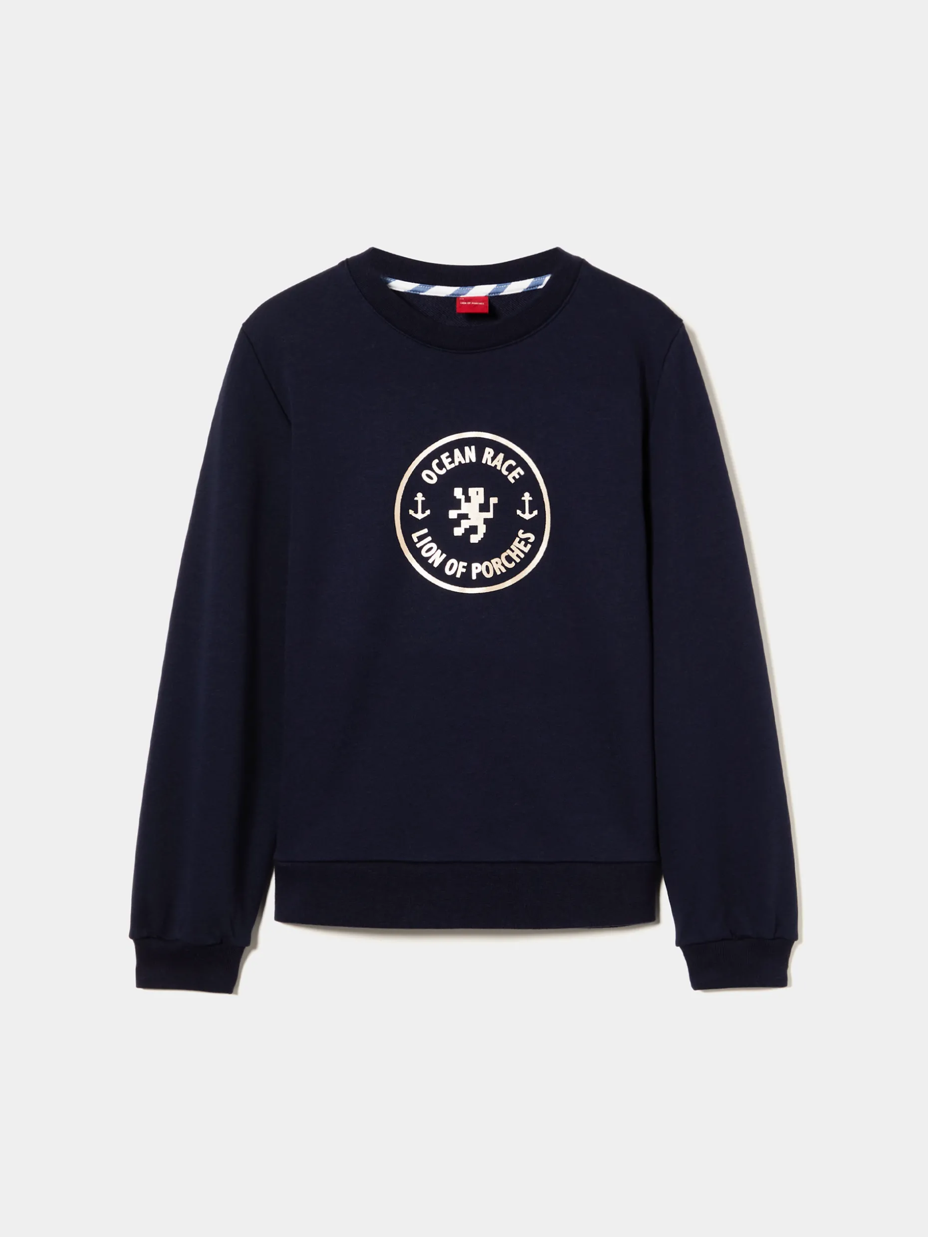 Sweater de manga comprida, com gola redonda, e estampado Lion of Porches em contraste na frente. A base, gola e punhos são canelados. Disponível em várias cores.